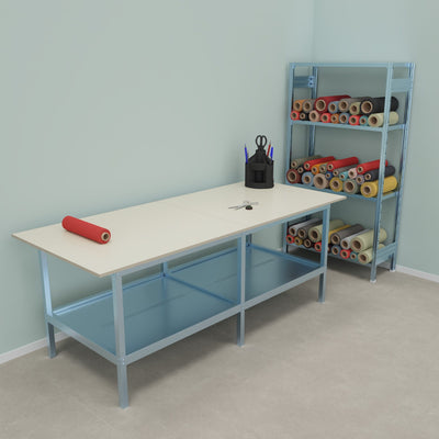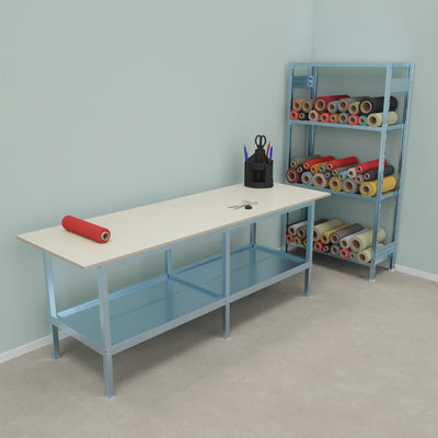 Banco lavoro fisso o su ruote con cassetto metallico e piano inferiore di metallo cm. 280x100x93h