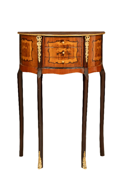 Biscottini Consolle a mezzaluna in legno impiallacciato noce arricchito con particolari intarsi fatti a mano e decori in bronzo