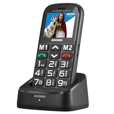 BRONDI AMICO SICURO PLUS (NERO) - TELEFONO CELLULARE PER ANZIANI - TASTO SOS - CONTROLLO REMOTO - ANNUNCIO VOCALE - BASE DI RICARICA