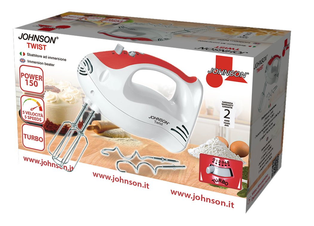 Con TWIST di JOHNSON, amalgamare, miscelare, sbattere e impastare per ottenere deliziosi piatti fatti in casa sarà tutto più facile. Velocizza i tempi di lavoro e rende qualsiasi composto facile da lavorare. La coppia di ganci a spirale in acciaio permette di ottenere un impasto morbido e senza grumi. Le due fruste in acciaio consentono di ottenere una panna montata voluminosa e soffice. La preparazione degli impasti risulta veloce e perfetta anche grazie alla possibilità di scegliere tra 5 velocità.DATI TECNICI:SBATTITORE AD IMMERSIONEPotenza 120-150 W5 velocità + “turbo”2 coppie di fruste in acciaioPulsante espulsione automatica delle frusteColore: rossoAlimentazione 220 – 240V~ 50/60 Hz