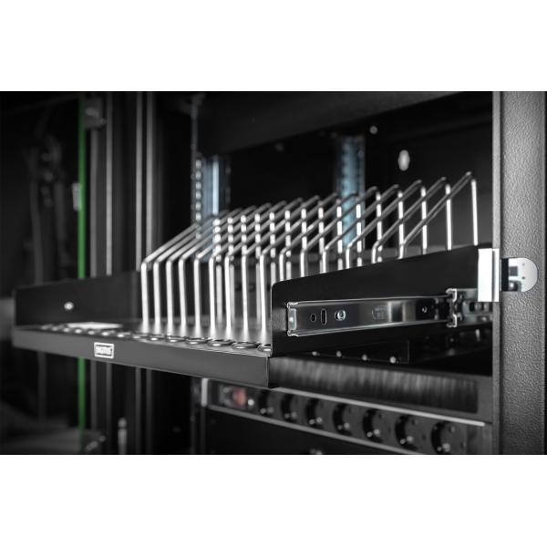 Con questo ripiano speciale puoi utilizzare qualsiasi armadio standard da 482,6 mm (19") per riporre i tuoi dispositivi portatili come tablet PC, notebook o smartphone. Le robuste staffe in acciaio offrono spazio per un massimo di 14 dispositivi. Sulla parte anteriore sono presenti aperture per i cavi in ??modo che i dispositivi possano essere cablati in modo ottimale, ad esempio per collegarli a una fonte di alimentazione per la ricarica. Il fondo è dotato di un ripiano per lunghezze di cavi in ??eccesso. Per un funzionamento intuitivo, il ripiano può essere estratto in avanti una volta installato per accedere rapidamente e facilmente ai componenti collegati. Al livello da 482,6 mm (19"), è necessaria solo un'unità di altezza (1U) per fissare il ripiano. L'altezza completa comprese le staffe metalliche è di 175 mm.
