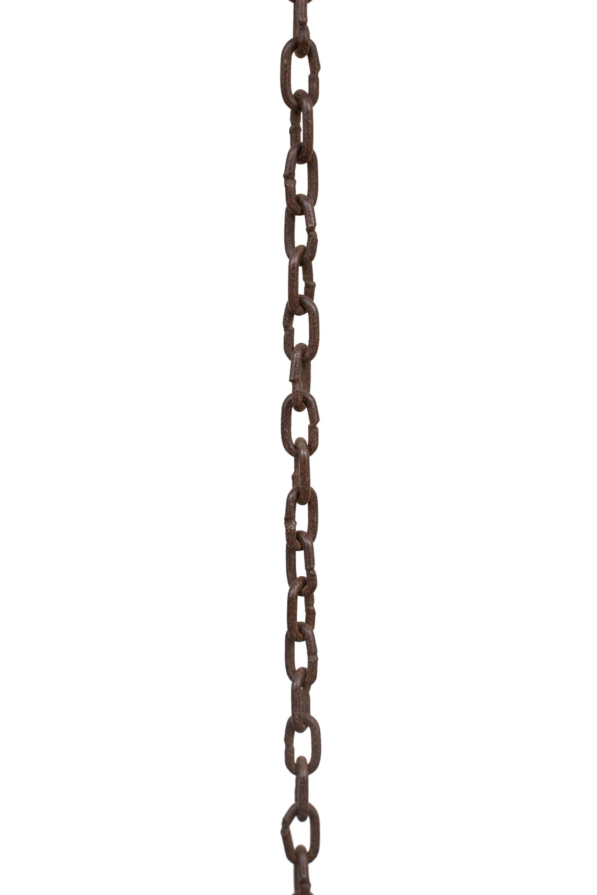 Lampadario a sospensione di dimensioni lunghezza 34 cm, profondità 29 cm, altezza 30 cm, realizzato in ferro. Dal design minimalista e dal fascino retrò accentuato dalla finitura anticata, è ideale per arricchire ambienti arredati in stile Industrial o vintage, da solo o in serie.