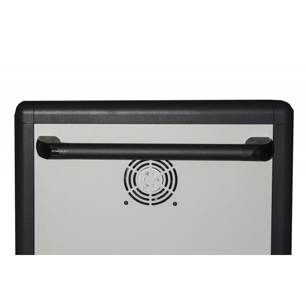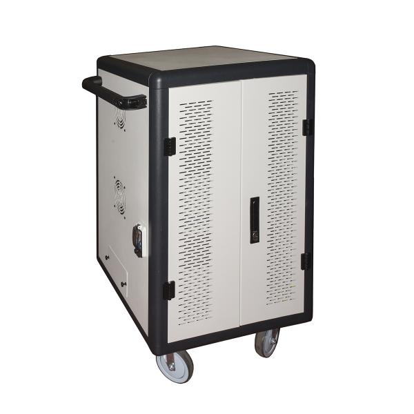Armadio con chiusura a chiave che permette la protezione e l’alimentazione di 30 notebook o tablet custoditi all'interno. Ideale per scuole o uffici, dove si necessiti di un posto sicuro in cui alloggiare dispositivi elettronici, dando la possibilità di ricaricarsi e impedendo il loro surriscaldamento. Con due multiprese posteriori con 15 prese universali italiane/Schuko ciascuna, a cui collegare i cavi e gli adattatori dei dispositivi da ricaricare. I dispositivi si posizionano in verticale sui ripiani, separati da divisori. I cavi di alimentazione per i dispositivi si possono organizzare agganciandoli a delle alette sui ripiani. Ci si possono alloggiare dispositivi di misura massima cm 28 x 30, altezza cm 2,3. I separatori dei ripiani sono removibili, in questo modo si possono alloggiare anche notebook o altri dispostivi più larghi. Con 4 ruote incluse di cui due bloccabili. Con porte traforate con chiusura a chiave, permette la protezione dei dispositivi contenuti mentre si ricaricano. Con due ripiani con 15 alloggiamenti per notebook o tablet ognuno. Con maniglia per facilitare lo spostamento del carrello di ricarica. L'armadio è in acciaio, colore bianco e bordi arrotondati in plastica neri, si adatta all’arredamento di tutti gli ambienti, con porte traforate, assicura la protezione dei dispositivi interni, e ne permette l'areazione grazie alla porta grigliata e alle quattro ventole di raffreddamento incluse (due per lato). La porta anteriore e posteriore hanno la chiusura a chiave. Cavo di alimentazione incluso con spina italiana 16A Lunghezza metri 2,5. Durante gli spostamenti dell’armadio il cavo si può alloggiare nell’apposito vano. Con alimentatore incluso AC200/110V con funzione di protezione contro sovraccarichi.