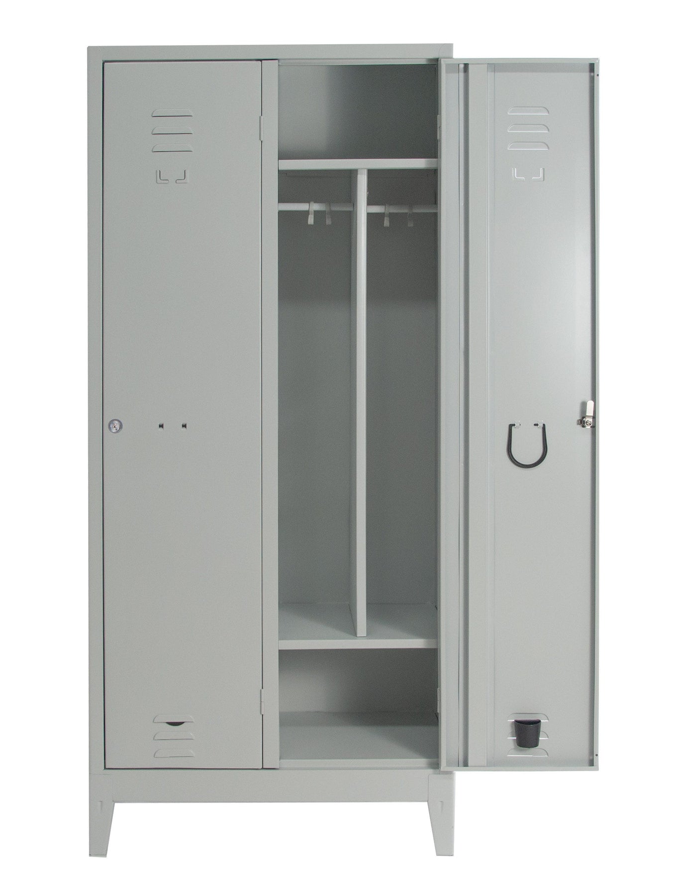 Nome: armadio spogliatoio in metallo Dotazioni di serie: n° 1 armadio spogliatoio Caratteristiche del prodotto: - armadio spogliatoio con bordi arrotondati- verniciatura in polvere epossipoliestere ai raggi UV- n° 2 ante battenti rinforzate con feritoie di aerazione superiori ed inferiori- porta cartellino stampato su anta- serratura a chiave- n° 1 piano fisso superiore ed inferiore in lamiera con divisorio sporco/pulito centrale fisso in lamiera in ciascun vano- bacchetta tubolare bianca- kit portaombrelli composto da anello e vaschetta raccogli gocce tutto in plastica neraDimensioni esterne (LXPXH) cm.: 77/97x50x180h Colore: corpo grigio RAL 7035; ante a scelta dal menù a tendina Installazione: monoblocco Conformità: dichiarazione di conformità D.Lgs.81/2008 e DGRV REGEL 108-007 Tempi di approntamento: colore grigio affidato al corriere in 2-4 giorni lavorativi; per altri colori occorrono circa 10-15 giorni lavorativi Tempi di consegna del corriere: 2-5 gg. lavorativi / 7 gg. lavorativi per Isole dall'affidamento al corriere Destinazione d’uso: interno, centri commerciali, alberghi - in ambienti NON UMIDI Informazioni utili: imballo con cassa di legno antiurto, il quale garantisce sicurezza nel trasportoDettagli aggiuntivi o richieste dovranno essere inserite nelle NOTE dell’ordine o inviate ad info@castellanishop.it PER ACQUISTARE LE PANCHE SPOGLIATOIO CLICCARE QUI