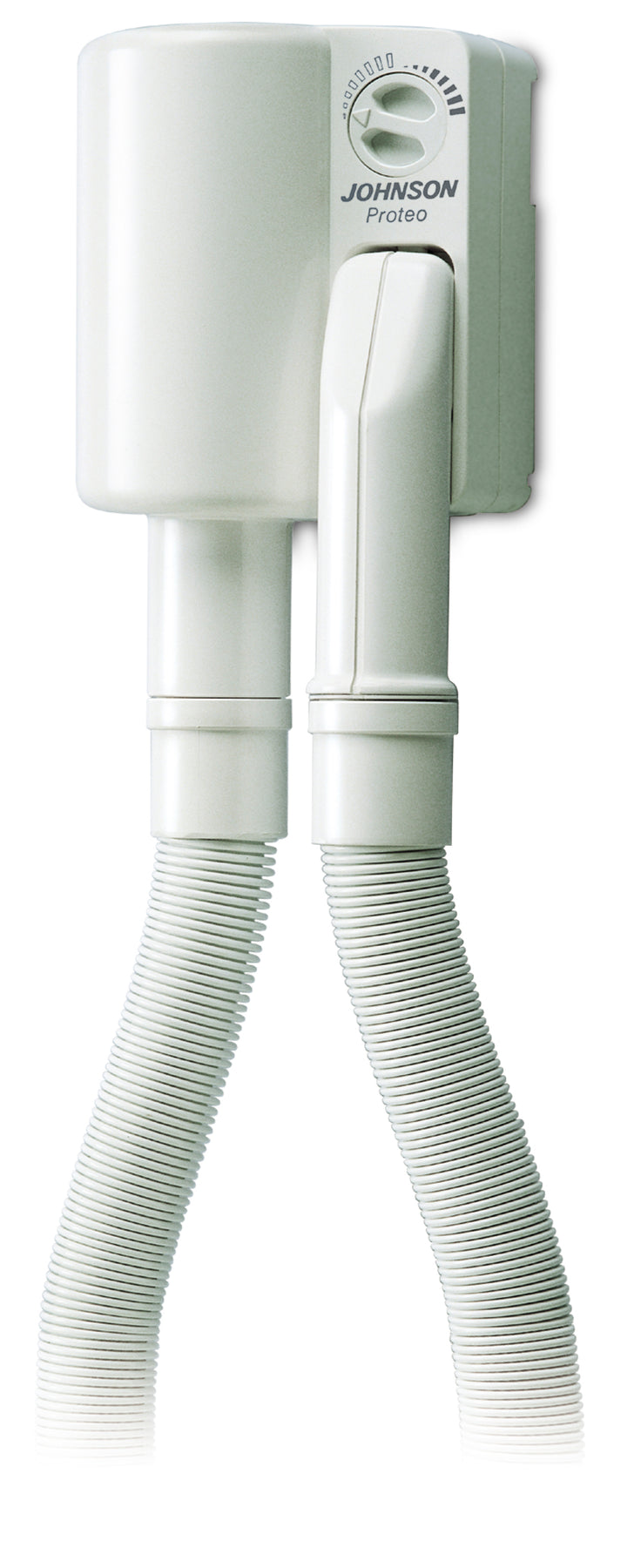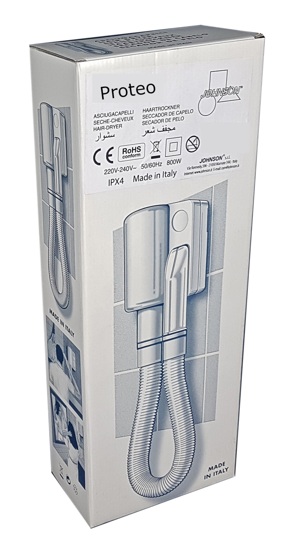 Proteo è un asciugacapelli murale a tubo di Johnson Elettrodomestici. Design compatto e dimensioni ridotte lo rendono adattabile anche a piccoli ambienti e spazi ridotti, sia in casa che in bagni di hotel e comunità.Accensione automatica a sganciamento impugnaturaSupporto con speciale aggancio di sicurezzaBocchetta uscita aria 'cool-touch' girevole2 possibilità di allacciamento a rete: diretto a cavo di rete che esce dal muro oppure alla presa tramite cavo con spinaCommutazione relativa a 5 posizioni per programmare 2 velocità e 3 temperatureDimensioni: 13 x 9 x 61 cm (L x P x H)Dimensioni tubo flessibile estensibile da 40 a 90 cm circaCavo elettrico: 130 cmMotore ACLivello di rumorosità: 75,06 dBPortata d'aria: 58Mc/hGrado di protezione IPX4Potenza: 800 WattAlimentazione: 220-240V - 50/60 HzProdotto Made in Italy