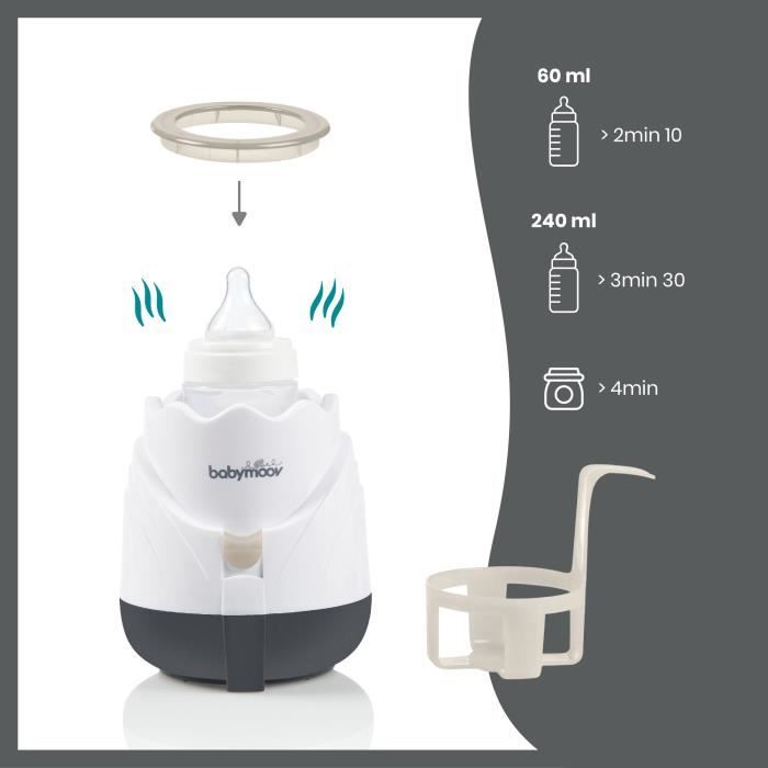 Anello di adattamento (per bottiglie e vasetti) - Griglia isolante sulla piastra riscaldante per riscaldare tutti i materiali della bottiglia, compreso il silicone - Dosaggio graduato incluso - Spegnimento automatico, allarme visivo - 3 min 30 per una bottiglia