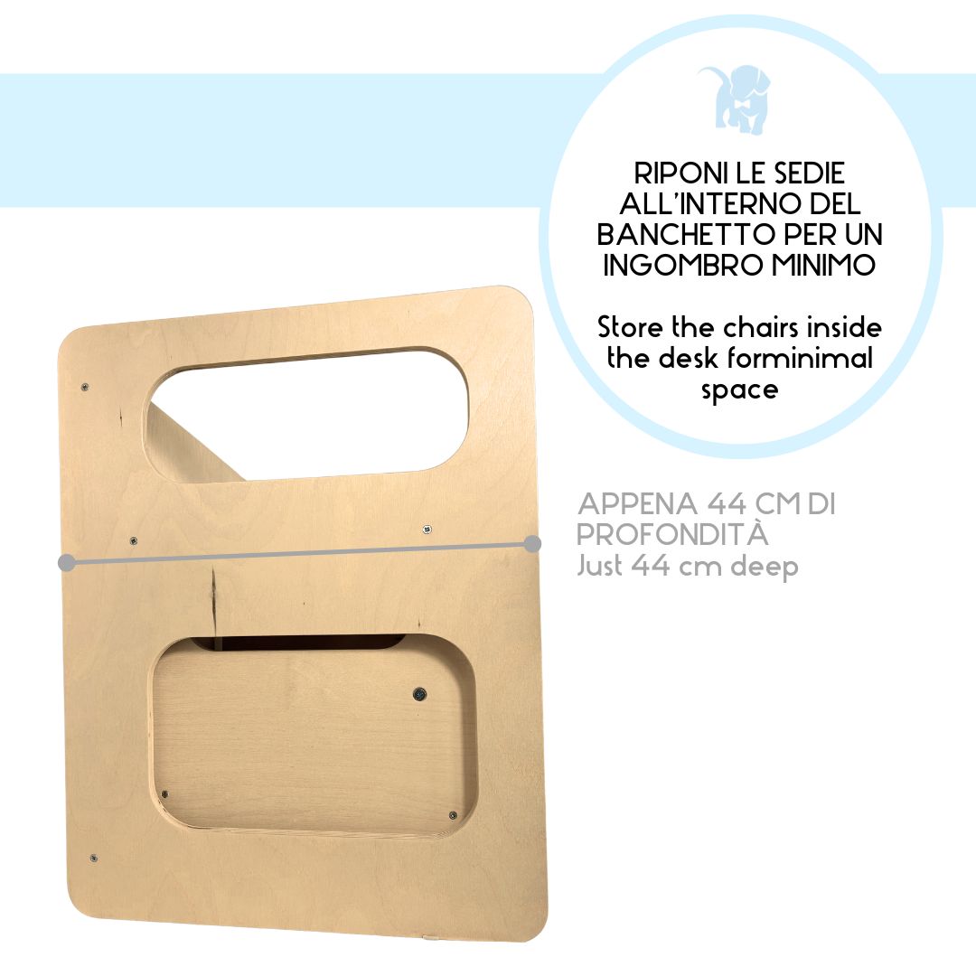 Set Banchetto/Panca + 2 Sedie Montessori SCOOBYDOO: l’autonomia che cresce con il tuo bambinoIl Set Banchetto/Panca + 2 Sedie Montessori è stato progettato per favorire l’indipendenza del bambino e stimolare la sua creatività in un ambiente su misura. Questo set versatile è perfetto per disegnare, leggere, fare piccoli compiti o semplicemente giocare, offrendo uno spazio confortevole dove il bambino può esercitare le proprie abilità motorie e cognitive in completa autonomia.Il design ergonomico del set consente al bambino di sedersi e alzarsi senza l’aiuto degli adulti, grazie a dimensioni studiate appositamente per la sua altezza. La sedia ha un’altezza di seduta di 21,5 e prevede un comodo cassetto all’interno del quale riporre disegni, pastelli e giochi, garantendo comfort e praticità.Un kit pratico e salvaspazioUno dei principali vantaggi di questo set è il suo design salvaspazio. Quando non è in uso, le sedie possono essere facilmente riposte sotto il banchetto, mantenendo l’ordine nella stanza. Questa caratteristica rende il set SCOOBYDOO perfetto per chi ha spazi limitati o per chi desidera un arredamento funzionale e organizzato.Il vantaggio della multifunzionalitàIl banchetto può essere facilmente capovolto ed essere utilizzato come panca, sempre per due bambini. L’altezza della seduta è sempre di 21,5 cm. Un kit perfetto per essere utilizzato anche all’interno di scuole materne, asili nido, ludoteche.Facile da spostare e regolareIl set è stato realizzato pensando anche alla mobilità: le fessure laterali, sia sul banchetto che sulle sedie, li rendono facili da spostare, permettendo ai genitori di cambiare la disposizione senza fatica. Questo lo rende adatto sia per l’uso domestico che per ambienti scolastici, dove potrebbe essere necessario un riposizionamento frequente.Materiali sicuri e naturaliRealizzato interamente in legno di betulla naturale, il set SCOOBYDOO garantisce resistenza e durata nel tempo, oltre a essere ecologico e sicuro per i bambini. Il legno, levigato e senza schegge, rende il prodotto sicuro anche per i più piccoli, mentre il design con bordi arrotondati assicura che non ci siano angoli pericolosi. Essendo 100% Made in Italy, rappresenta un prodotto di alta qualità artigianale.Un ambiente ideale per lo sviluppo del bambinoGrazie a questo set montessoriano, il tuo bambino potrà sviluppare autonomia e fiducia in se stesso in un ambiente pensato appositamente per lui. La filosofia Montessori promuove l’apprendimento indipendente attraverso l’interazione con l’ambiente, e il set SCOOBYDOO è perfetto per soddisfare queste esigenze, fornendo uno spazio dove il bambino può esplorare, creare e crescere.Dimensioni Banchetto: altezza 56 cm, larghezza 82 cm, profondità 44 cmArea Banchetto: larghezza 79 cm, profondità 35 cmDimensioni Sedia: altezza 34 cm, larghezza 34 cm, profondità 34 cmAltezza seduta: 21,5 cmMateriale: legno di betullaColore: legno