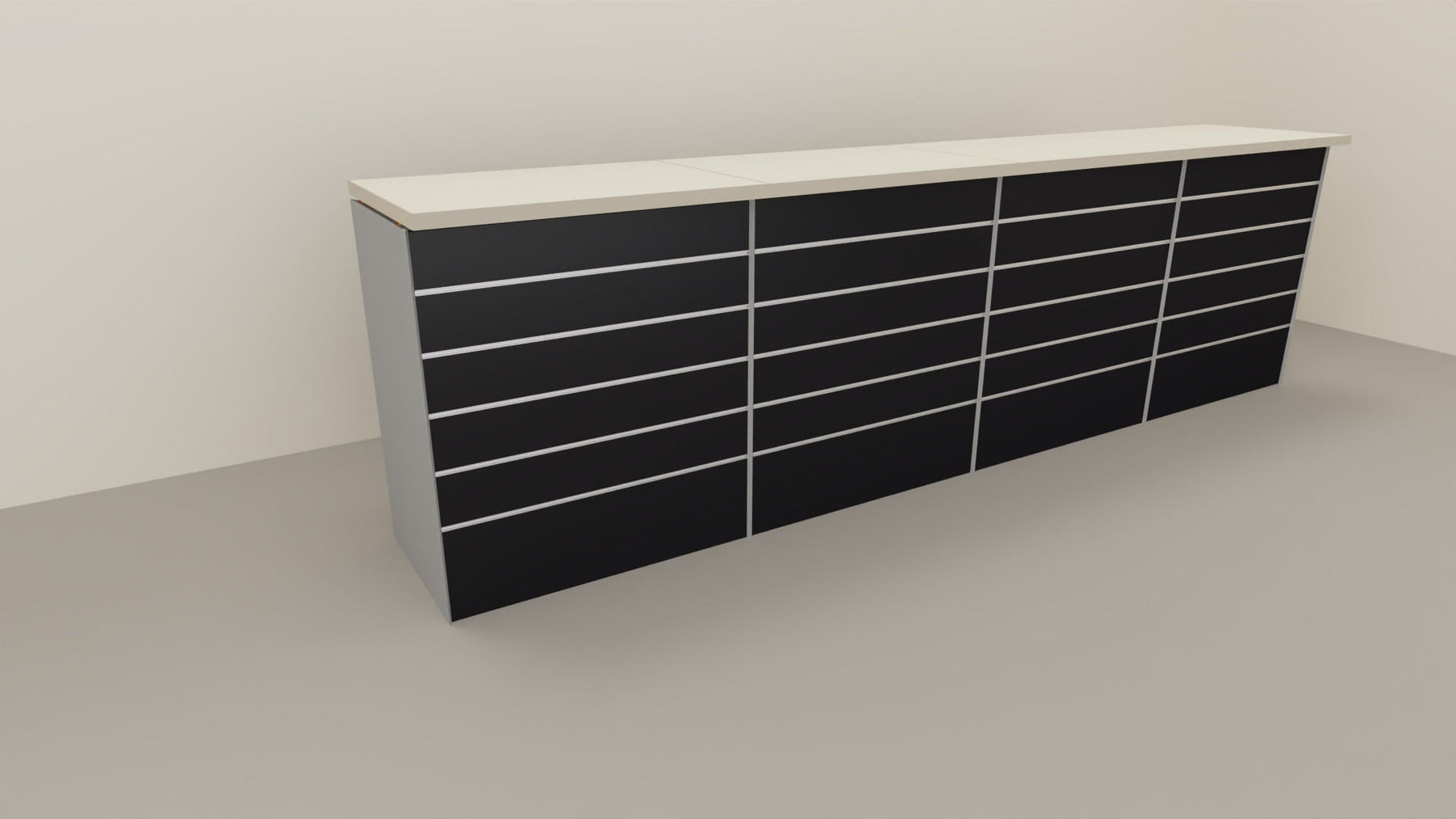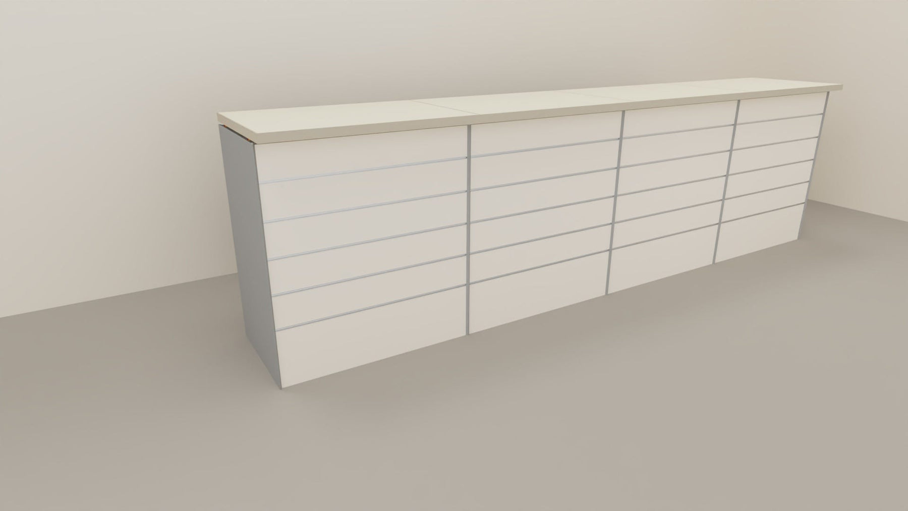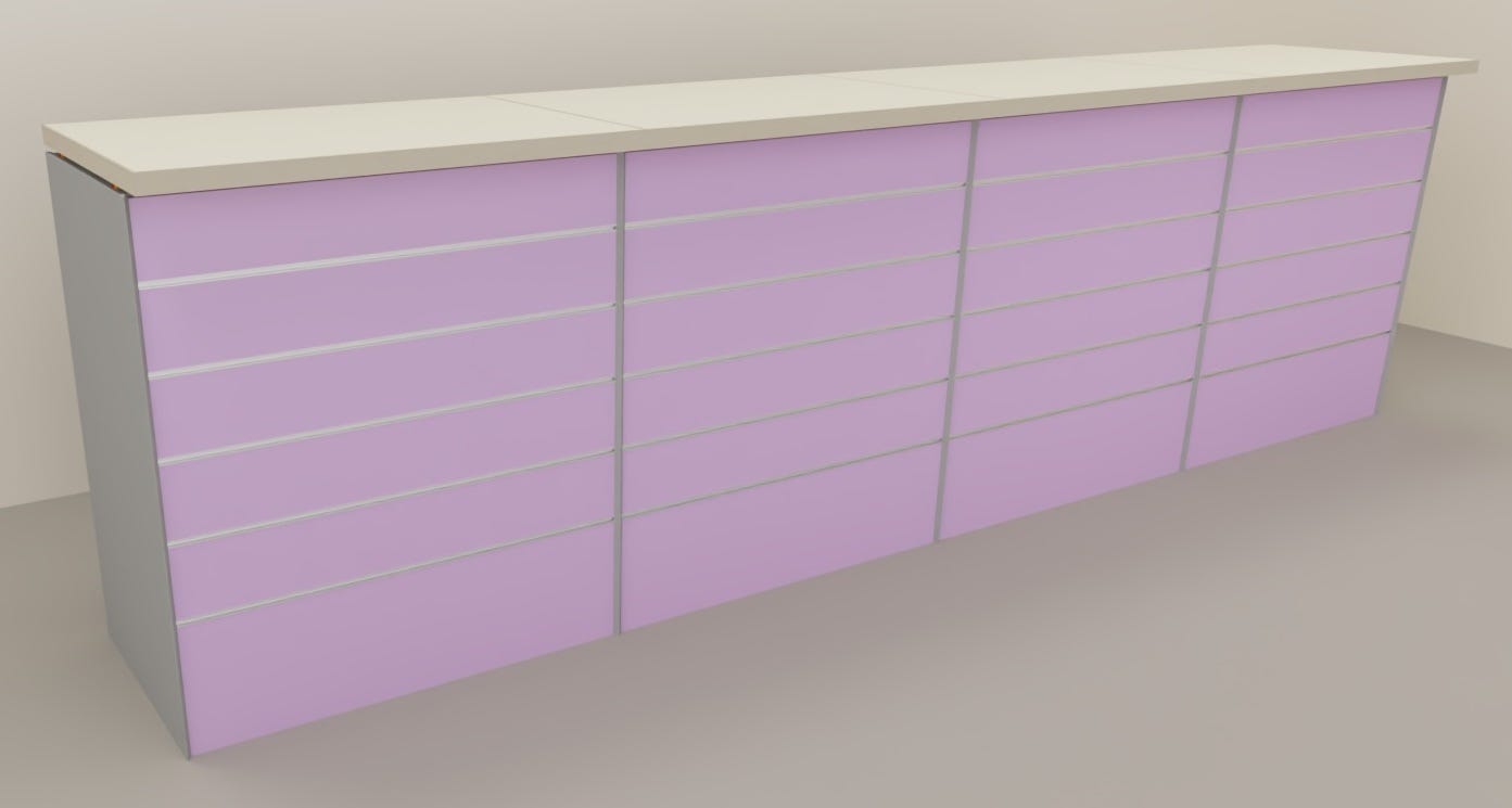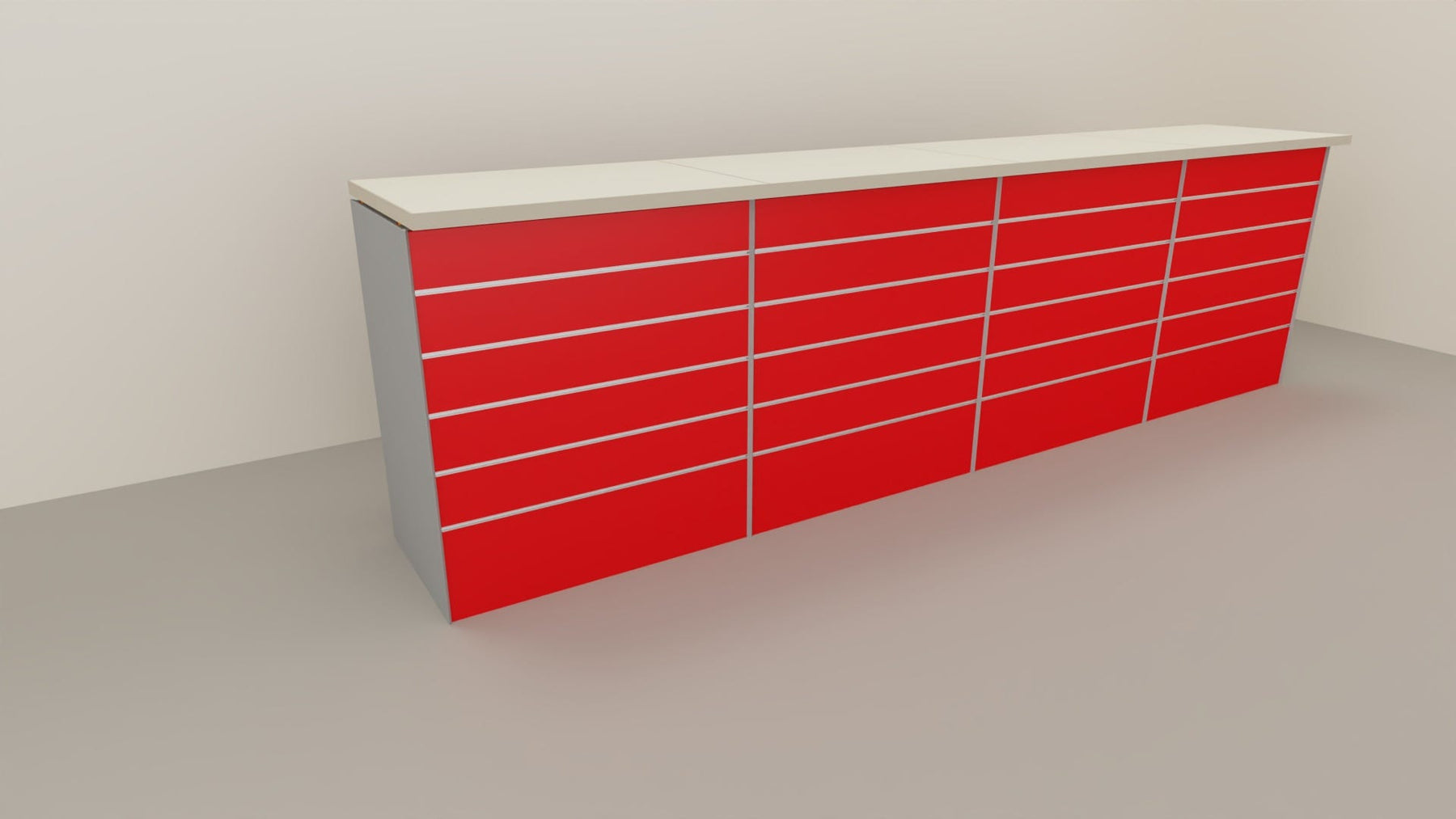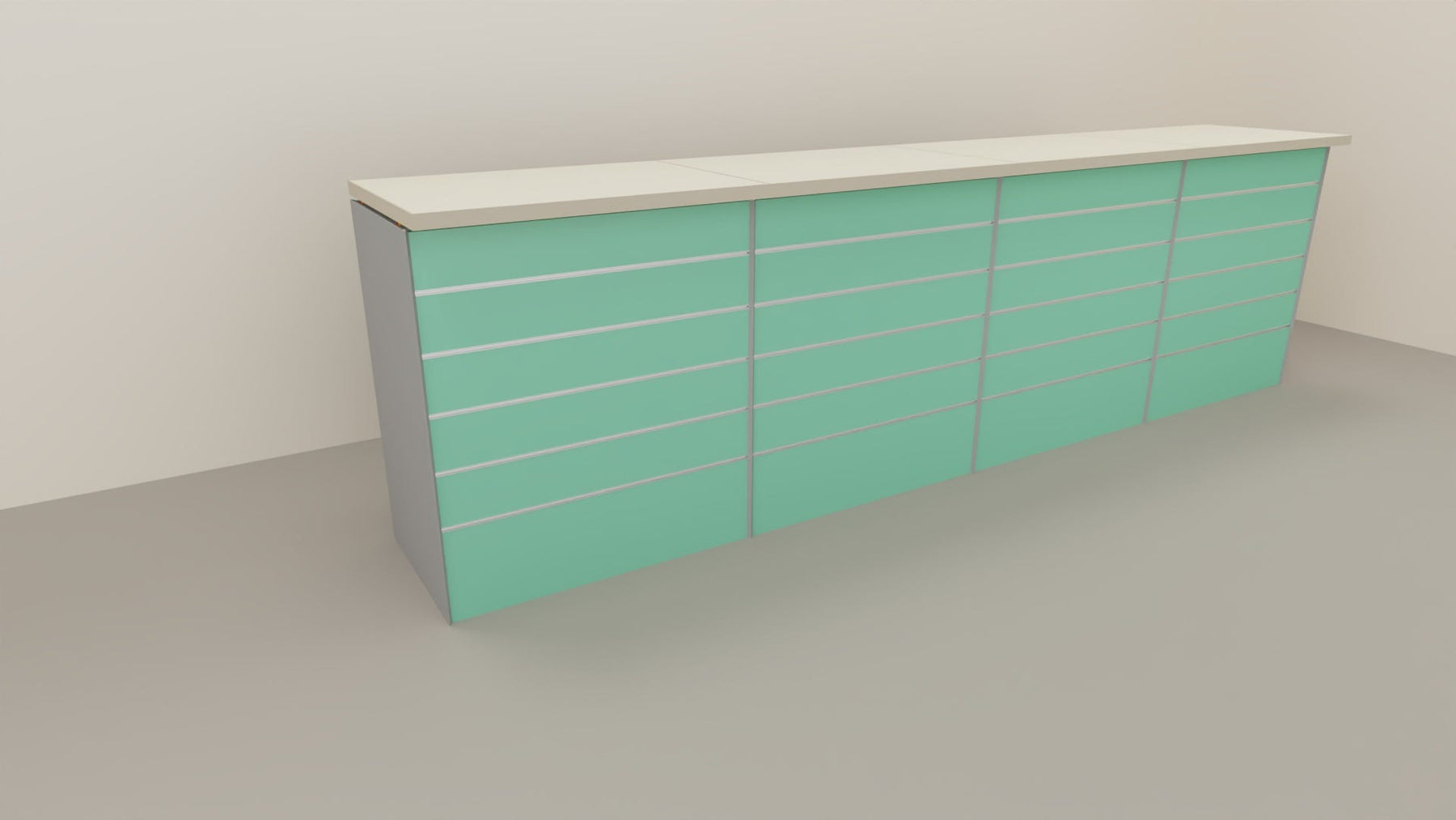 Banco cassa espositivo da negozio con pannello dogato cm. 368x64x106h