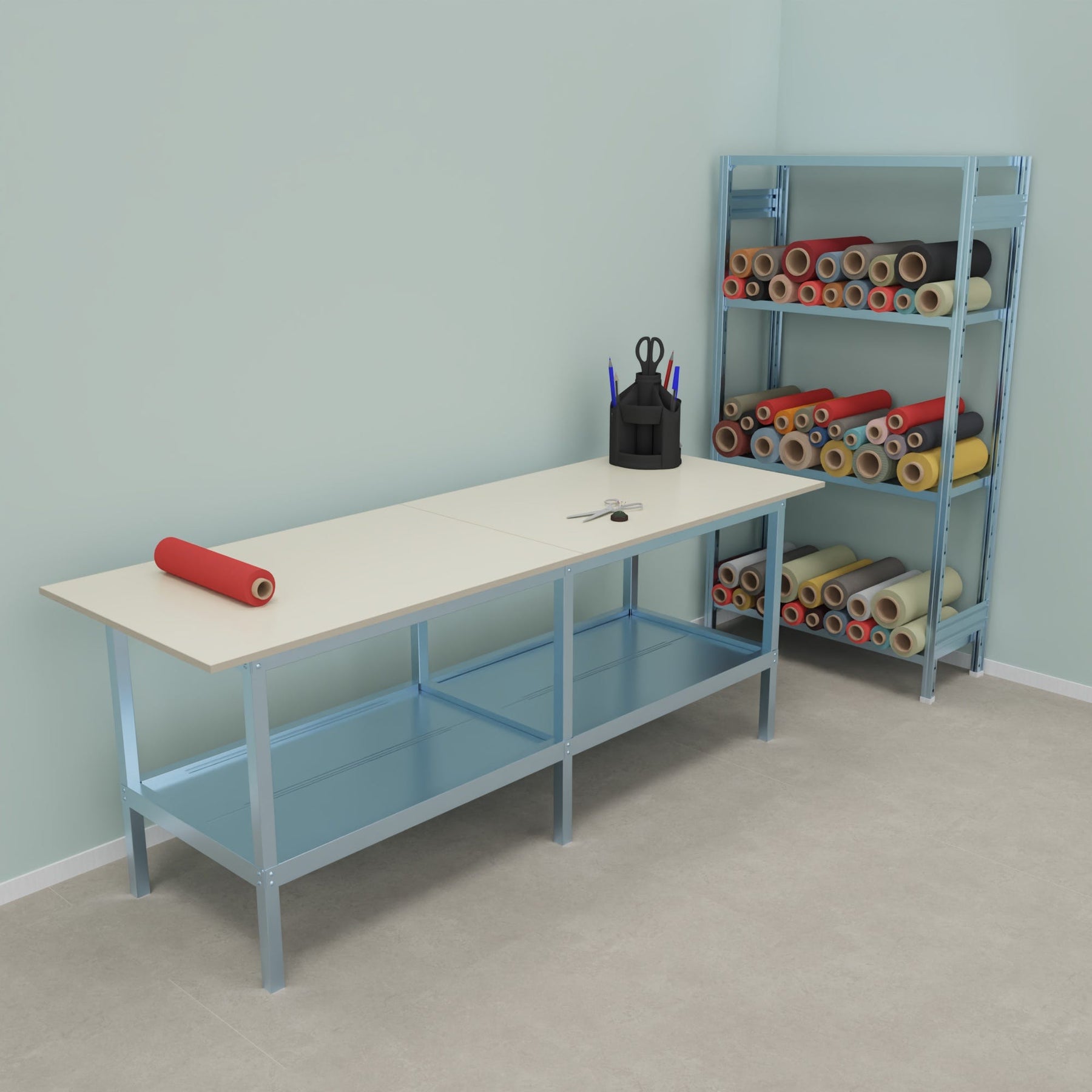 Banco lavoro in metallo e legno con accessori e piano inferiore metallico cm. 240x80x93h