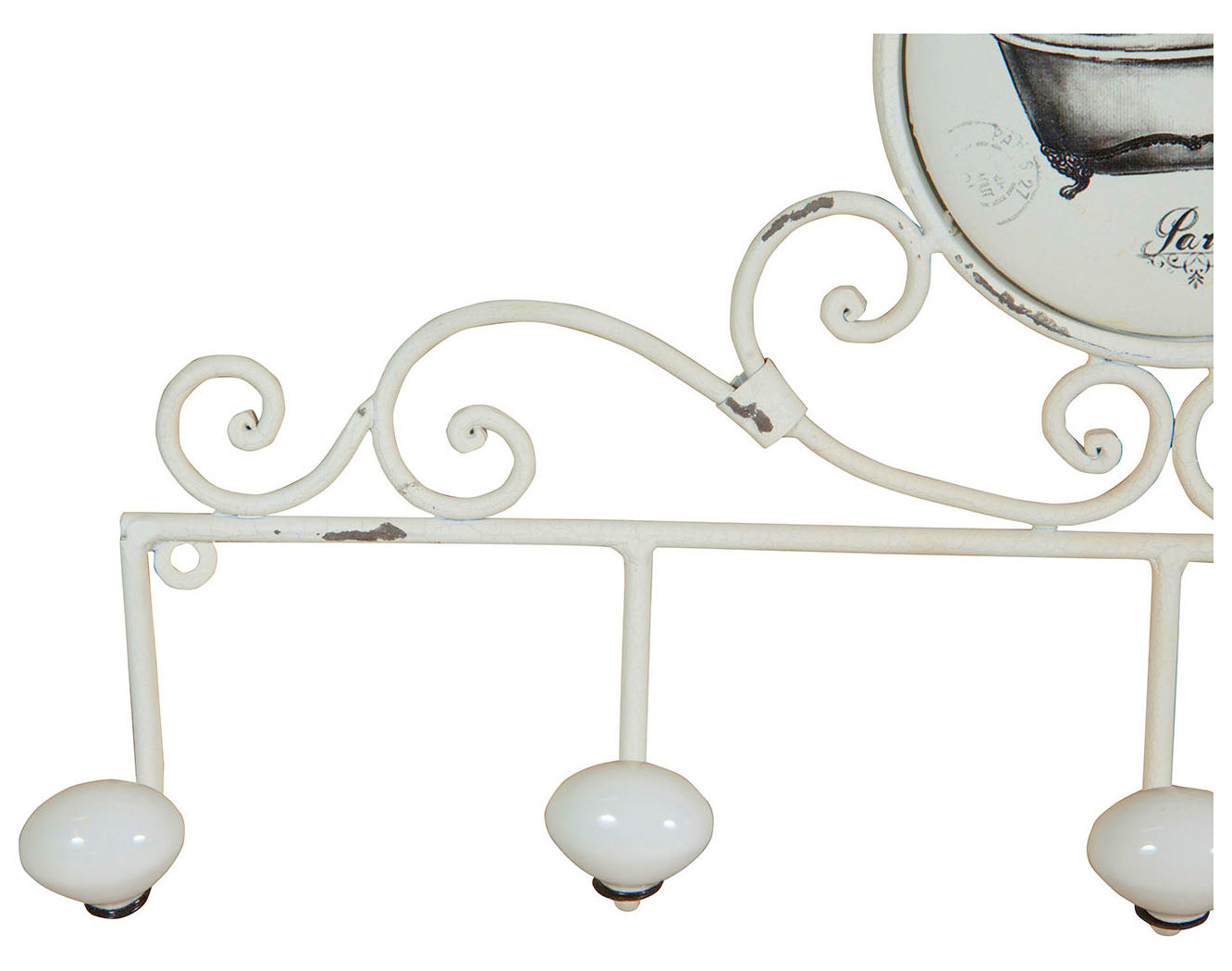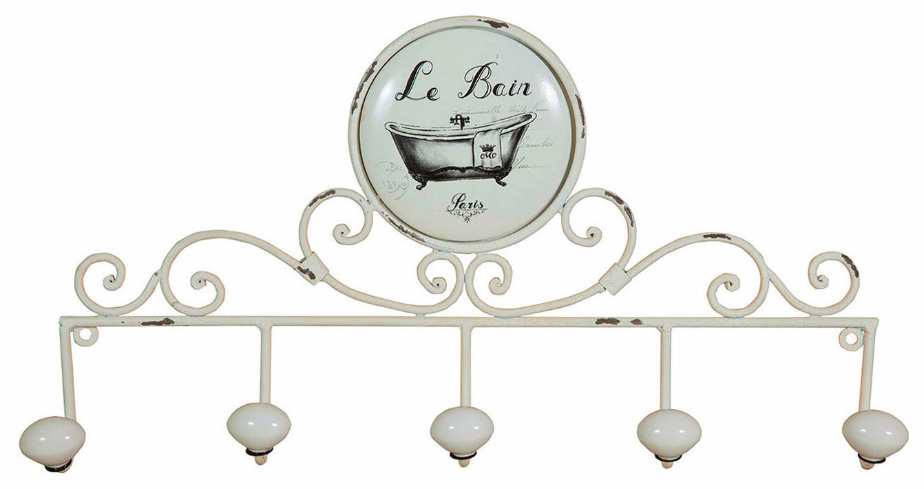 Appendino 48x6x26 cm con 5 pomelli in porcellana realizzato in ferro battuto con placca in porcellana decorata "Le Bain".