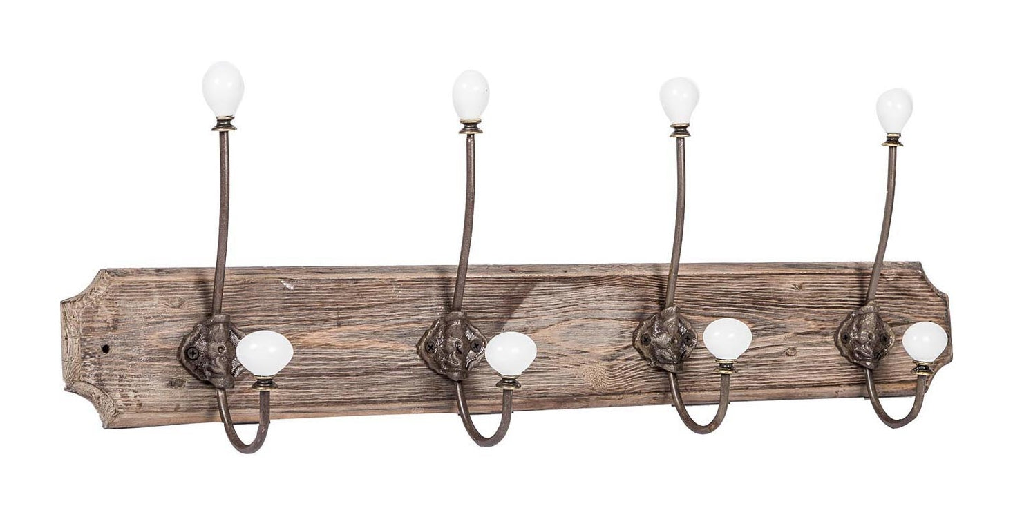 Attaccapanni da appendere 65x10x21 cm realizzato in legno massiccio con 4 ganci in ferro forgiati a mano e pomelli in porcellana. Si abbina con semplicità e funzionalità a qualsiasi ambiente.