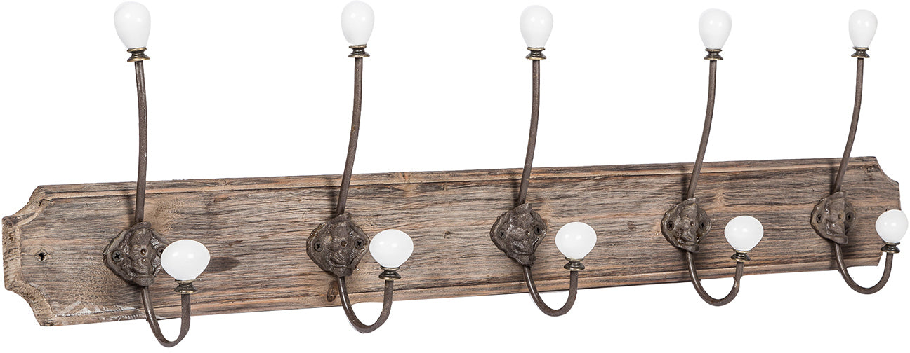 Attaccapanni da appendere 80x10x21 cm realizzato in legno massiccio con 5 ganci in ferro forgiati a mano e pomelli in porcellana. Si abbina con semplicità e funzionalità a qualsiasi ambiente.