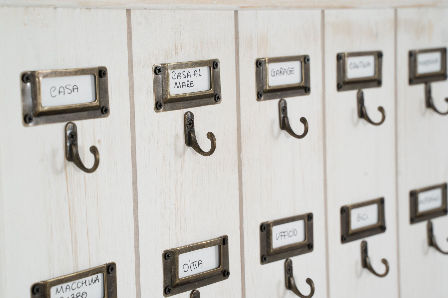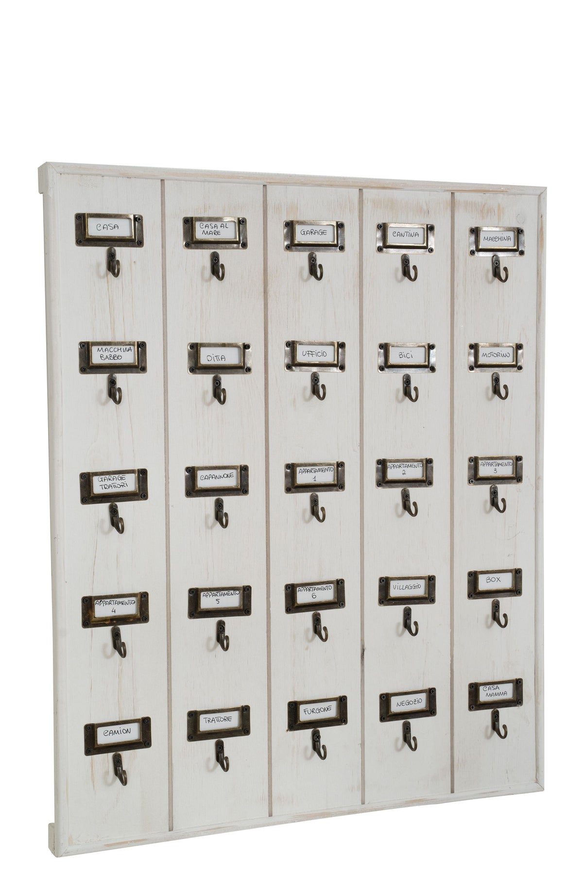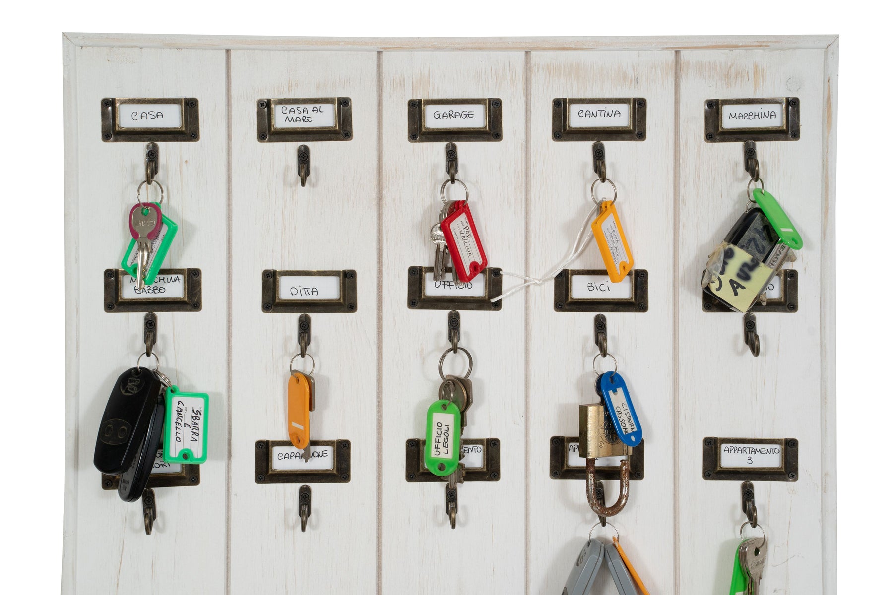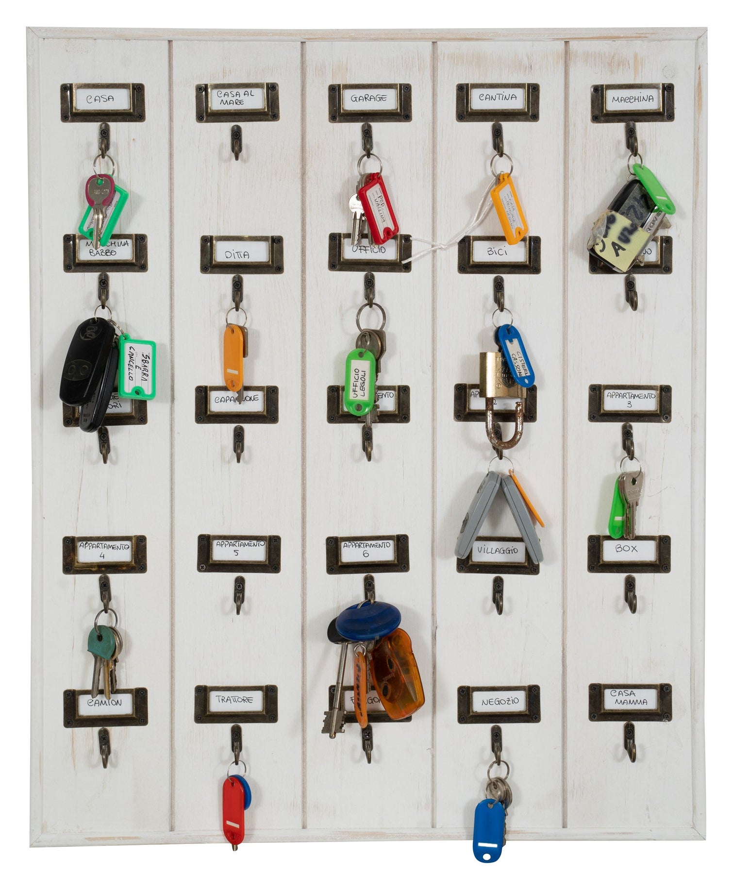 Bacheca appendichiavi L49,5xPR4xH60 cm realizzata in legno bianco decapato. Dotata di 25 gancetti in ottone con relativo porta etichette, grazie al suo design e alla finitura effetto retrò, si abbina alla perfezione con funzionalità a qualsiasi ambiente non solo domestico ma anche ed in particolare per strutture ricettizie.