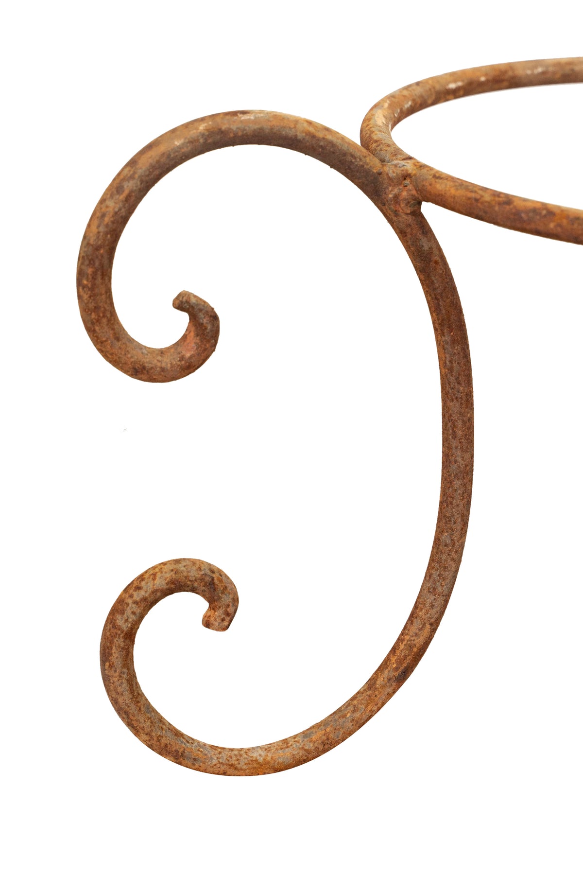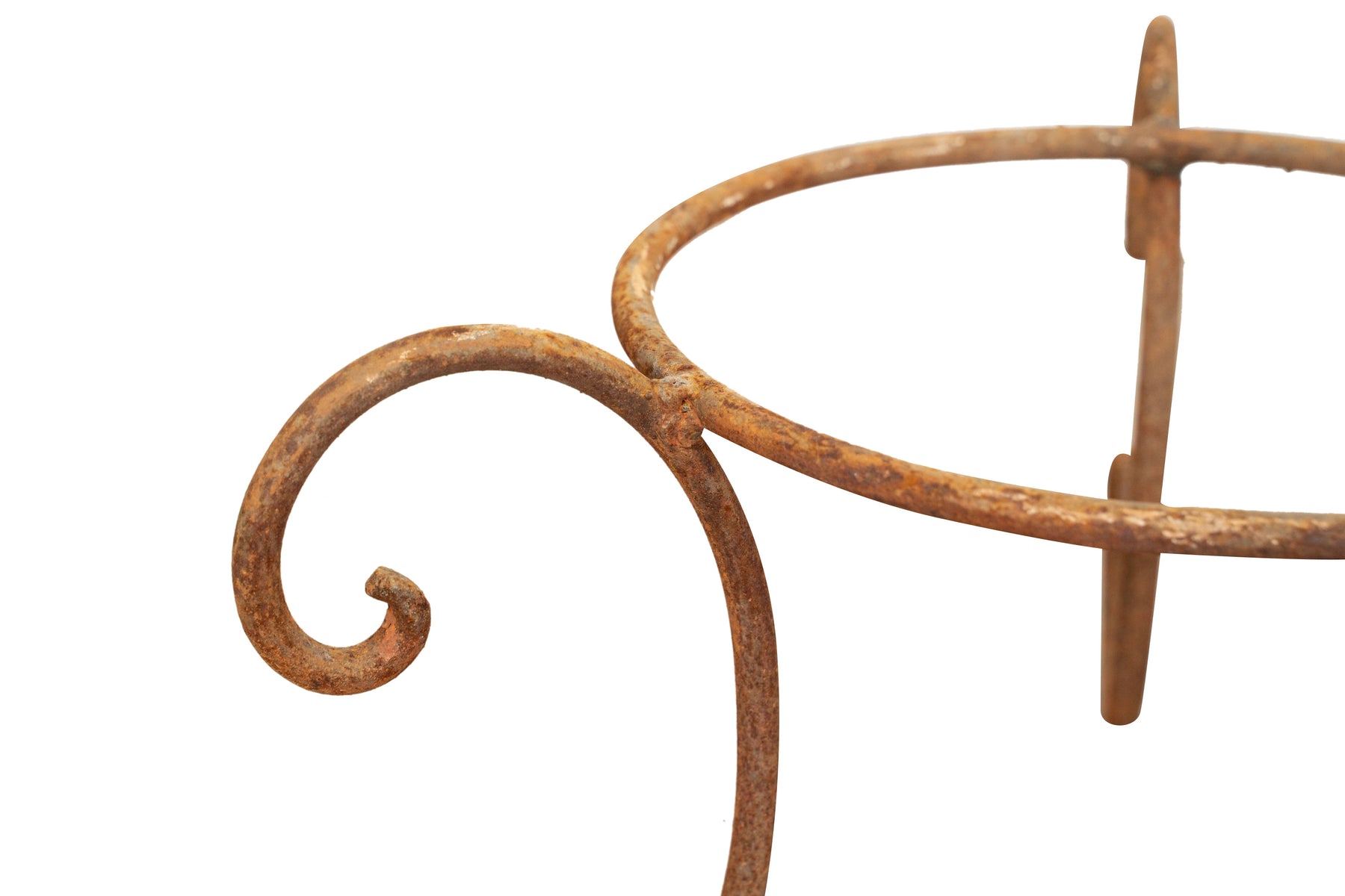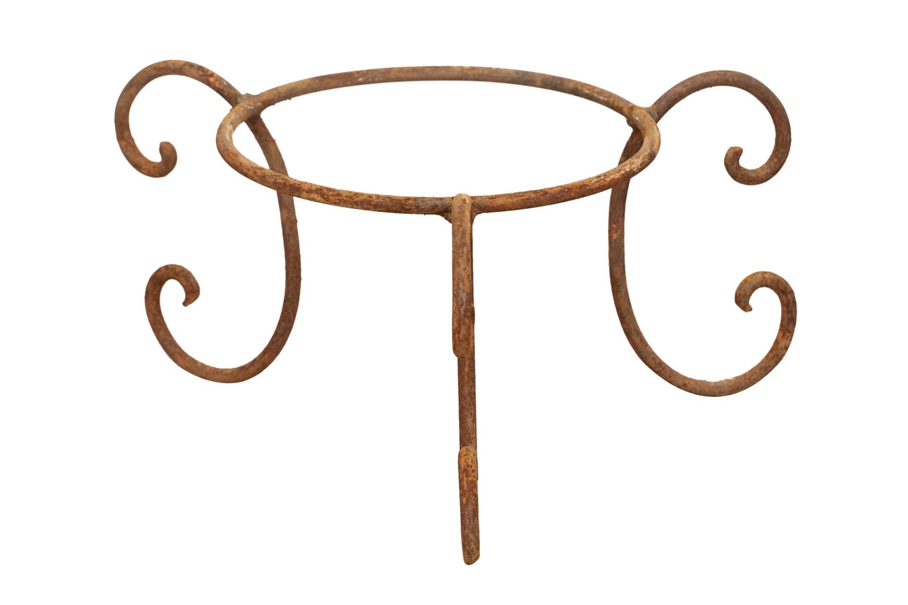 Base portavasi in ferro pieno forgiato a mano finitura naturale di dimensioni larghezza 38 cm, profondità 38 cm, altezza 20 cm. Il diametro interno del cerchio di supporto è di 22.5 cm. Struttura molto robusta, versatile ed ideale come sostegno per vasi terracotta, pietra ecc.., utilizzabili sia all'interno che all'esterno.