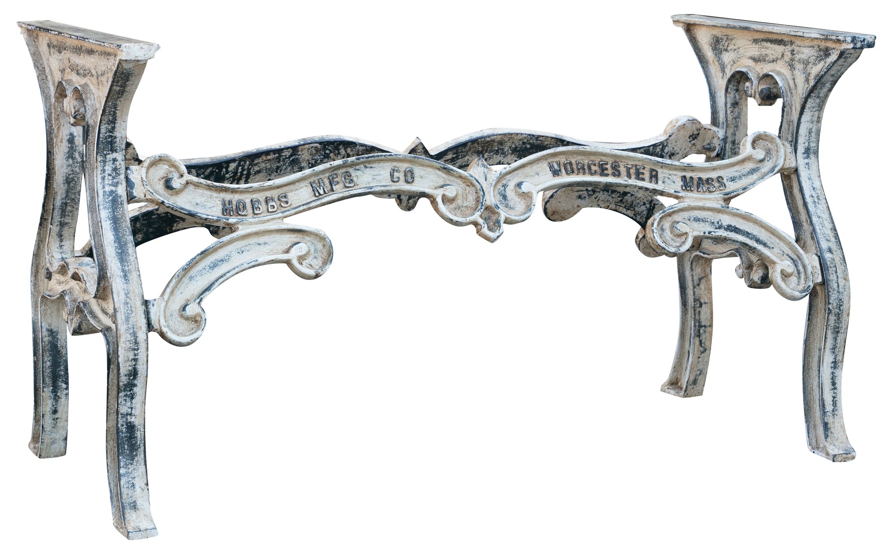 La base in ghisa, struttura portante di notevoli dimensioni, può supportare piani in pietra e marmo di grandi dimensioni, anche molto pesanti. La base è una copia fedele di un banco da lavoro di una vetreria inglese, chiusa nel 1860.