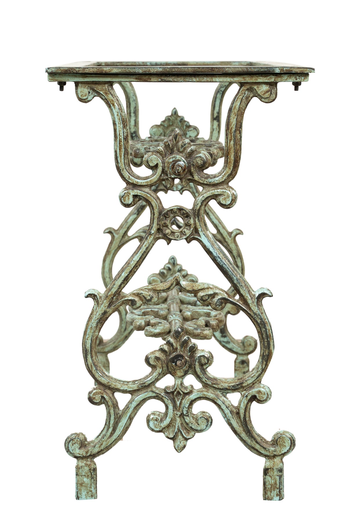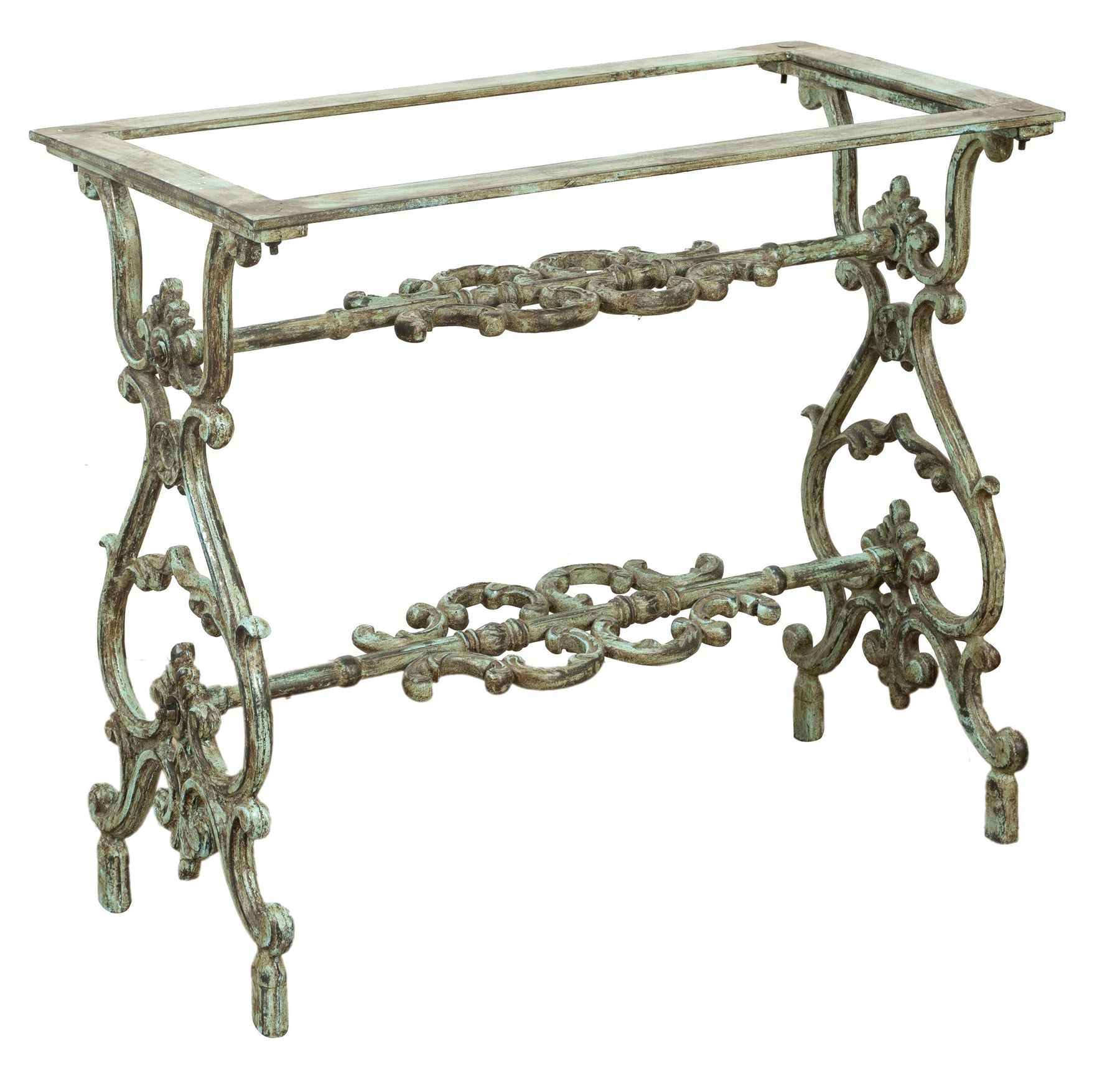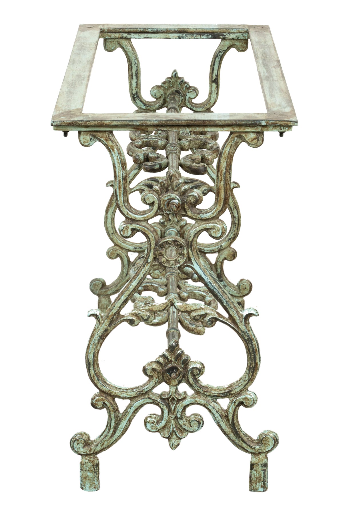 Molto stabile, robusta e pesante base per tavolo in ghisa di dimensioni larghezza 86 cm, profondità 43 cm, altezza 72 cm completamente fatta a mano, con un'accurata finitura completamente realizzata a mano, ottenendo un vero effetto antico.