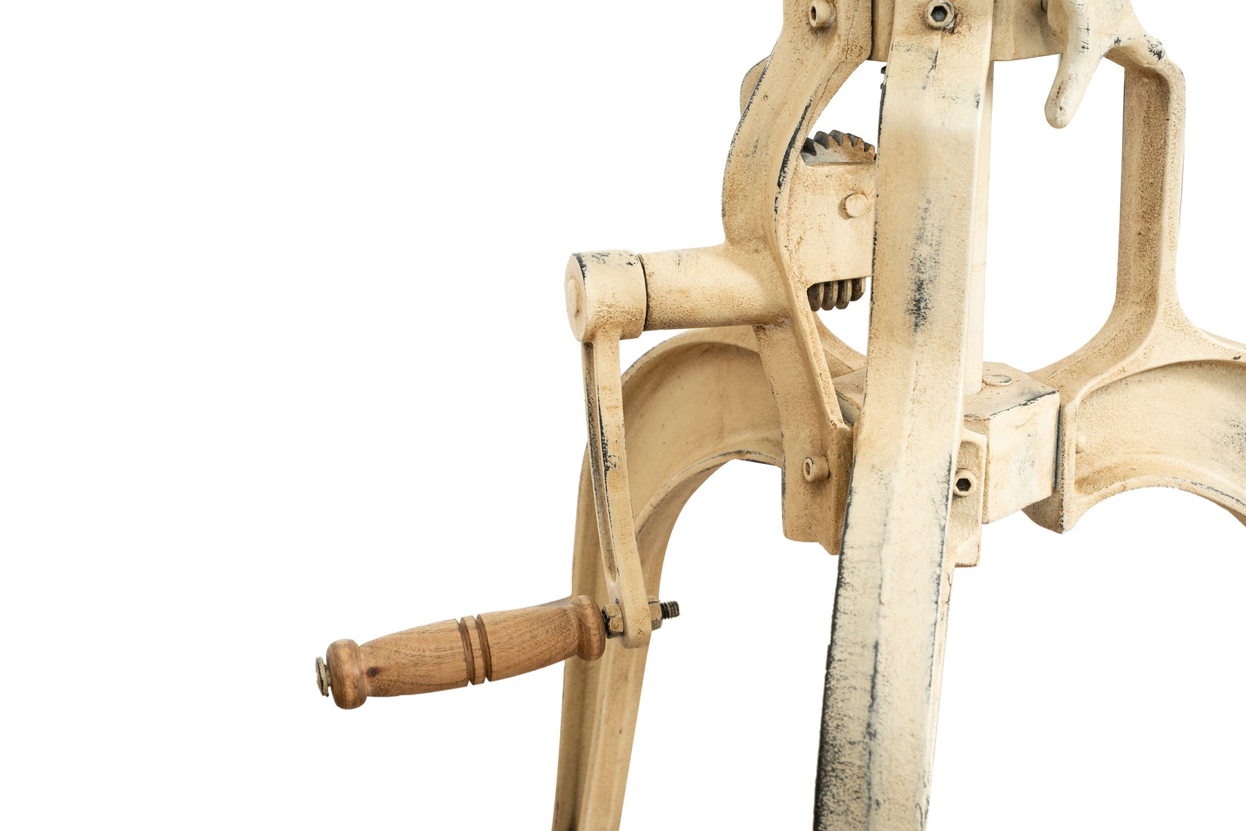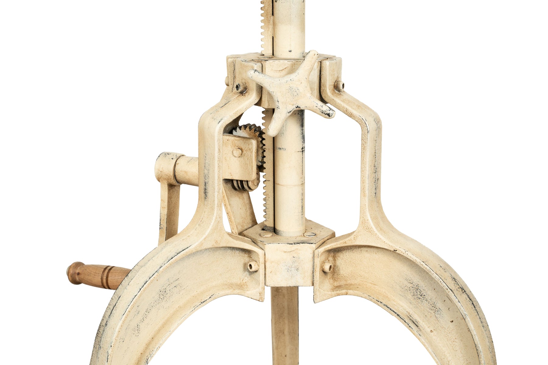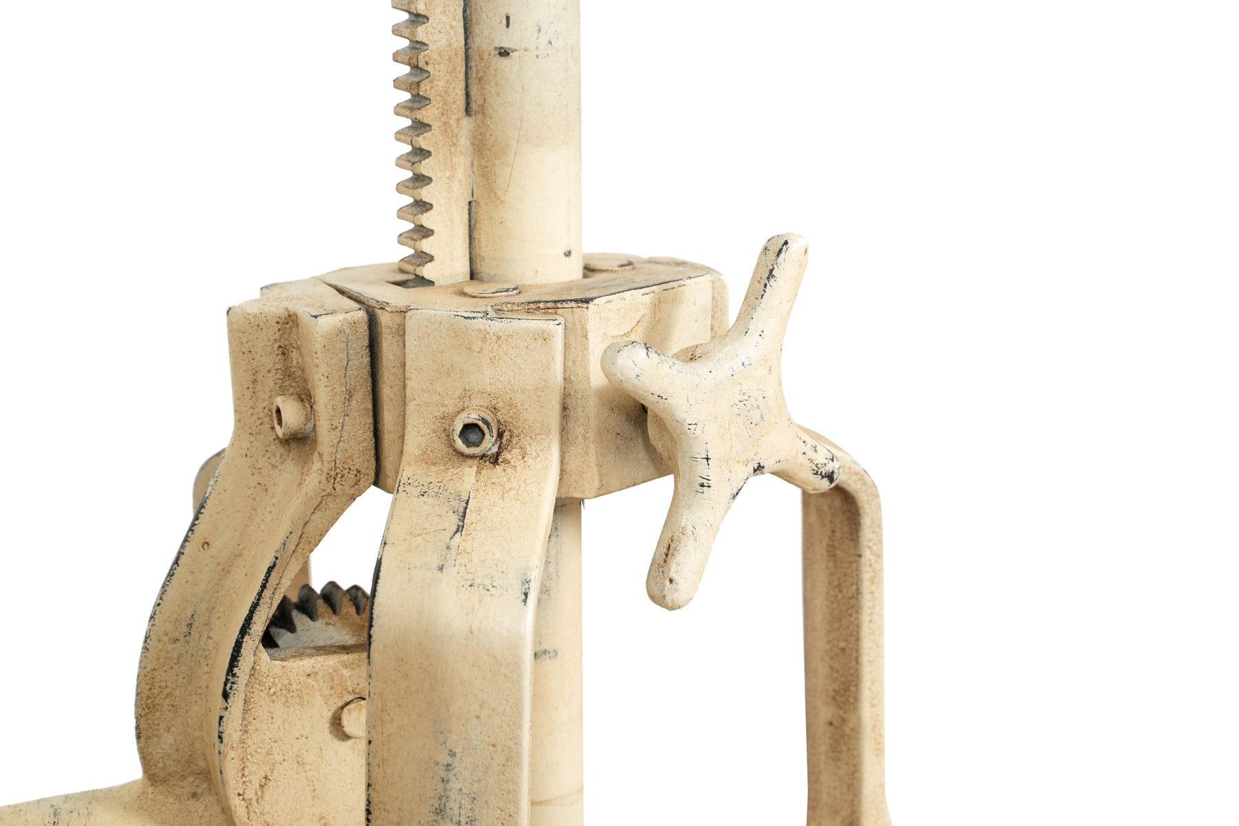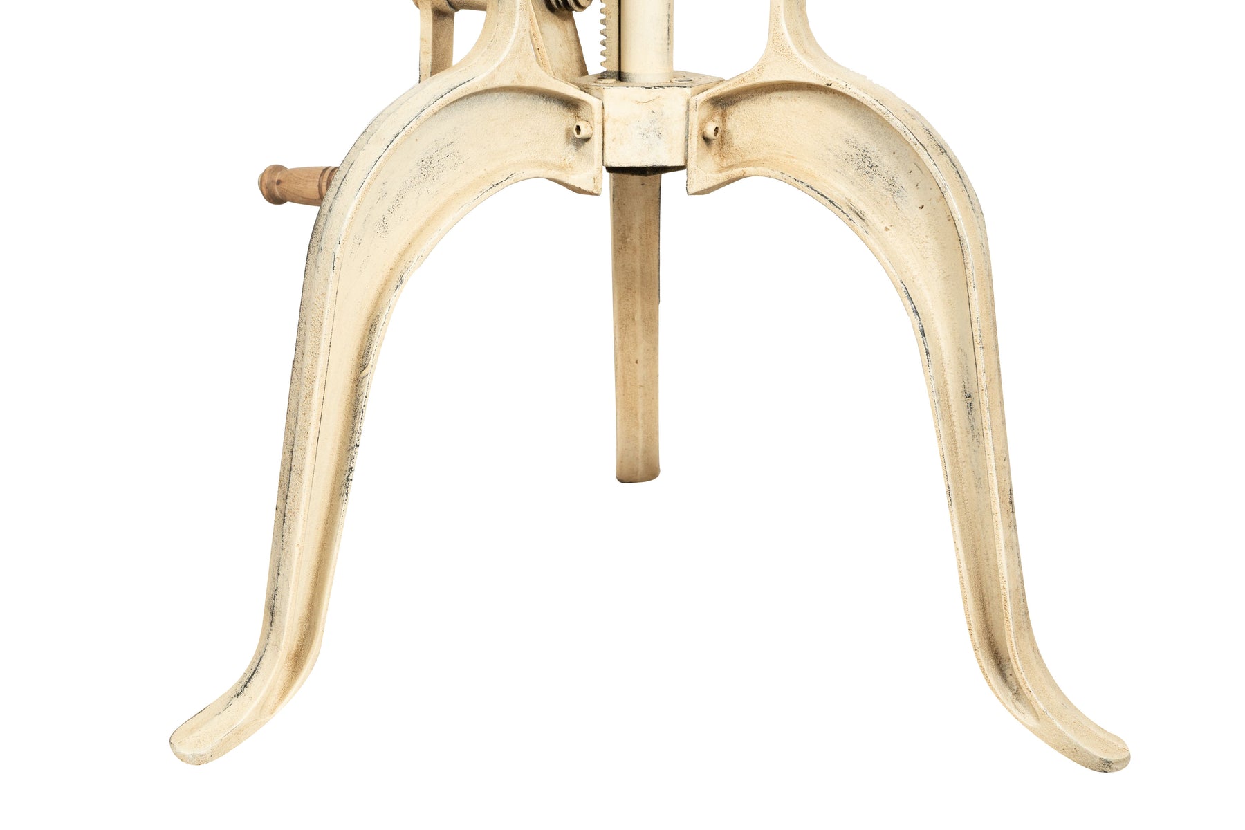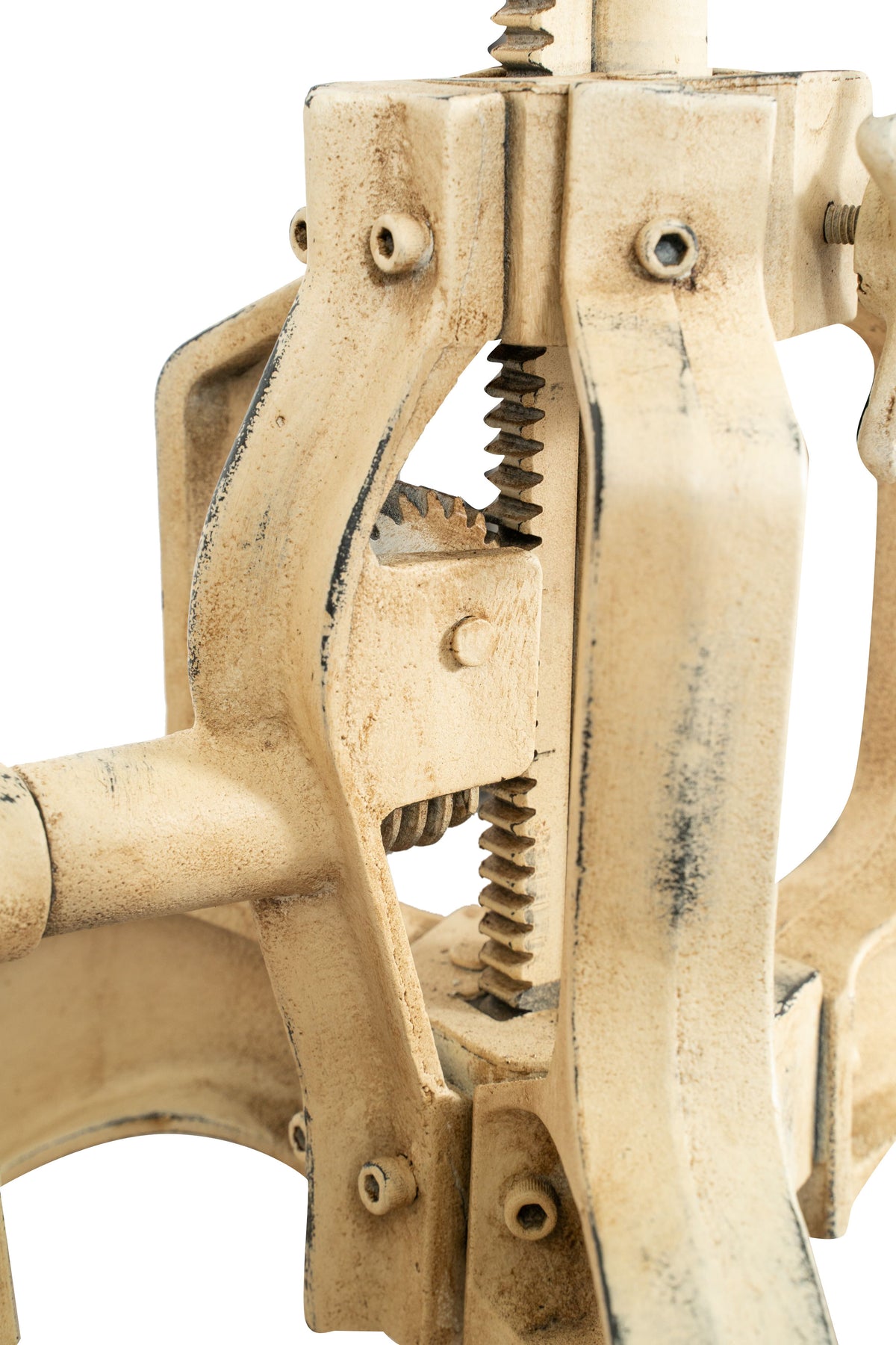 La base in ghisa, struttura portante di notevoli dimensioni, può supportare piani in pietra e marmo di grandi dimensioni, anche molto pesanti. La base è una copia fedele di un banco da lavoro di una vetreria inglese, chiusa nel 1860.