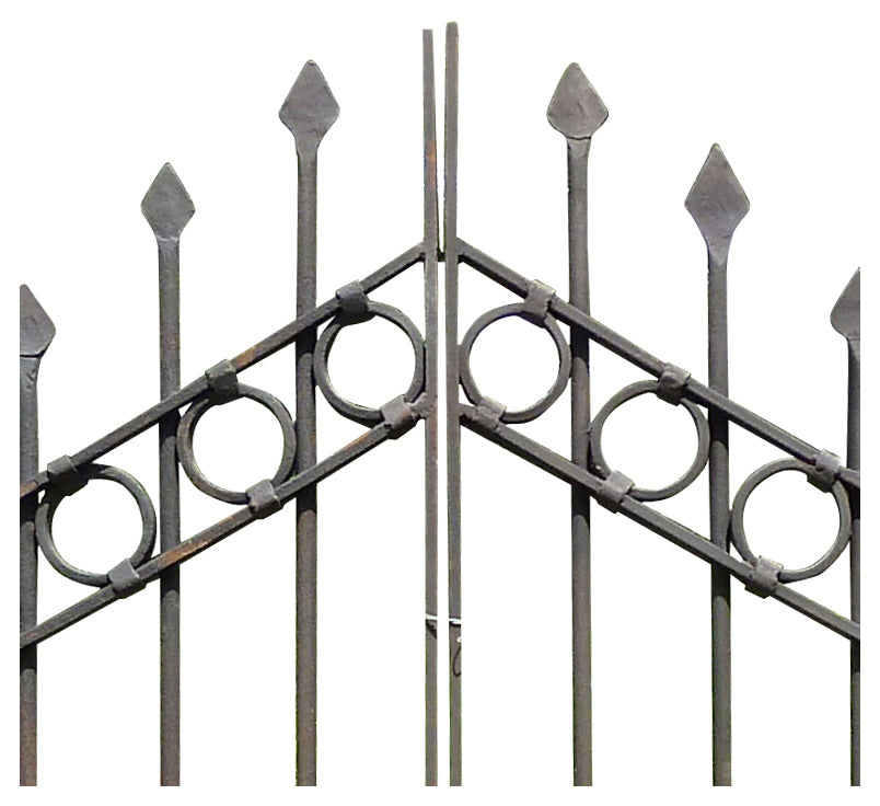 Cancello in ferro pieno interamente forgiato a mano. Non trattato, lasciato al naturale. Il disegno riprende le forme degli antichi e tradizionali cancelli. Made in Italy Misura: L335xPR12xH245 cm.