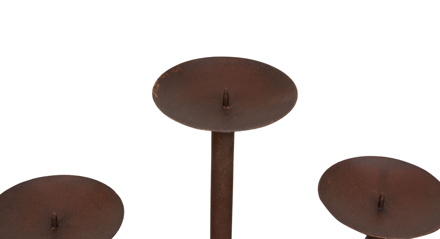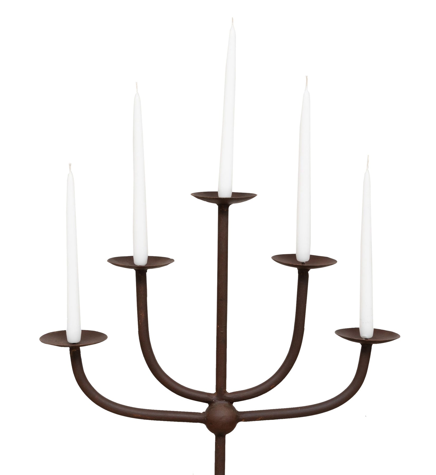 | Candeliere a piantana in ferro battuto di dimensioni lunghezza 54 cm, profondità 30 cm, altezza 100 cm finitura ruggine anticata. Tutte le misure si riferiscono all'ingombro massimo dell'articolo. |