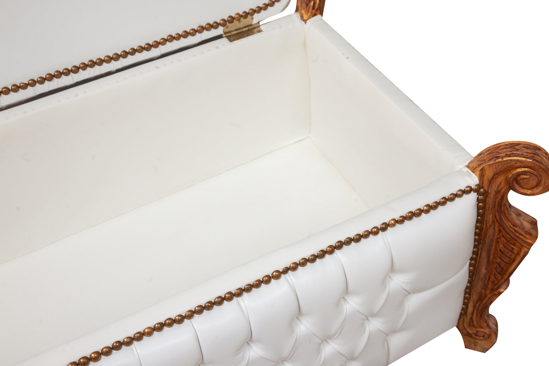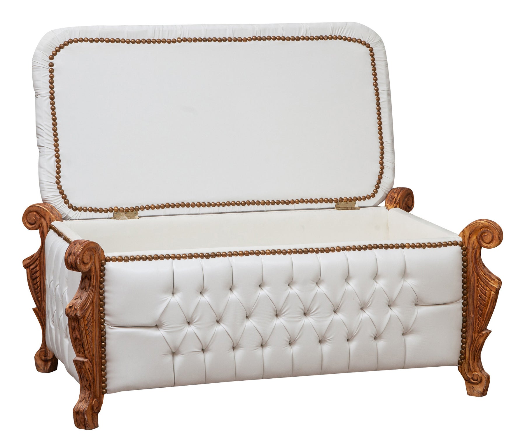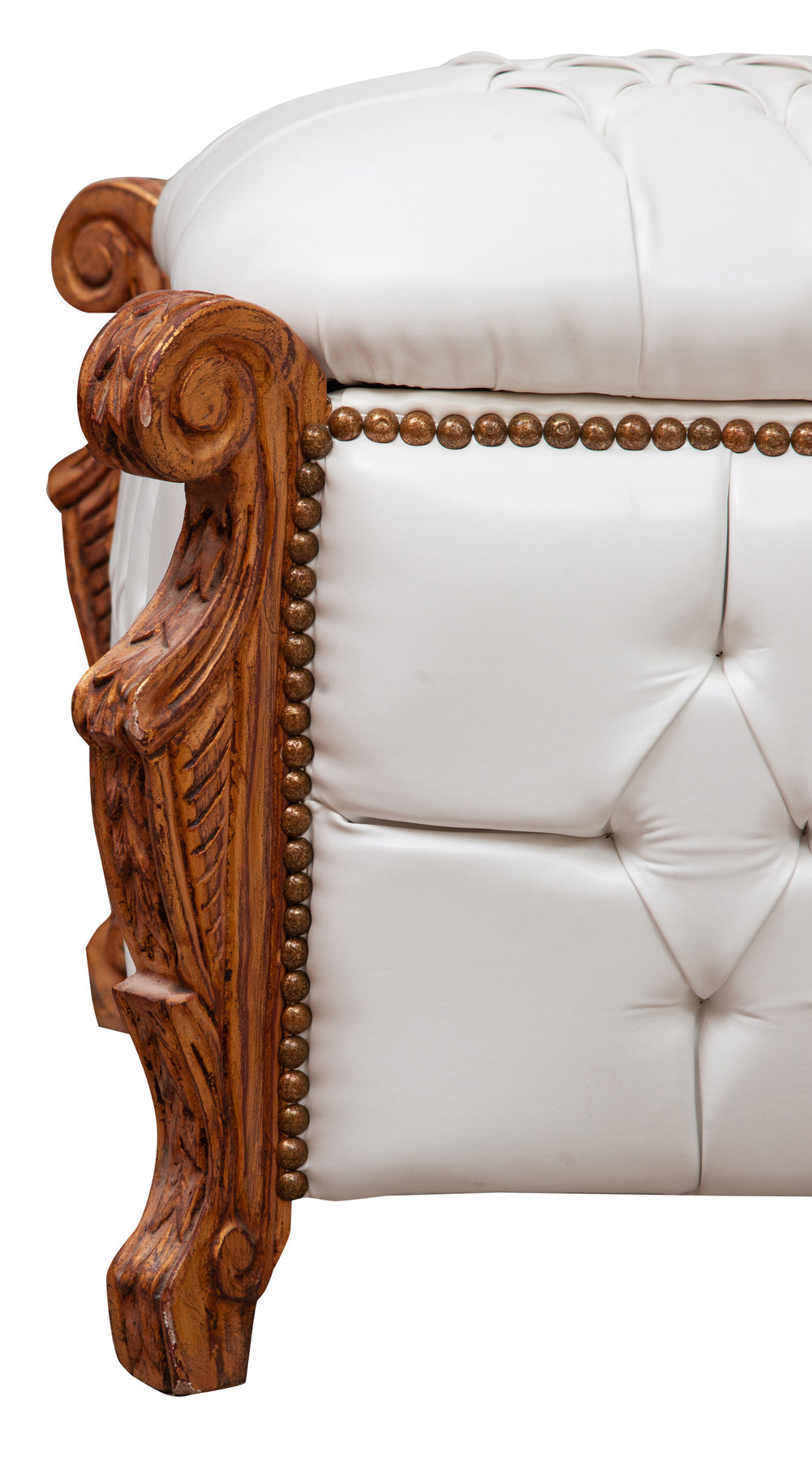 Cassapanca baule stile francese Luigi XVI, in legno massello di faggio, intagliata e finita a mano con patina in foglia oro di dimensioni larghezza 115 cm, profondità 66 cm, altezza 60 cm. Seduta imbottita artigianalmente.