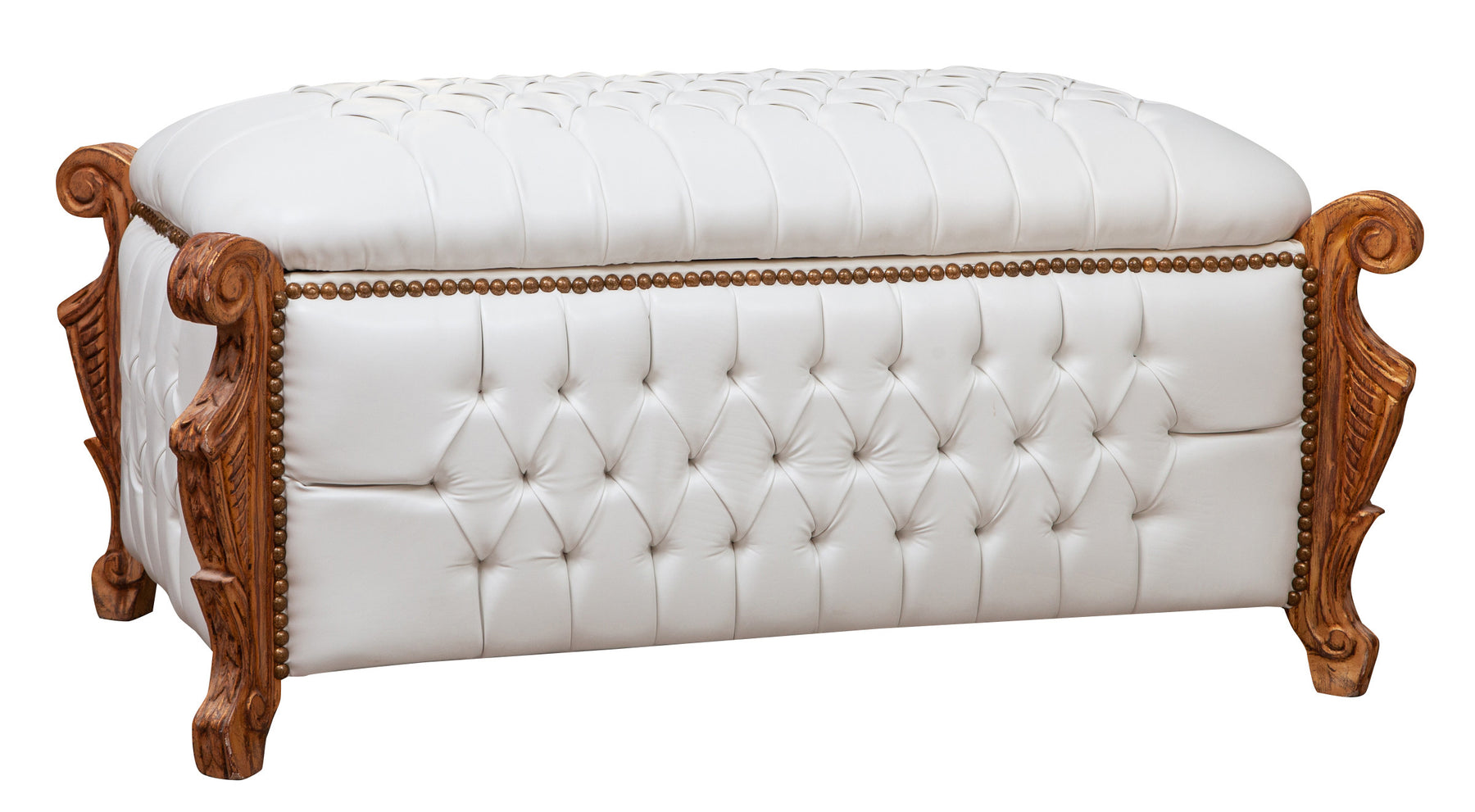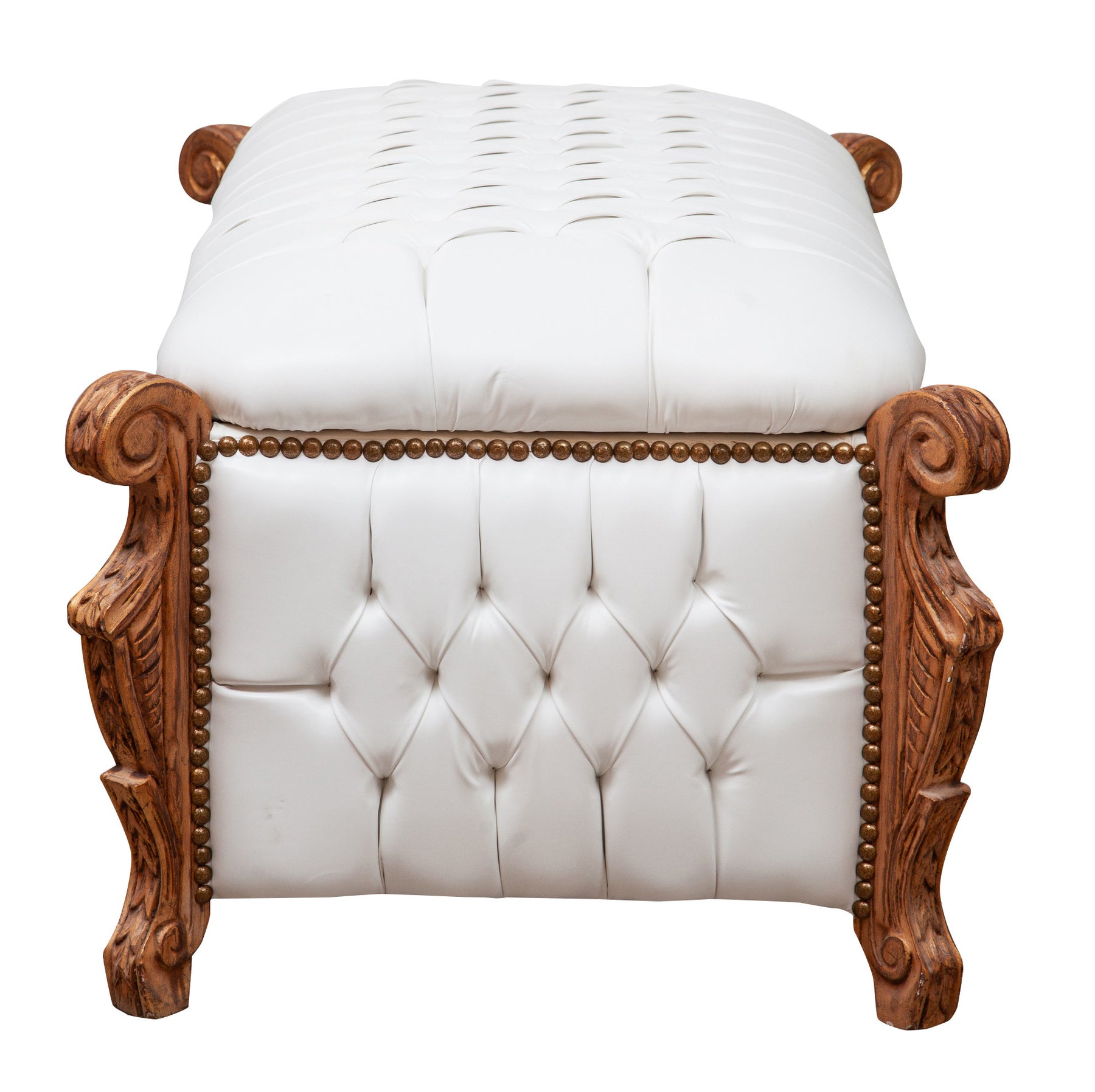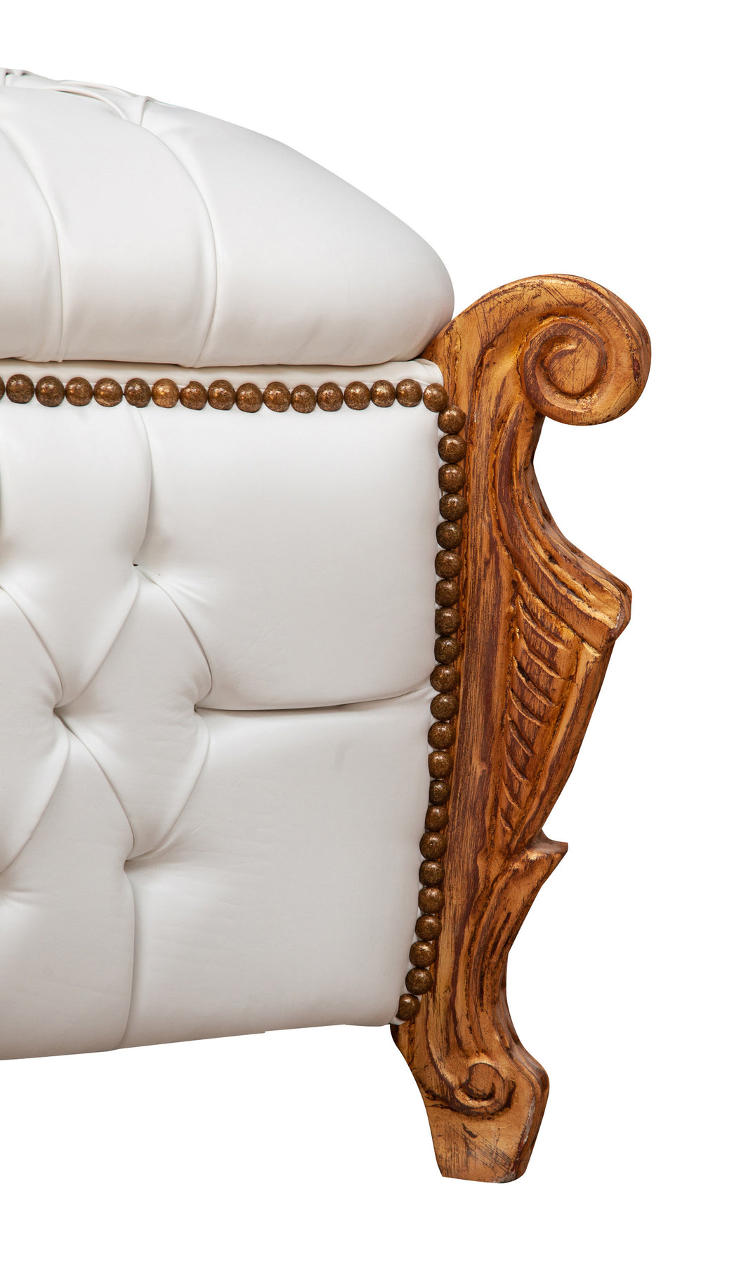 Cassapanca baule stile francese Luigi XVI, in legno massello di faggio, intagliata e finita a mano con patina in foglia oro di dimensioni larghezza 115 cm, profondità 66 cm, altezza 60 cm. Seduta imbottita artigianalmente.