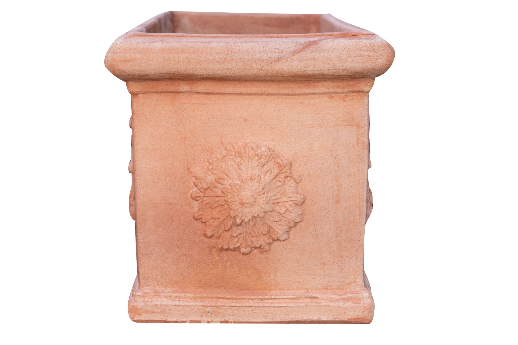 Cassetta realizzata a mano con argilla toscana in galestro antigeliva, di dimensioni lunghezza 82 cm, profondità 37 cm, altezza 37 cm. La realizzazione e la cottura seguono le vecchie tradizioni toscane. Qualità della terra e sistema di cottura rendono il prodotto molto resistente al gelo e a tutti gli agenti atmosferici. La lavorazione interamente fatta a mano rende ogni articolo un pezzo unico.