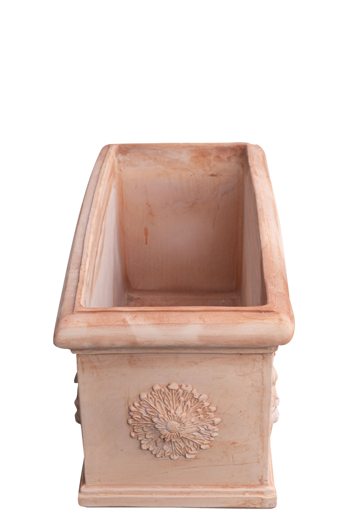 Cassetta realizzata a mano con argilla toscana in galestro antigeliva, di dimensioni lunghezza 101 cm, profondità 45 cm, altezza 45 cm. La realizzazione e la cottura seguono le vecchie tradizioni toscane. Qualità della terra e sistema di cottura rendono il prodotto molto resistente al gelo e a tutti gli agenti atmosferici. La lavorazione interamente fatta a mano rende ogni articolo un pezzo unico.