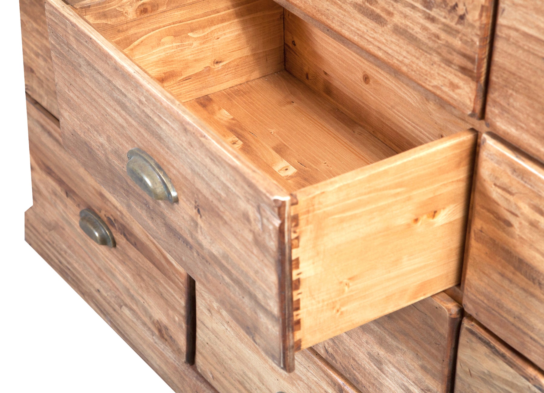 Solida e versatile cassettiera interamente realizzata in legno massello di tiglio, vanta una meticolosa lavorazione artigianale Made in Italy. Di dimensioni L170xPR40xH100cm, è dotata di 12 ampi cassetti tutti realizzati con incastri a coda di rondine e maniglie a conchiglia. Arreda con estrema funzionalità qualsiasi ambiente.