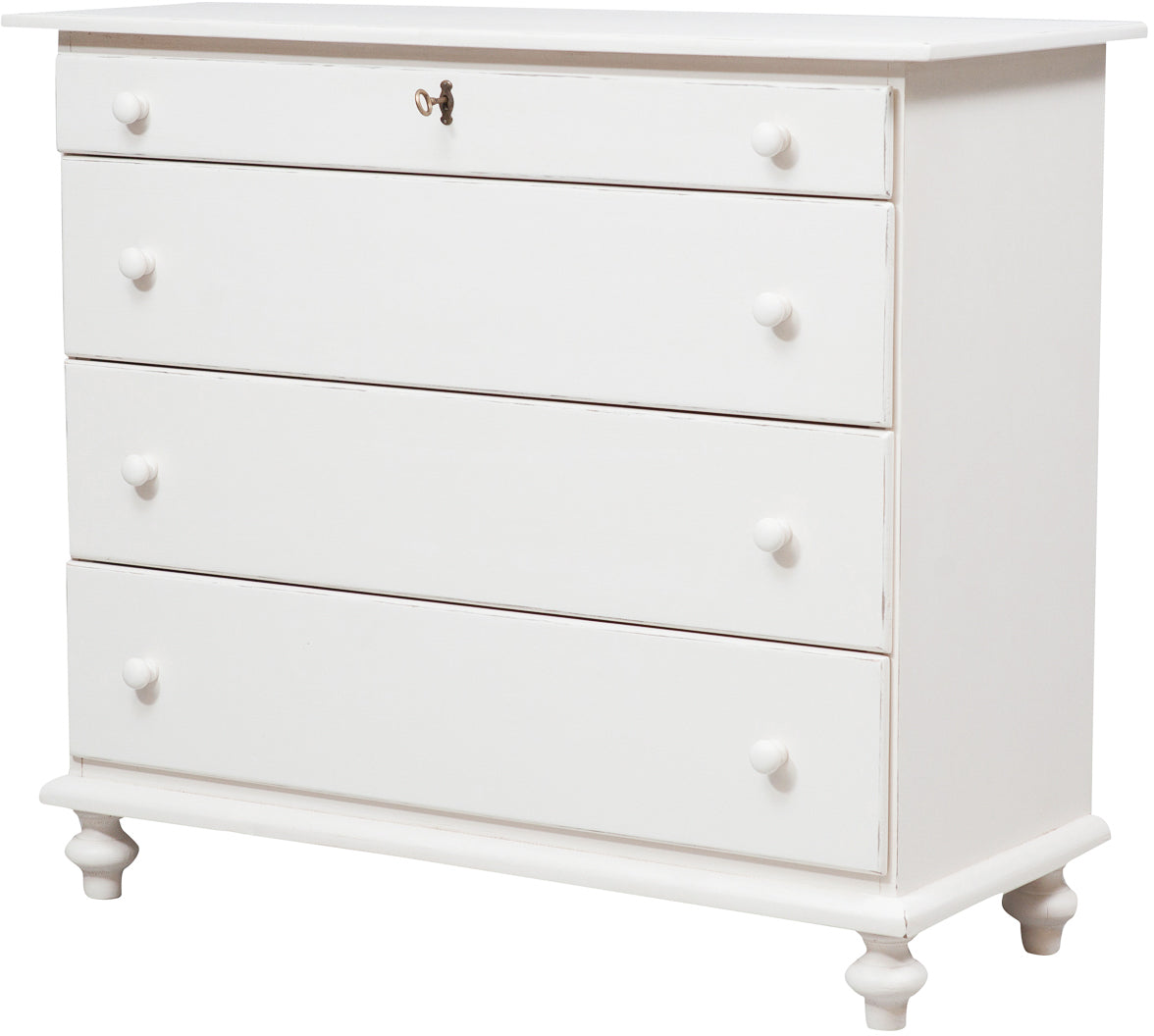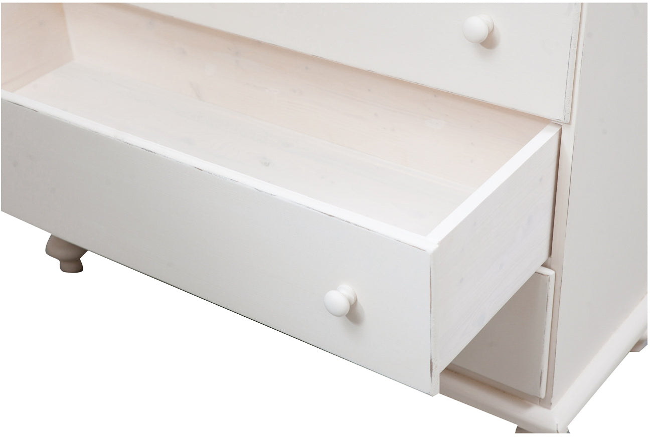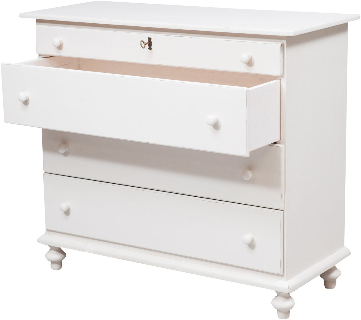 Comò in legno massello di tiglio di dimensioni L114xPR49xH99 cm, dotato di quattro ampi e funzionali cassetti con incastri a coda di rondine e pomelli in legno. Design essenziale, robustezza e qualità tipici della lavorazione artigianale Made in Italy, lo rendono ideale per donare un tocco di originalità e personalità a qualsiasi ambiente.