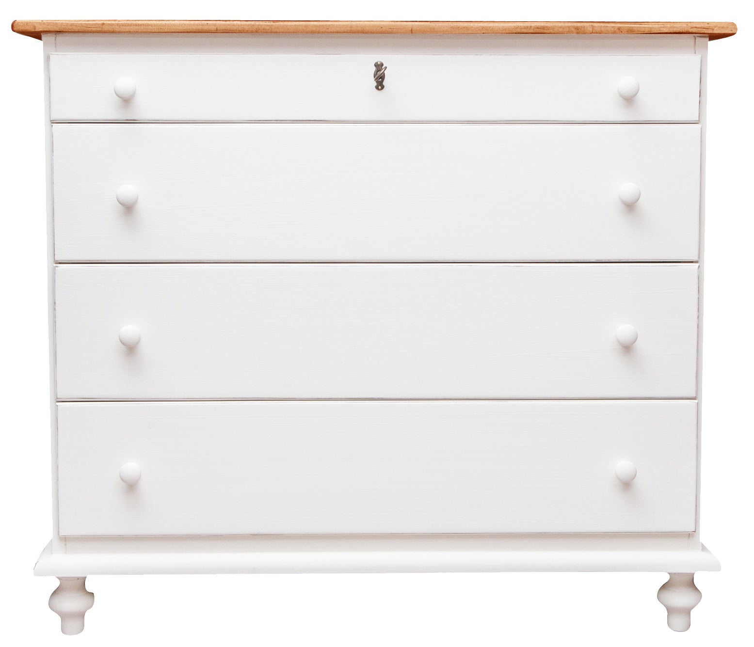 Comò in legno massello di tiglio di dimensioni L114xPR49xH99 cm, dotato di quattro ampi e funzionali cassetti con incastri a coda di rondine e pomelli in legno. Design essenziale, robustezza e qualità tipici della lavorazione artigianale Made in Italy, lo rendono ideale per donare un tocco di originalità e personalità a qualsiasi ambiente.