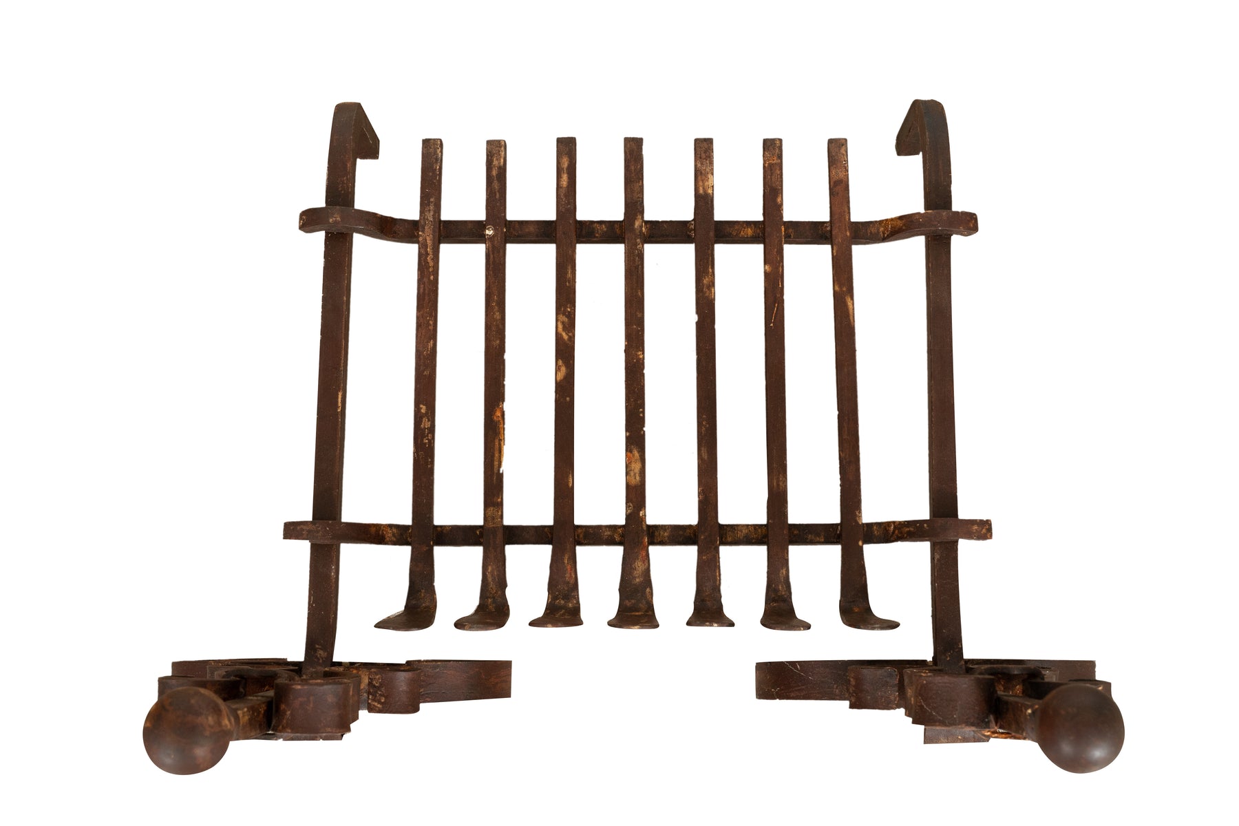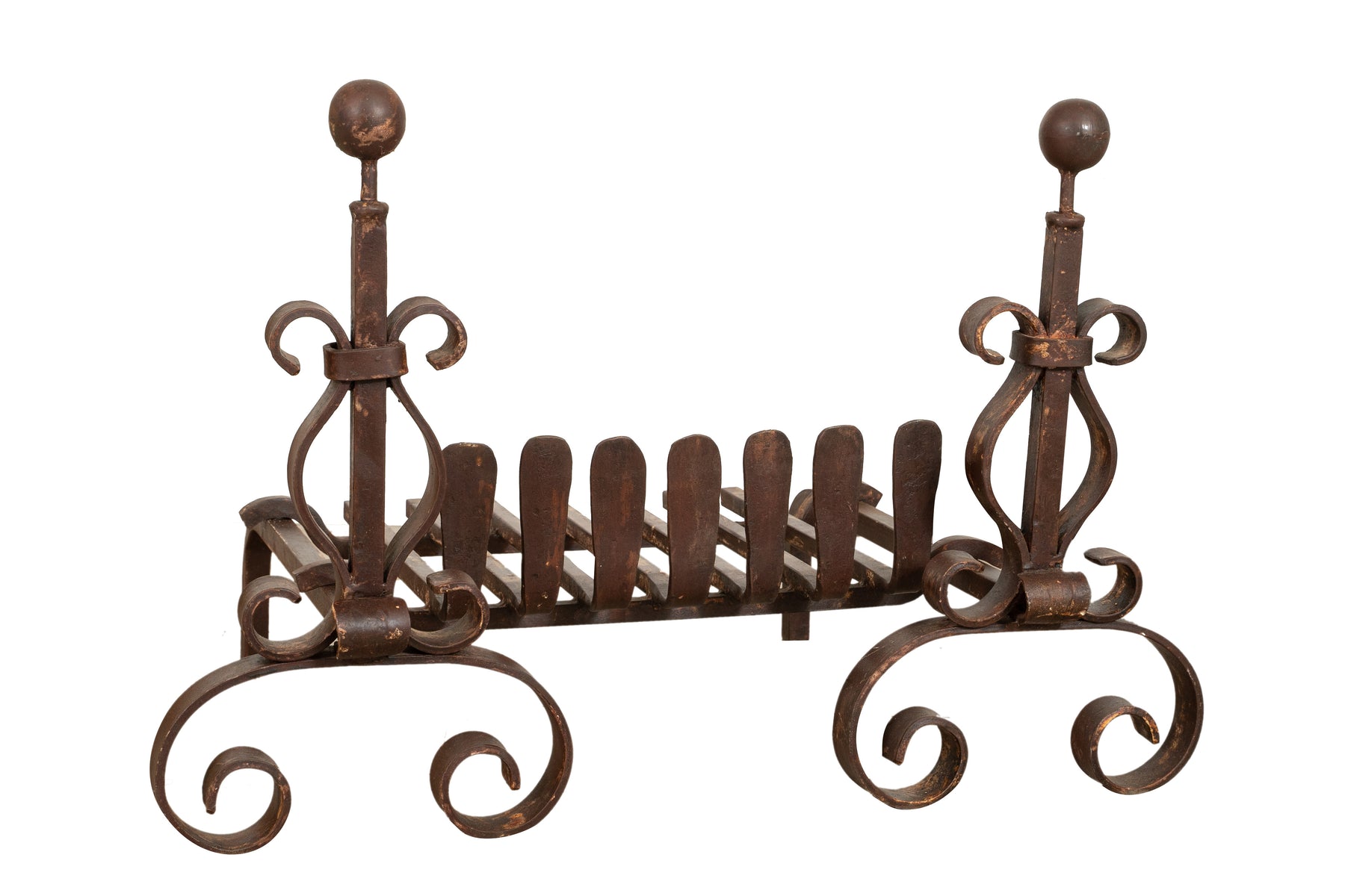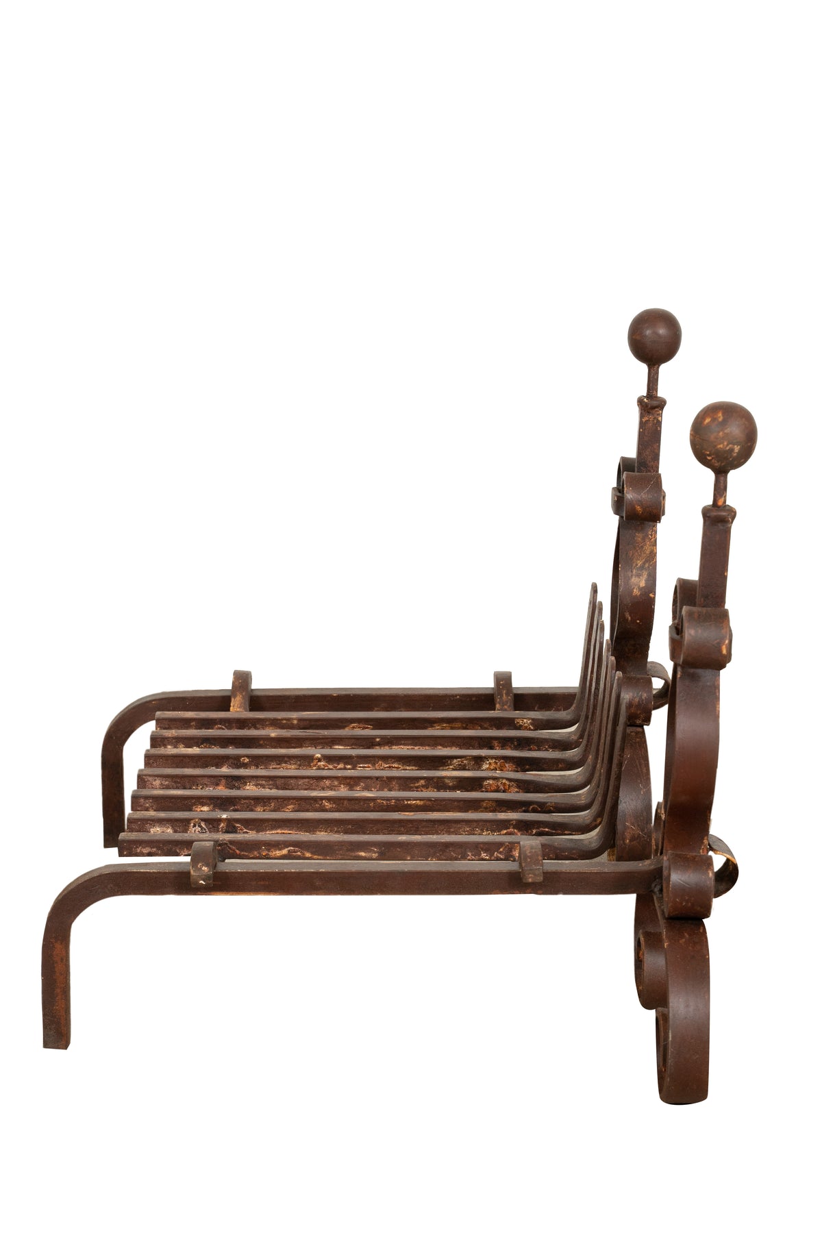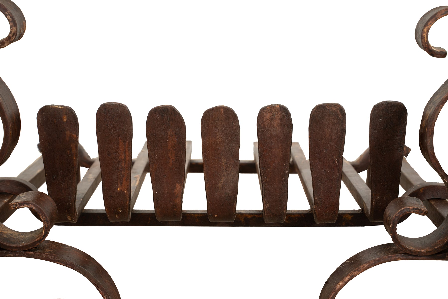 Stabile set composto da una coppia di alari e da un braciere realizzati in ferro battuto forgiato a mano. Fondamentale accessorio decorativo e funzionale per camino. Misure L70xPR50xH50 cm