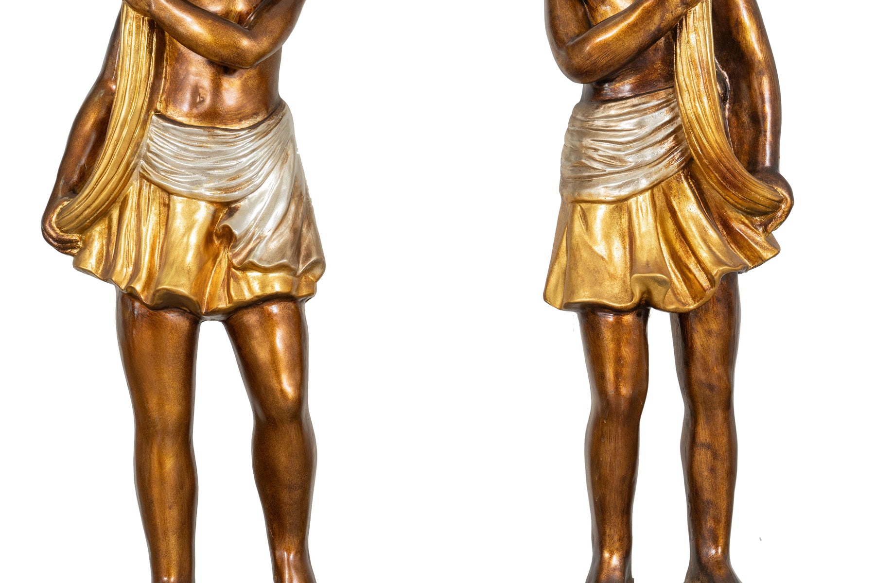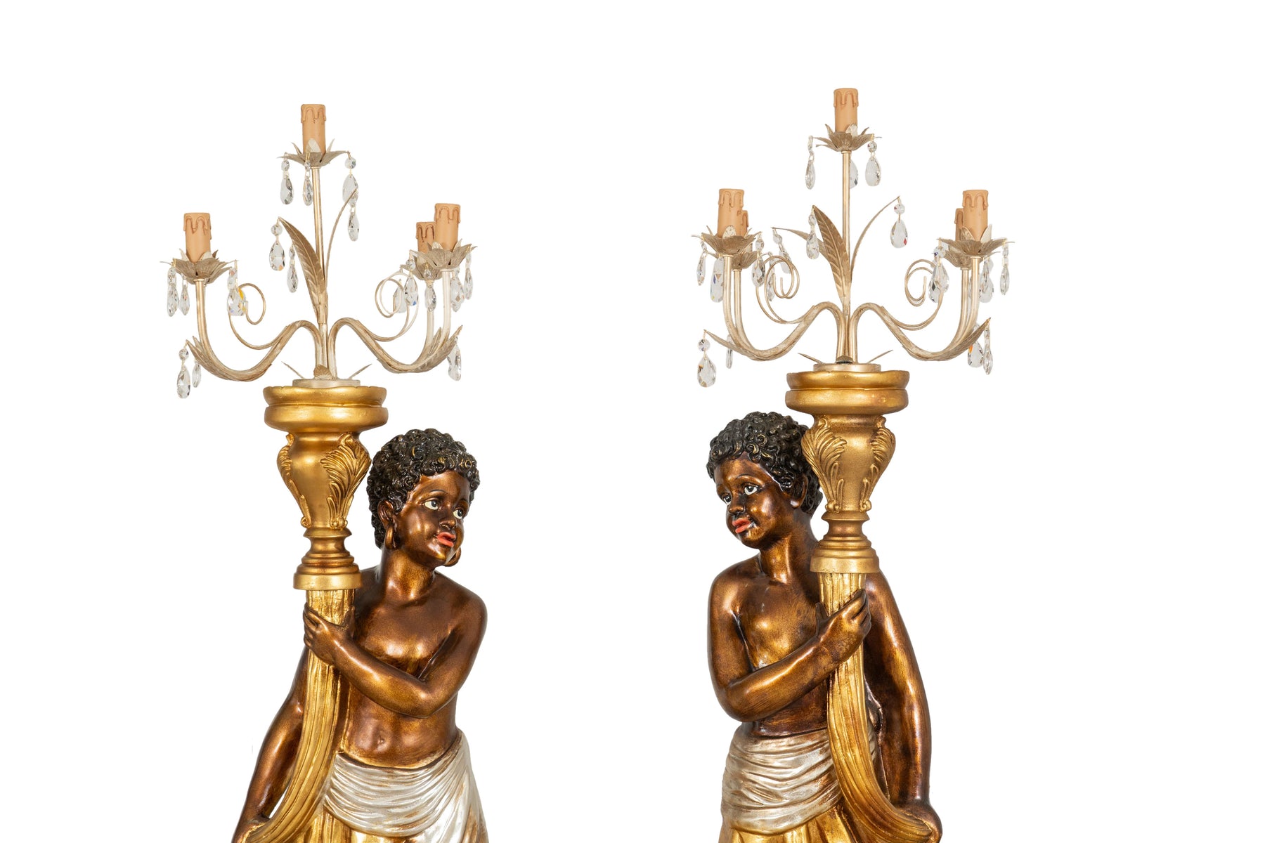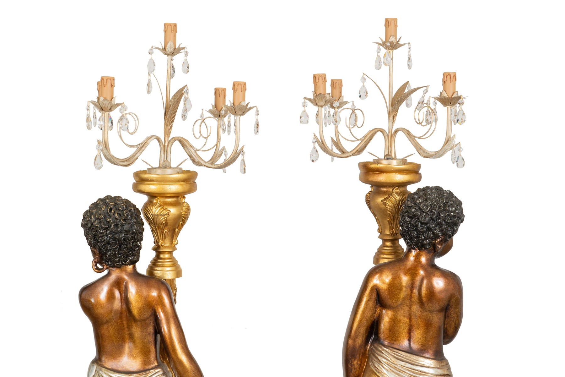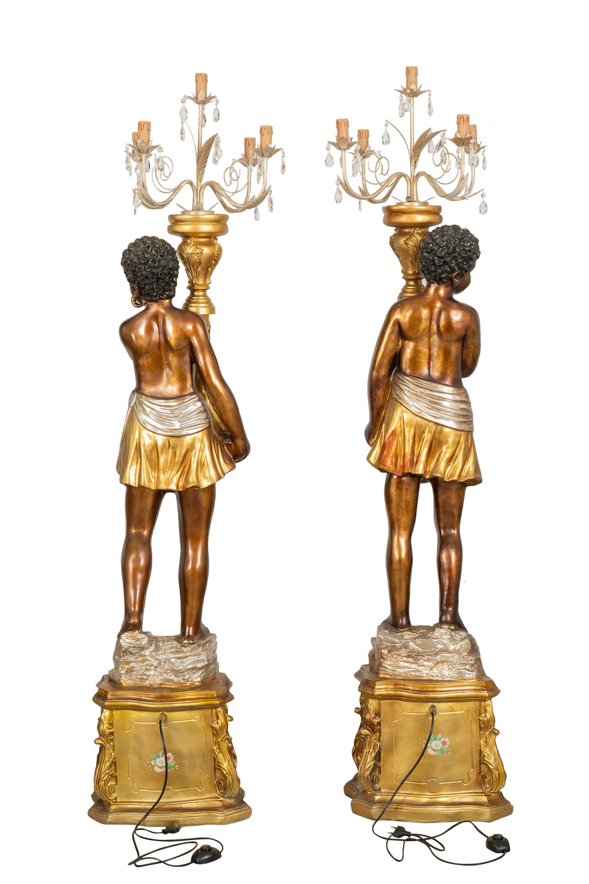 Coppia di mori con lampadario di dimensioni larghezza 40 cm, profondità 40 cm, altezza 190 cm cad. Tutte le misure si riferiscono all'ingombro massimo dell'articolo.