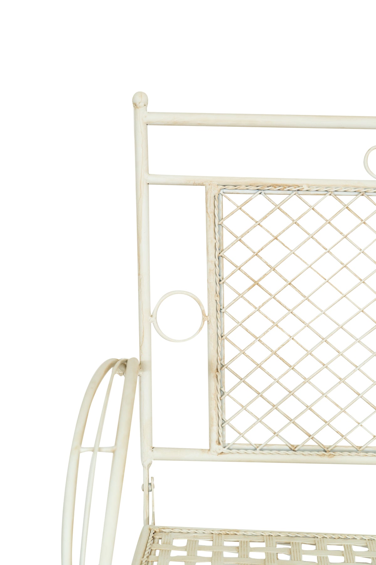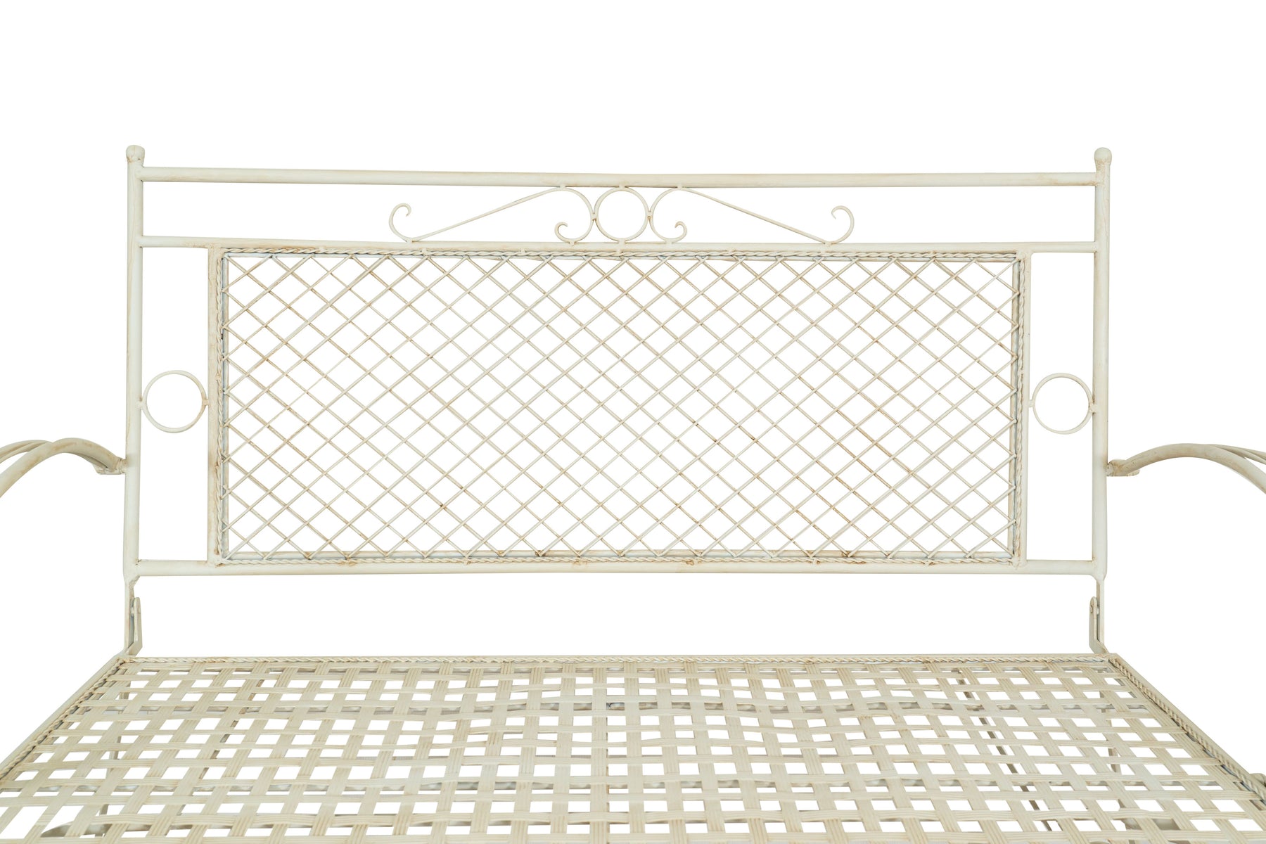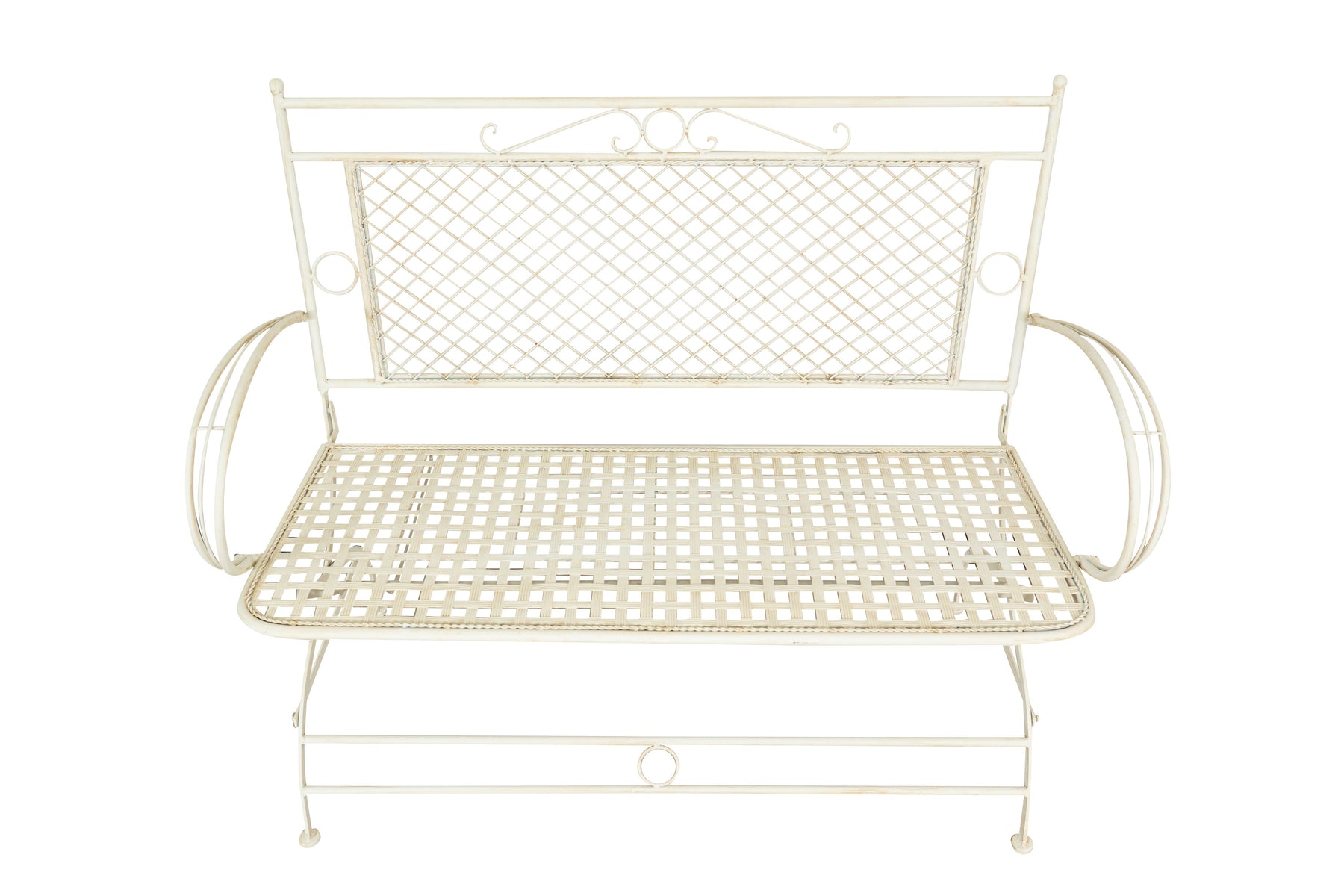 Divanetto/panchina larghezza 120 cm, profondità 52 cm, altezza 79 cm realizzato in ferro battuto. Caratterizzata da una minuziosa lavorazione ad intreccio è ideale per qualsiasi spazio aperto.