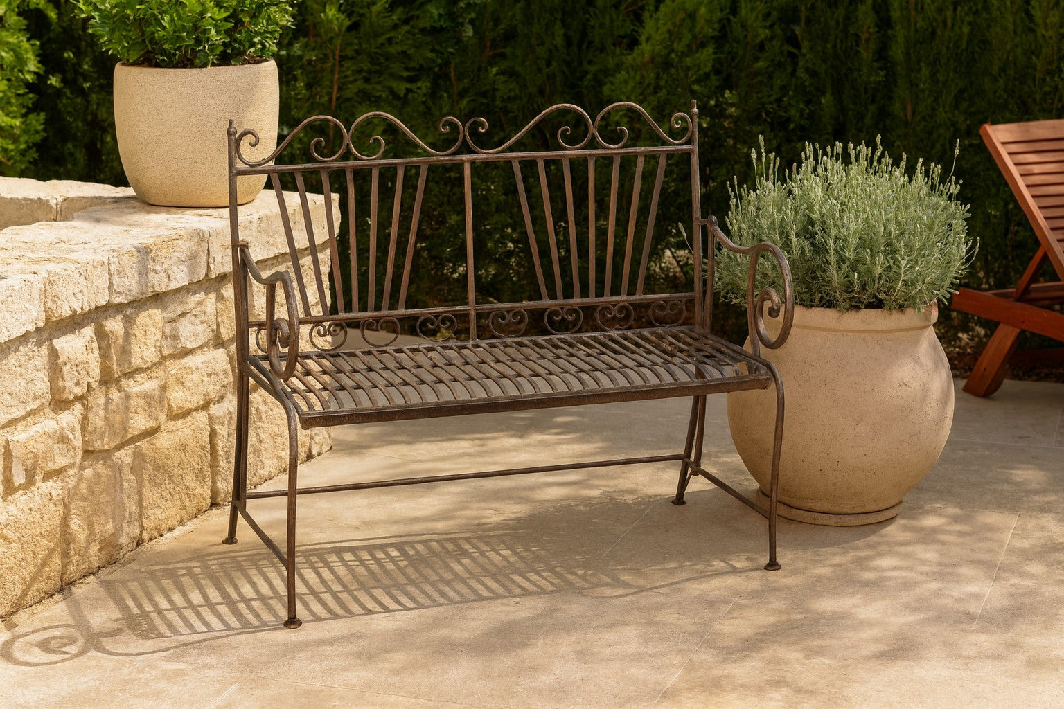 Panchine da giardino divanetti realizzati in ferro di dimensioni larghezza 113 cm, profondità 58 cm, altezza 94 cm. Con il suo stile provenzale, arreda con funzionale eleganza qualsiasi ambiente, sia interno che esterno.