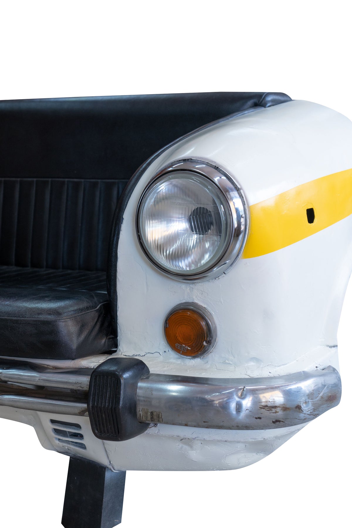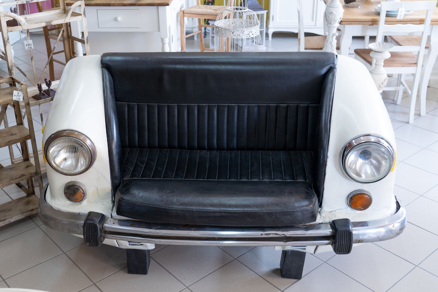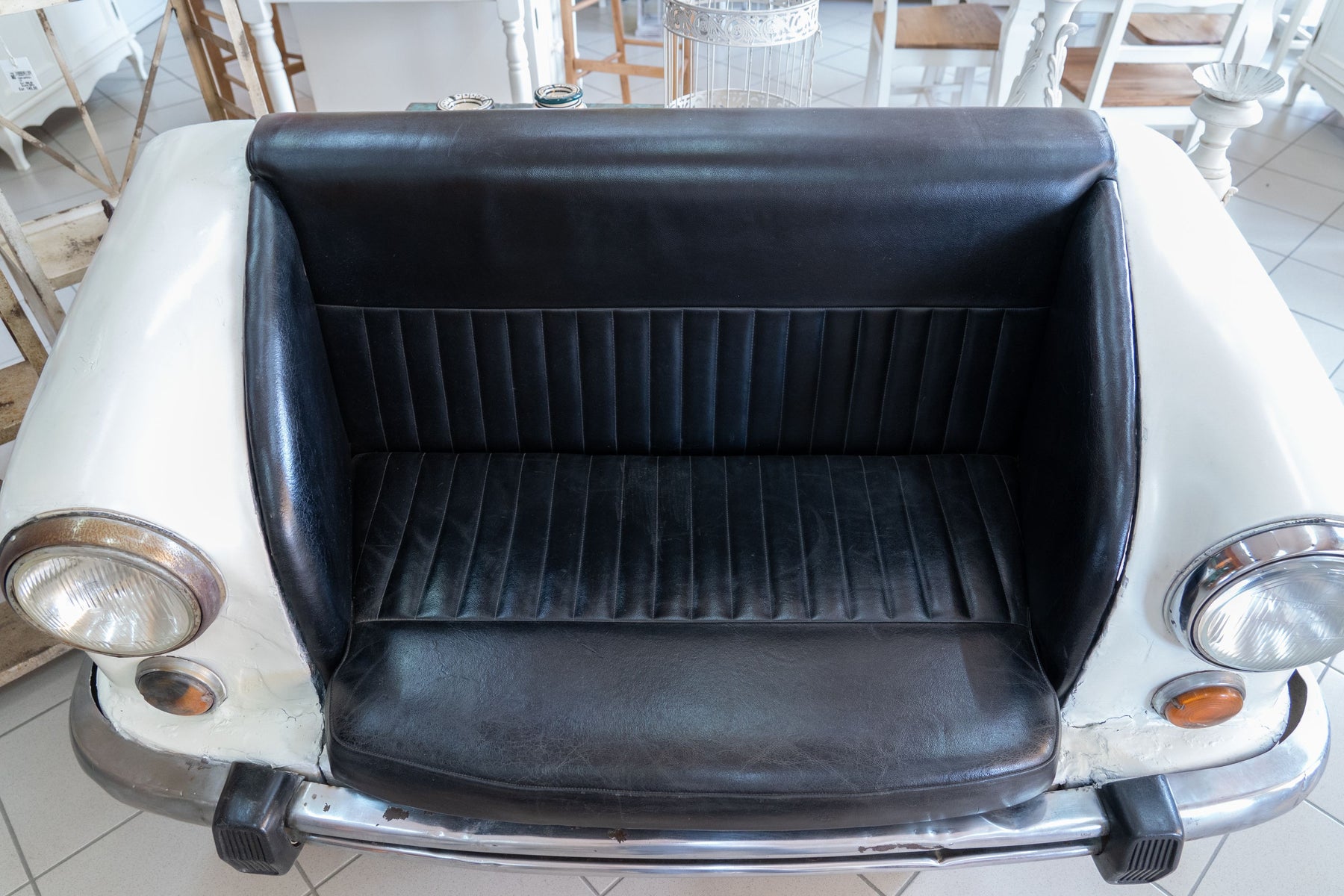 Molto solido e robusto divano seduta di dimensioni larghezza 160 cm, profondità 84 cm, altezza 84 cm realizzato dal frontale di una vera ed originale macchina; molto scenografico, ogni pezzo è un pezzo unico.