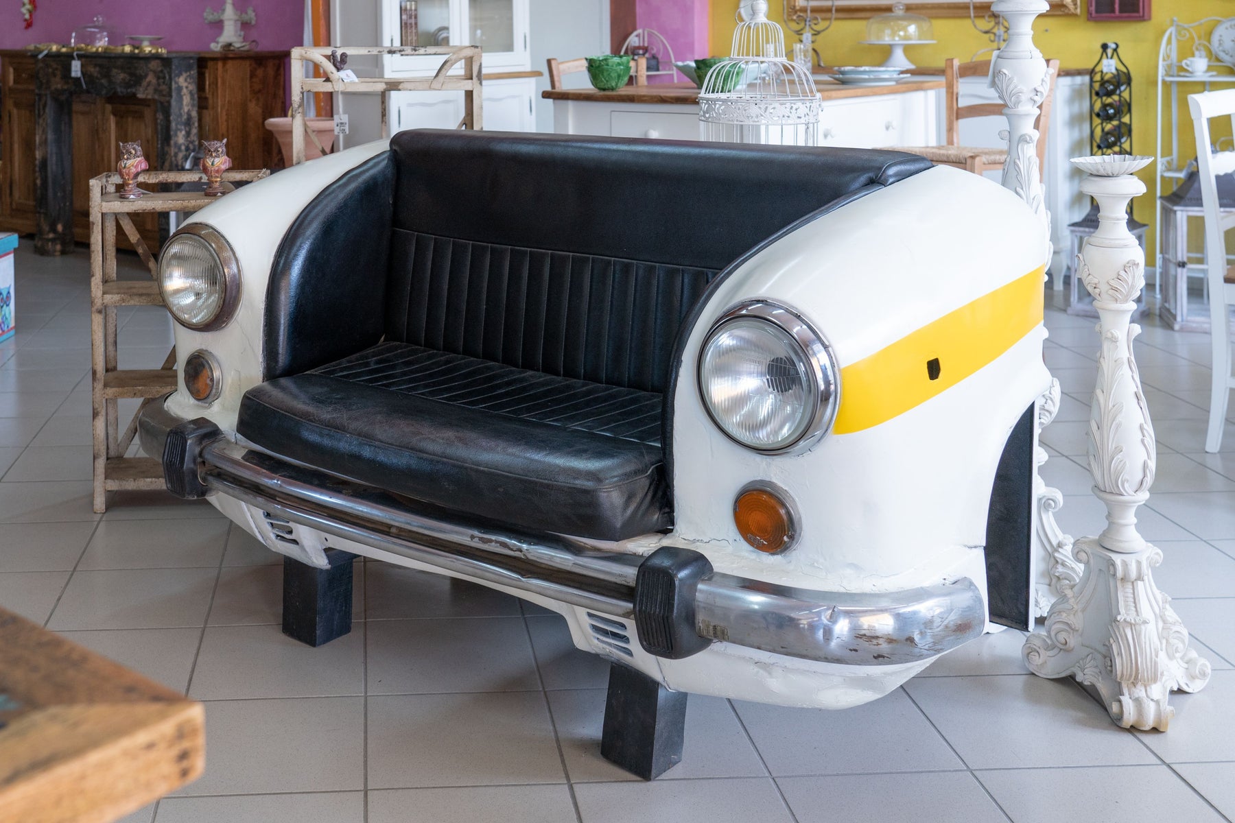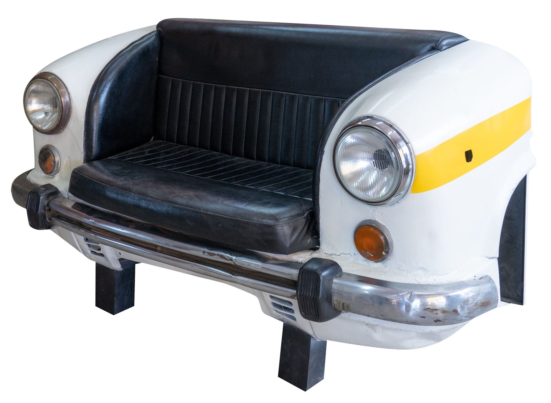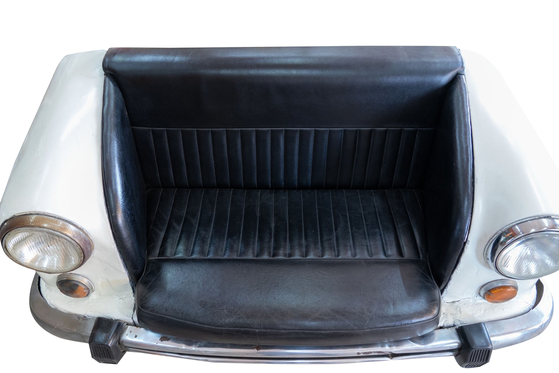 Molto solido e robusto divano seduta di dimensioni larghezza 160 cm, profondità 84 cm, altezza 84 cm realizzato dal frontale di una vera ed originale macchina; molto scenografico, ogni pezzo è un pezzo unico.