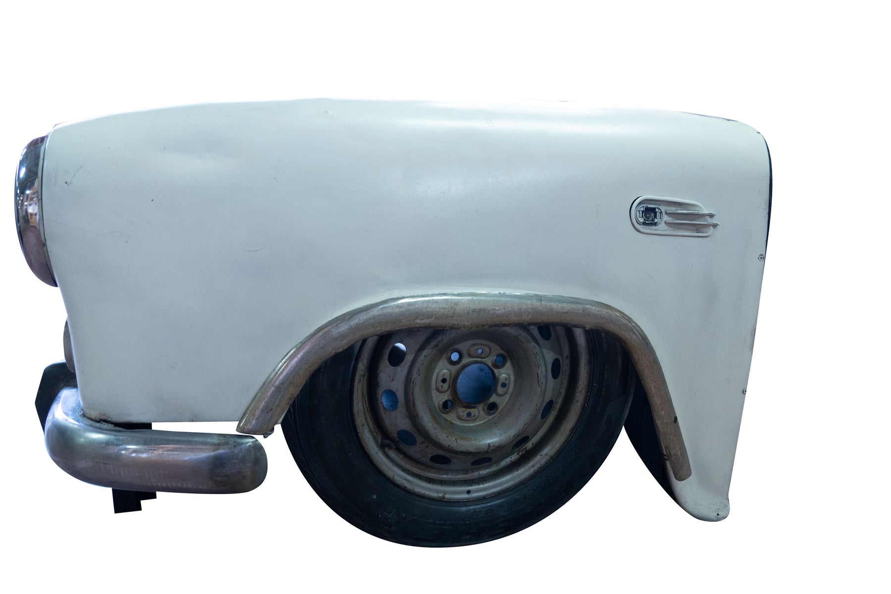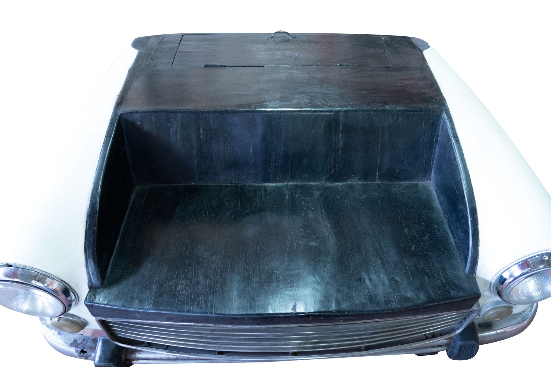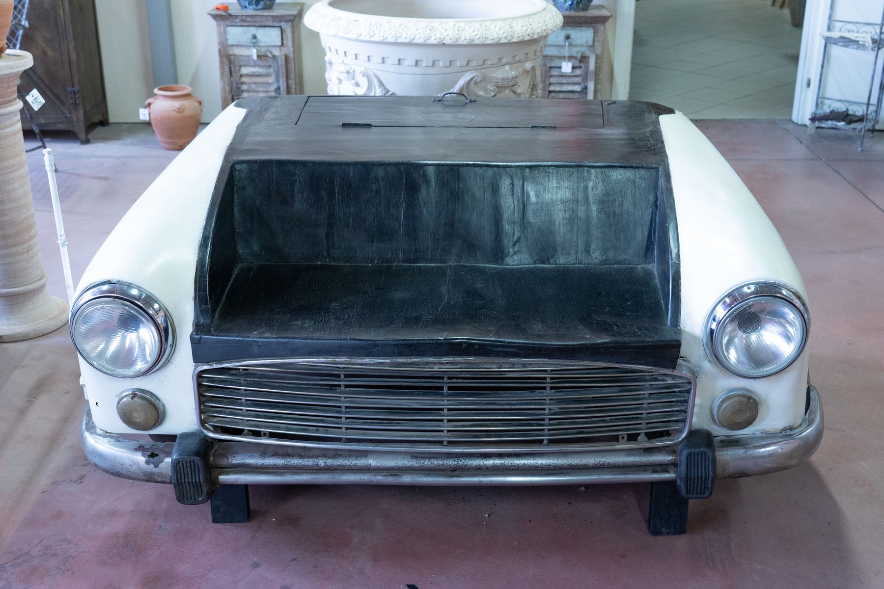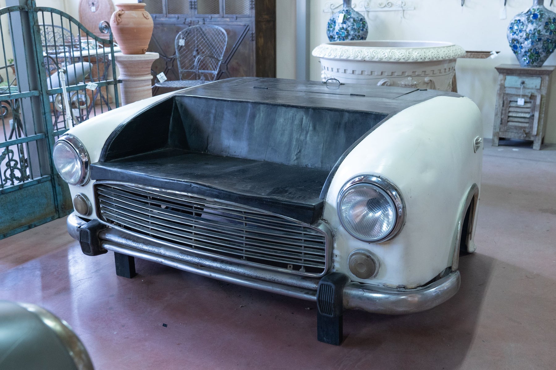 Molto solido e robusto divano seduta di dimensioni larghezza 140 cm, profondità 120 cm, altezza 74 cm realizzato dal frontale di una vera ed originale macchina; molto scenografico, ogni pezzo è un pezzo unico.