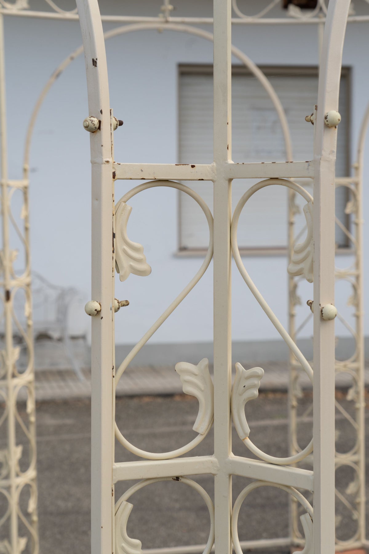 Molto solido e stabile gazebo in ferro di tubolare robusto di dimensioni larghezza 350 cm, profondità 350 cm, altezza 355 cm, finito anticato con parti graffiate e sverniciate di proposito per dare un tocco di vissuto. Questi gazebi non hanno bisogno di nessun tipo di permesso comunale per poterli installare, come anche le pergole e serre. Tutte le misure del gazebo, pergola e serra si riferiscono all'ingombro massimo dell'articolo.