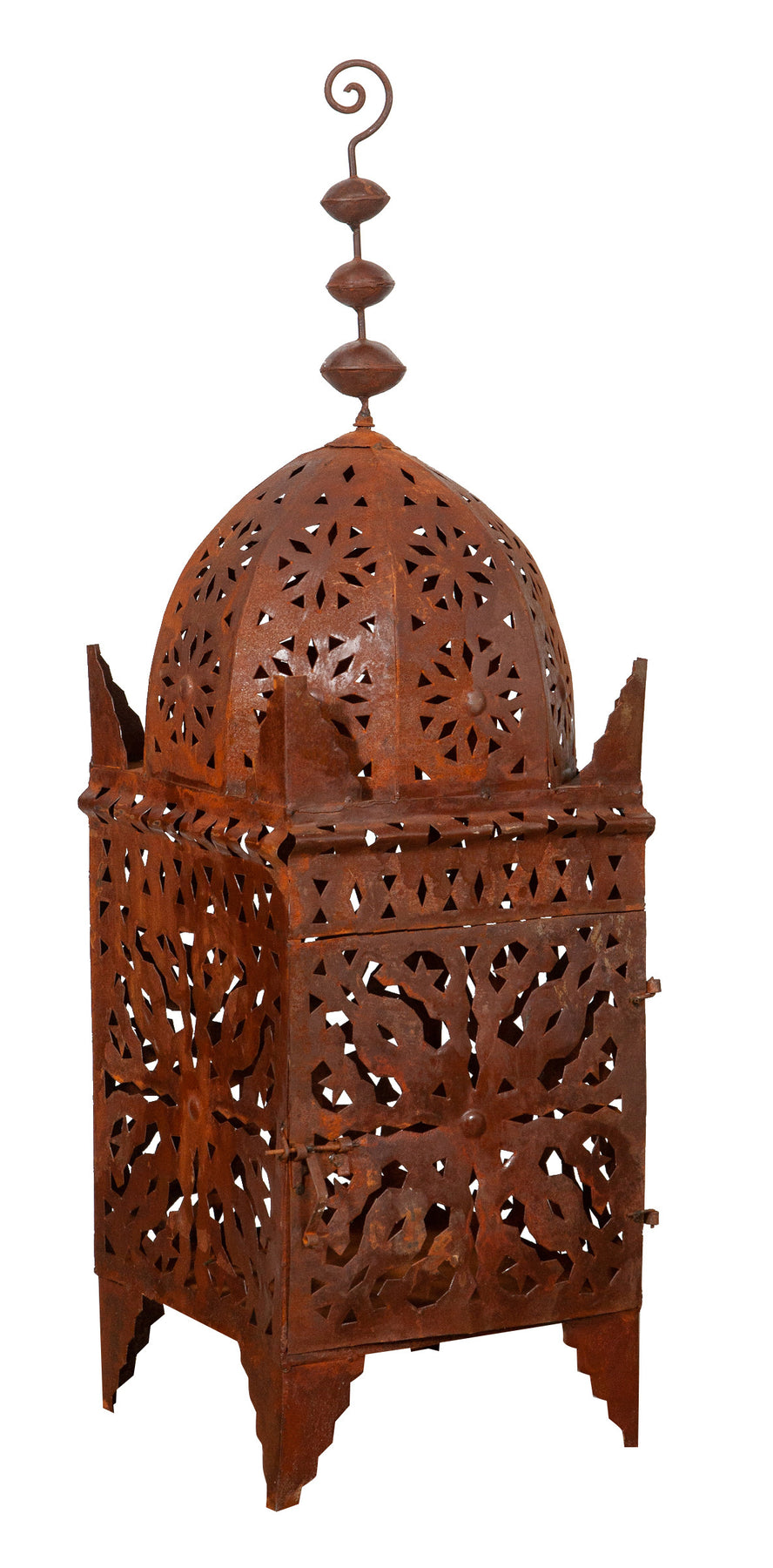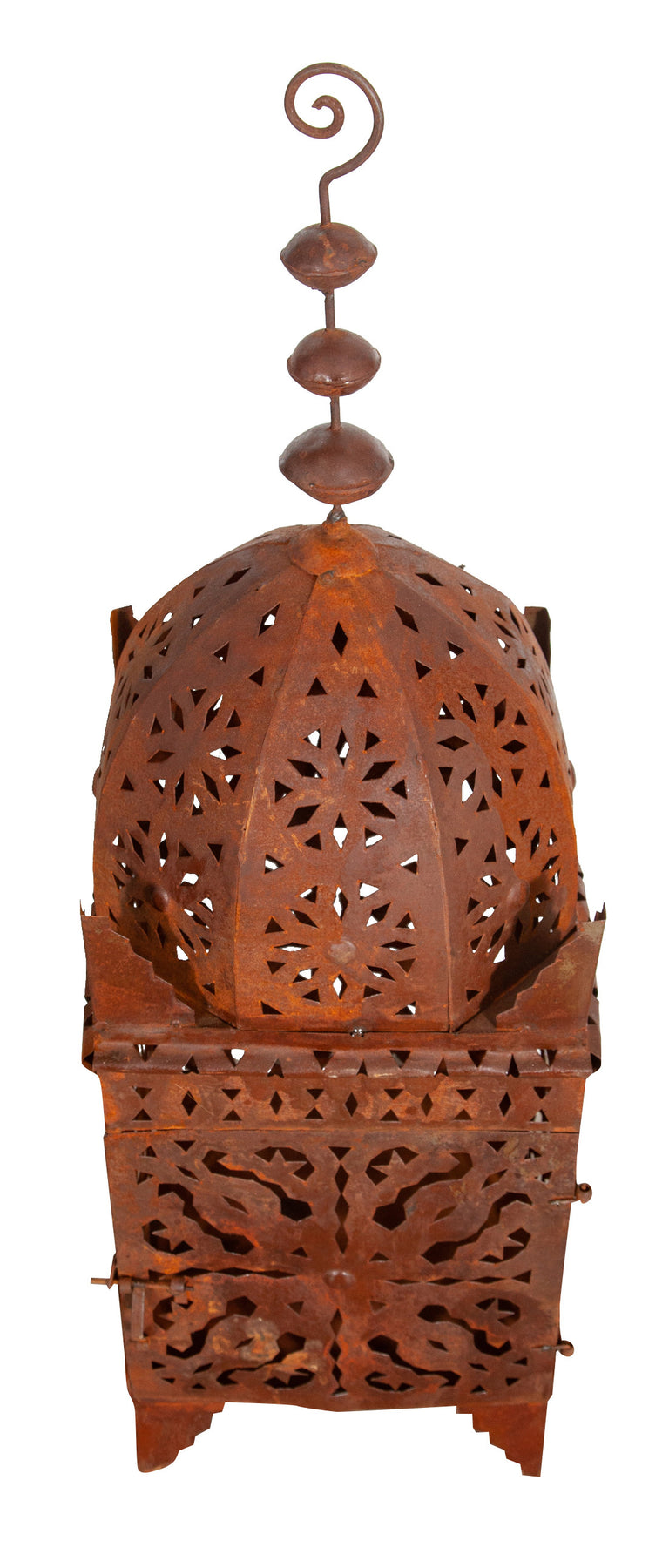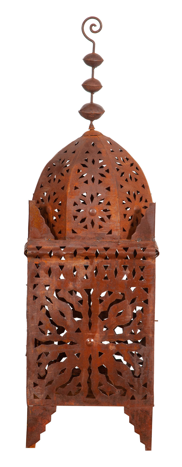| Originale lanterna in ferro battuto traforata finitura naturale di dimensioni lunghezza 30 cm , profondità 30 cm , altezza 100 cm. Può essere utilizzata come lampada da tavolo o da terra e come porta candela ma anche come lampadario se appesa al soffitto. La struttura particolare della lanterna crea un’atmosfera suggestiva regalando alla casa e al giardino il fascino delle notti orientali, l'effetto della finitura naturale del ferro e i giochi di luce e ombra proiettano caldi riflessi nelle pareti delle vostre stanze. Sono oggetti unici e caratteristici che però si adattano a qualsiasi angolo e contesto di ogni ambiente. |