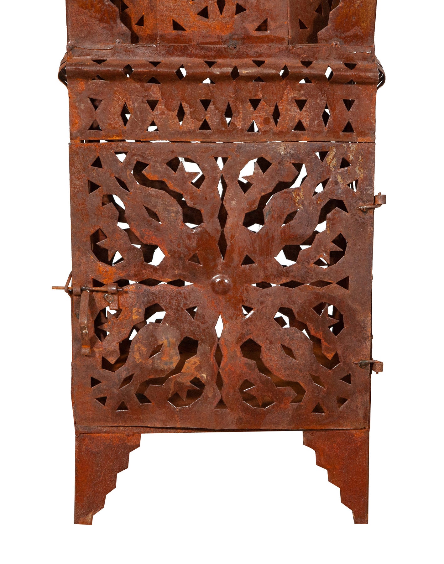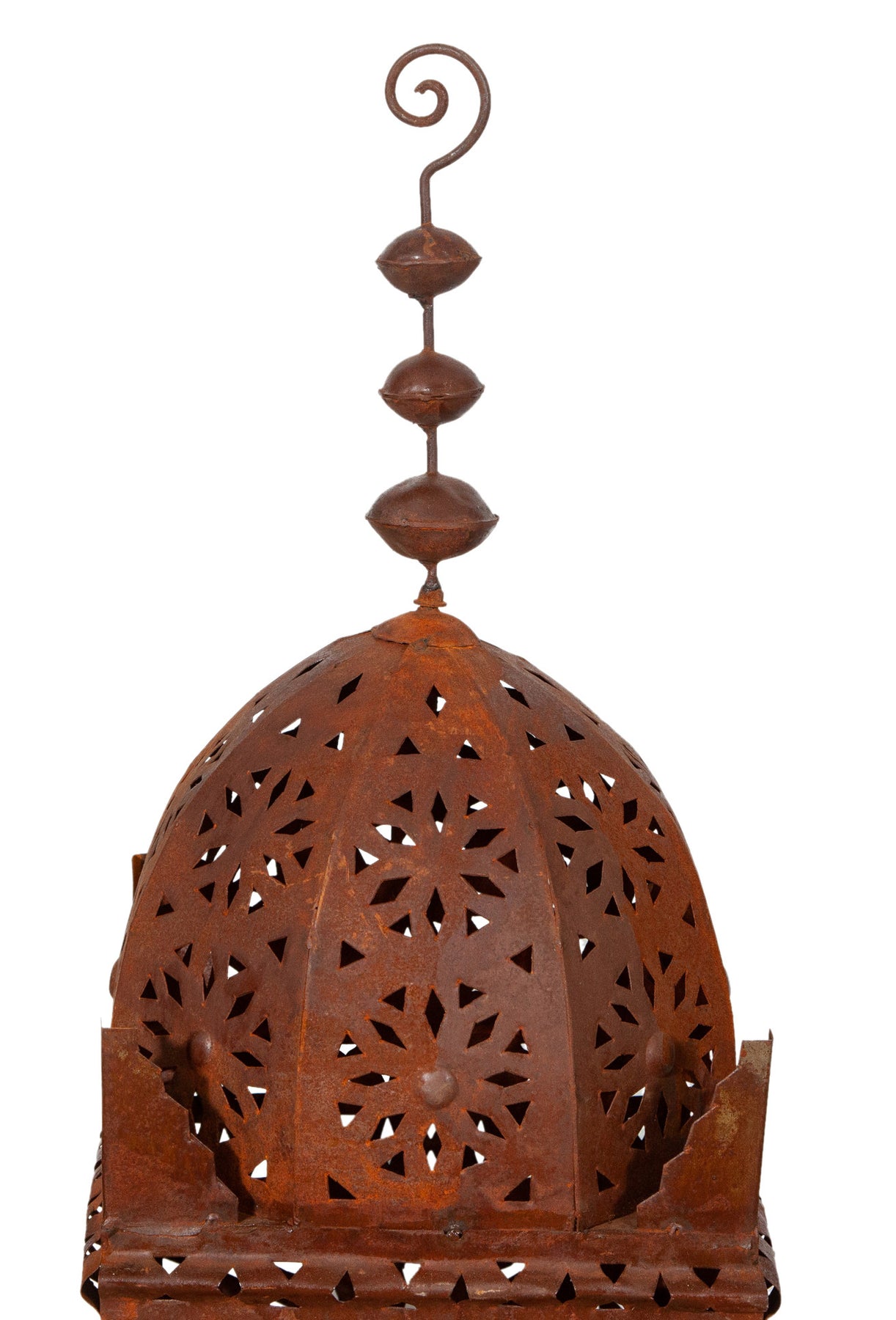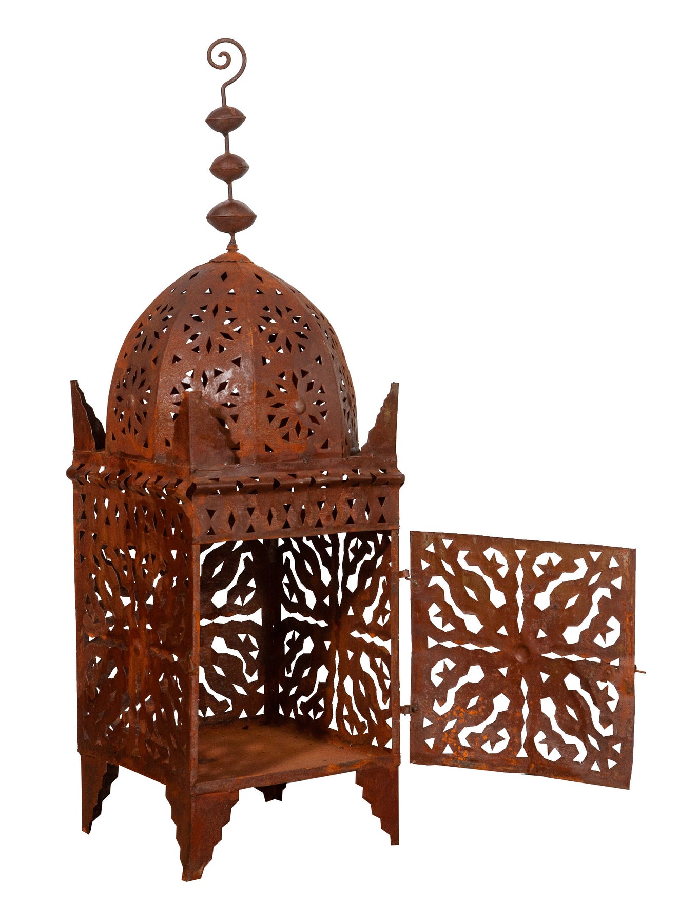 | Originale lanterna in ferro battuto traforata finitura naturale di dimensioni lunghezza 30 cm , profondità 30 cm , altezza 100 cm. Può essere utilizzata come lampada da tavolo o da terra e come porta candela ma anche come lampadario se appesa al soffitto. La struttura particolare della lanterna crea un’atmosfera suggestiva regalando alla casa e al giardino il fascino delle notti orientali, l'effetto della finitura naturale del ferro e i giochi di luce e ombra proiettano caldi riflessi nelle pareti delle vostre stanze. Sono oggetti unici e caratteristici che però si adattano a qualsiasi angolo e contesto di ogni ambiente. |
