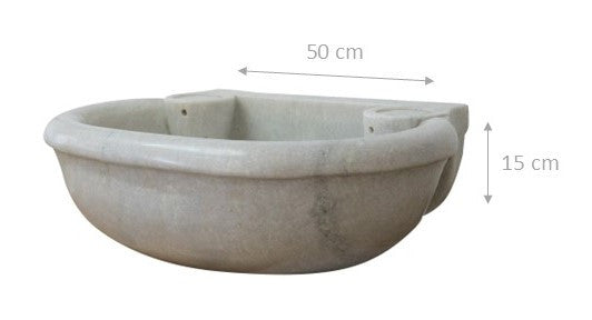 Vasca in marmo realizzata completamente a mano di dimensioni L50xPR40xH15 cm, già dotata di foro per lo scarico. Ricavata dalla lavorazione di un unico blocco di marmo, le caratteristiche sfumature e venature del materiale la rendono un pezzo unico. Ideale come lavandino da interni o lavello da esterno ma utilizzabile anche come vasca per fontane.