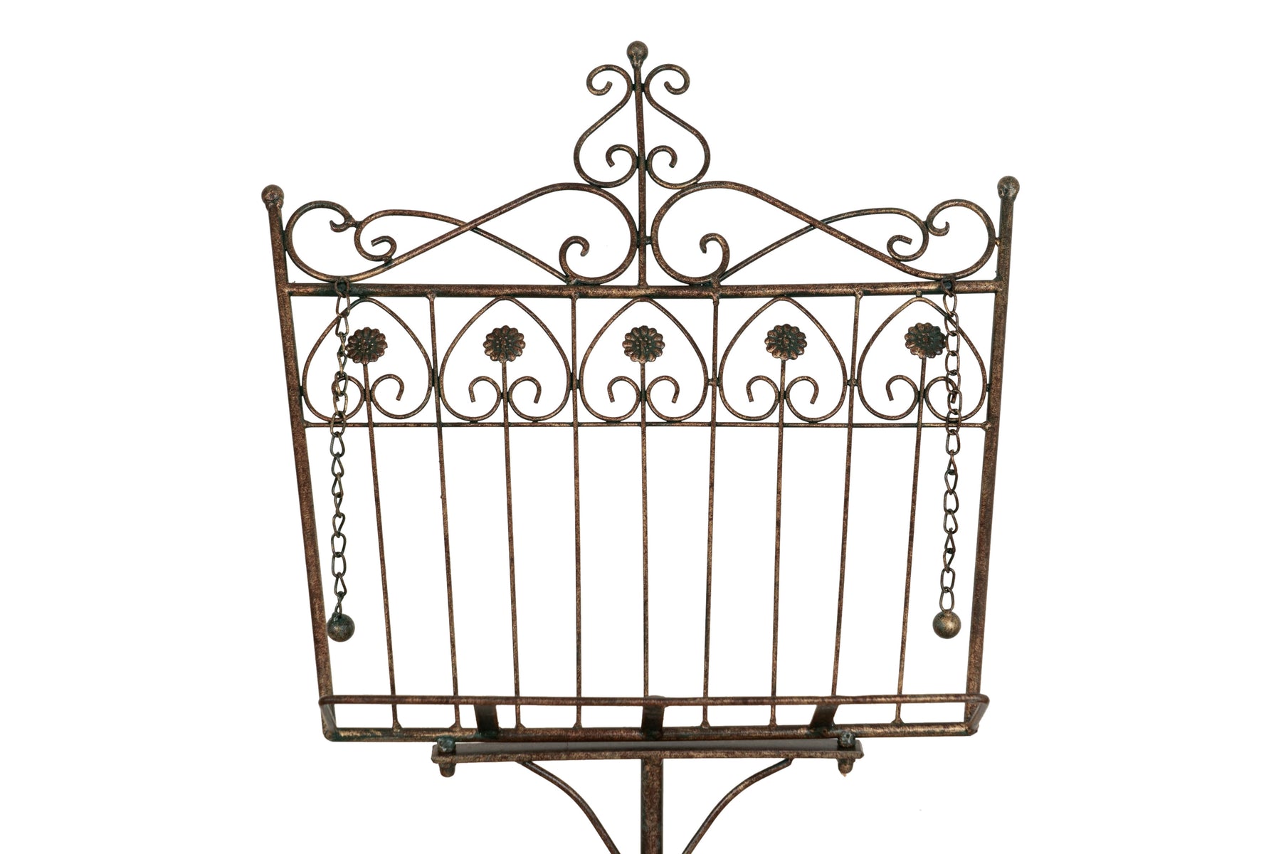 Pratico e molto stabile leggio da terra L46xPR32xH90-170 cm realizzato in ferro battuto pieno. Regolabile in altezza da un minimo di 90 cm ad un massimo di 170 cm (misure riferite al massimo ingombro dell'articolo), rappresenta un complemento di arredo versatile ed elegante. Molto indicato anche come porta menù per ristoranti trattorie.
