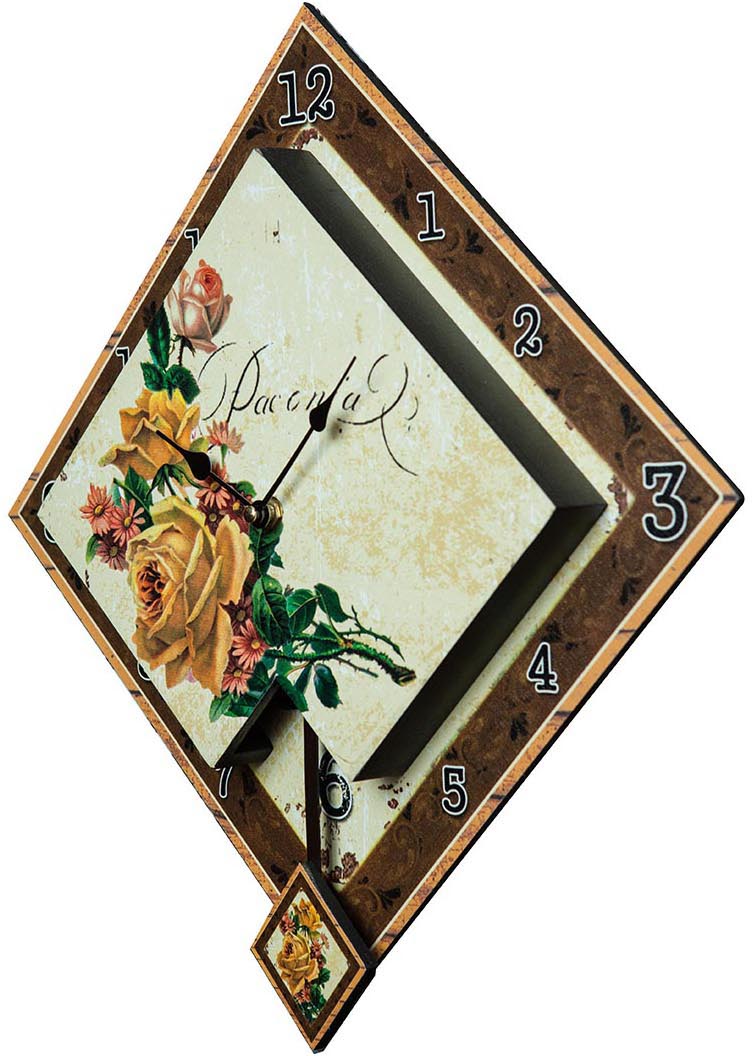Orologio pendolo da appendere con meccanismo a batteria realizzato su base legno (mdf). Misura: L30xPR5,5xH30 cm.