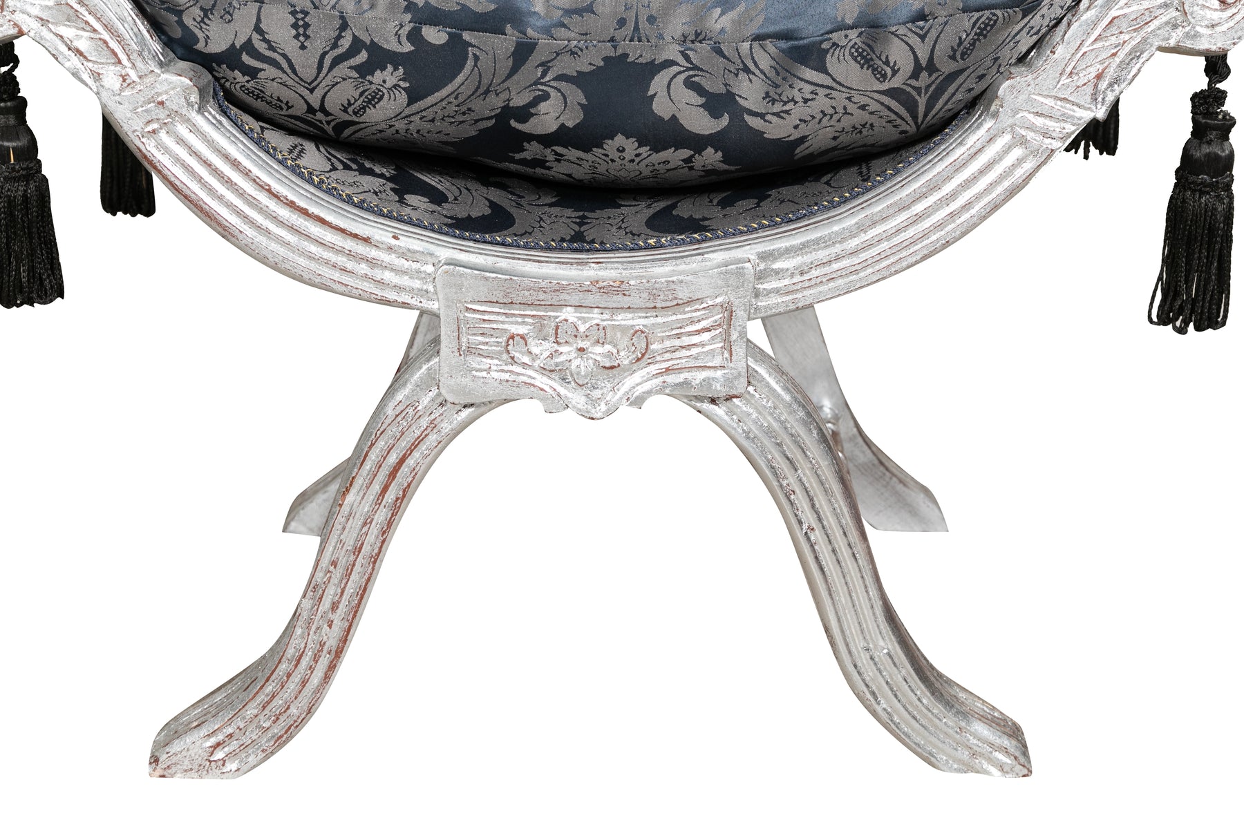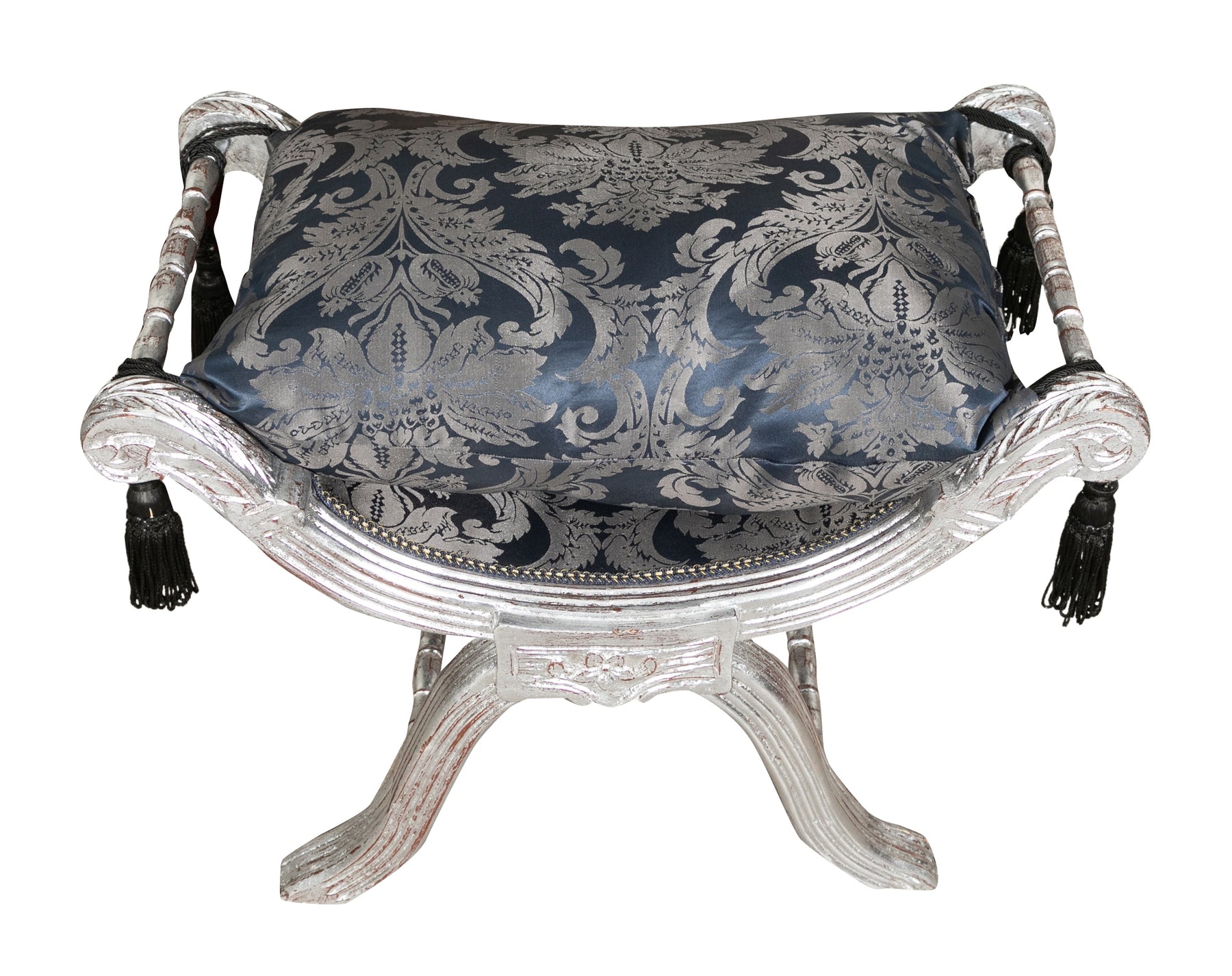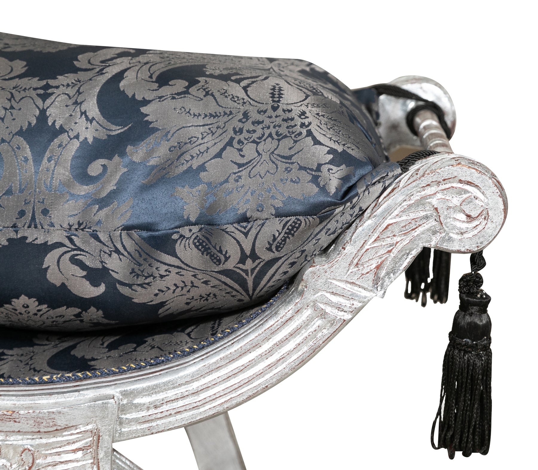 Panchetta faldistorio stile francese Luigi XVI, in legno massello di faggio, intagliata e finita a mano con patina in foglia argento anticato di dimensioni larghezza 46 cm, profondità 74 cm, altezza 54 cm. Seduta imbottita artigianalmente.