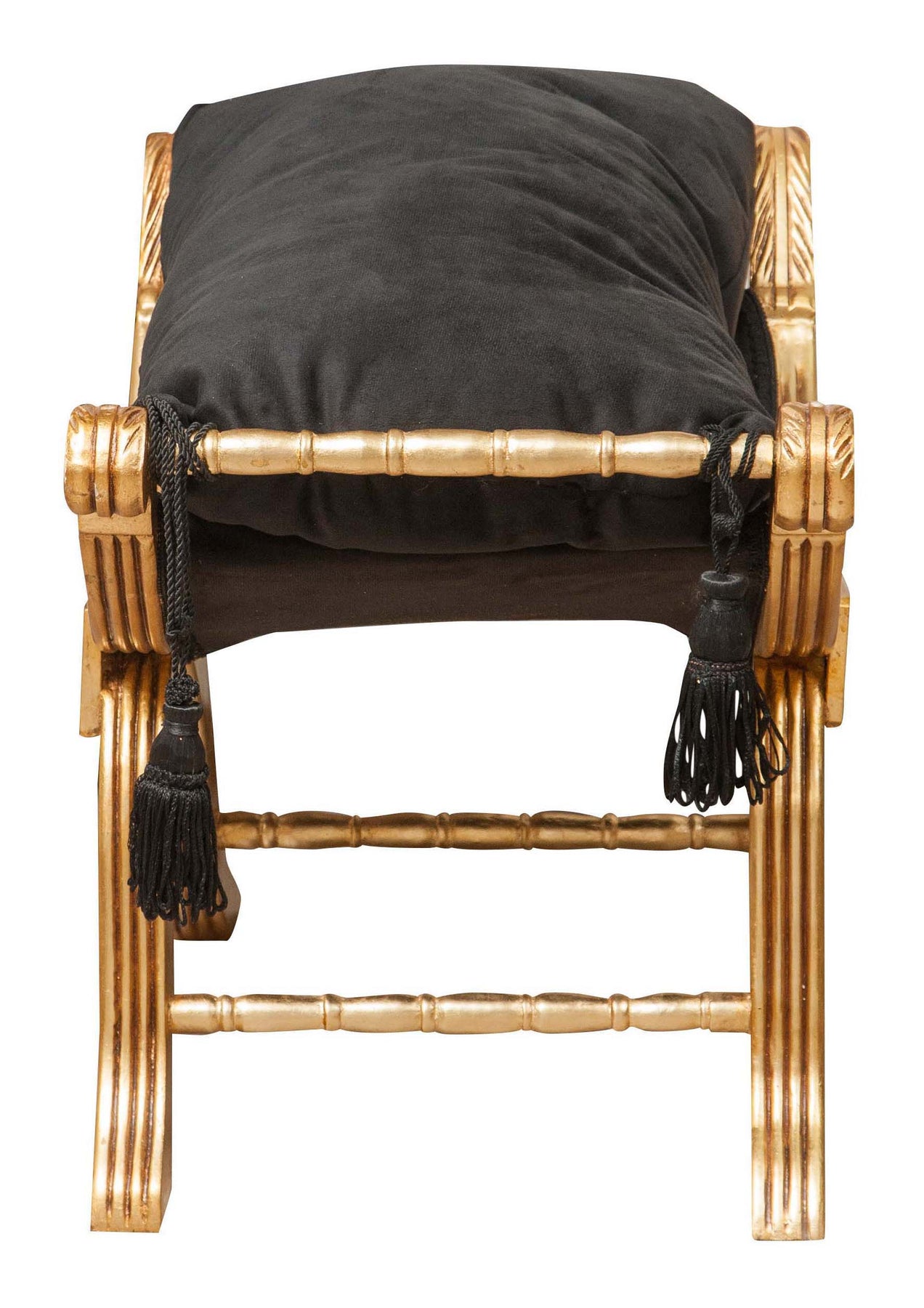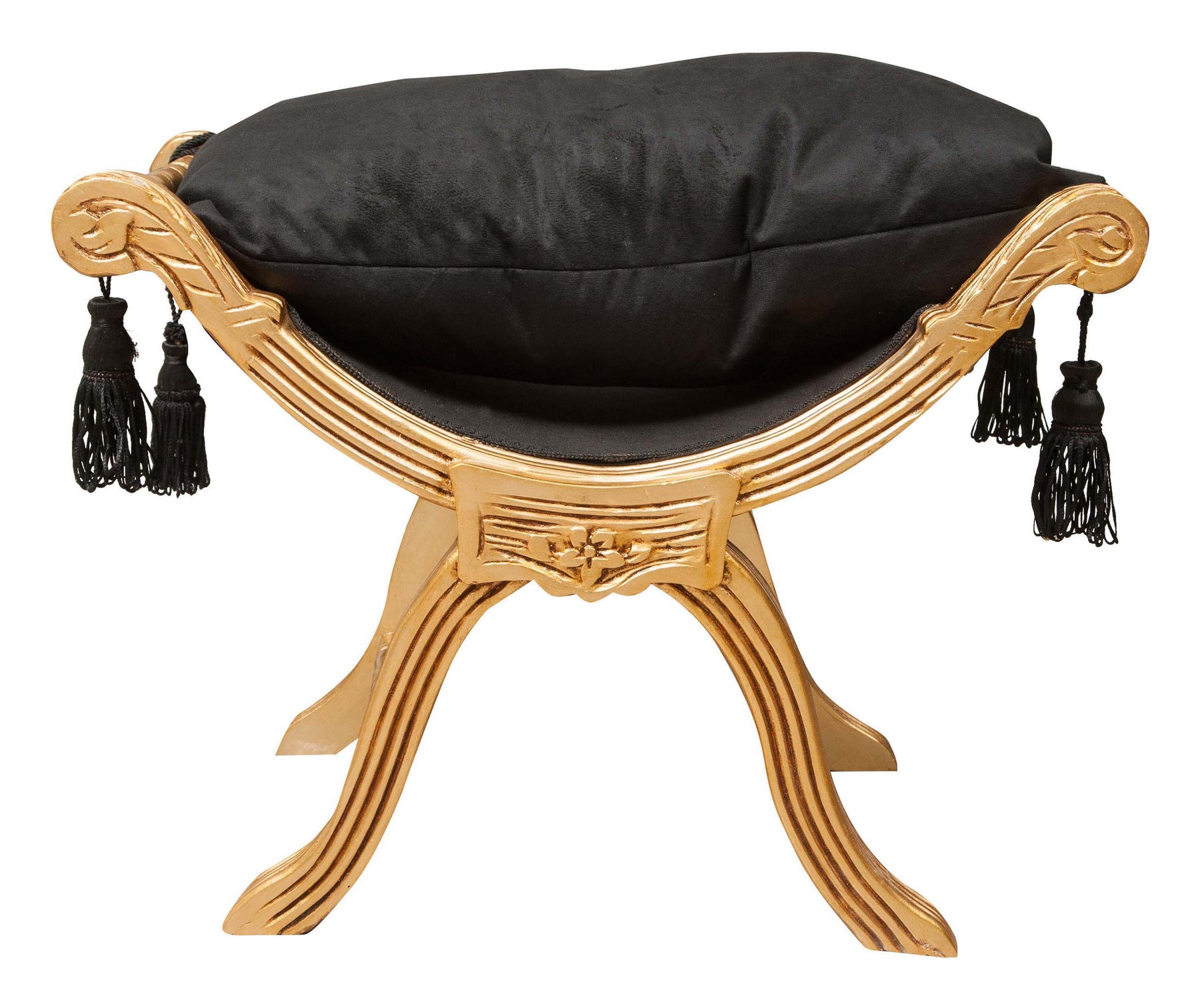 Panchetta faldistorio stile francese Luigi XVI, in legno massello di faggio, intagliata e finita a mano con patina in foglia oro di dimensioni larghezza 74 cm, profondità 46 cm, altezza 54 cm. Seduta imbottita artigianalmente.