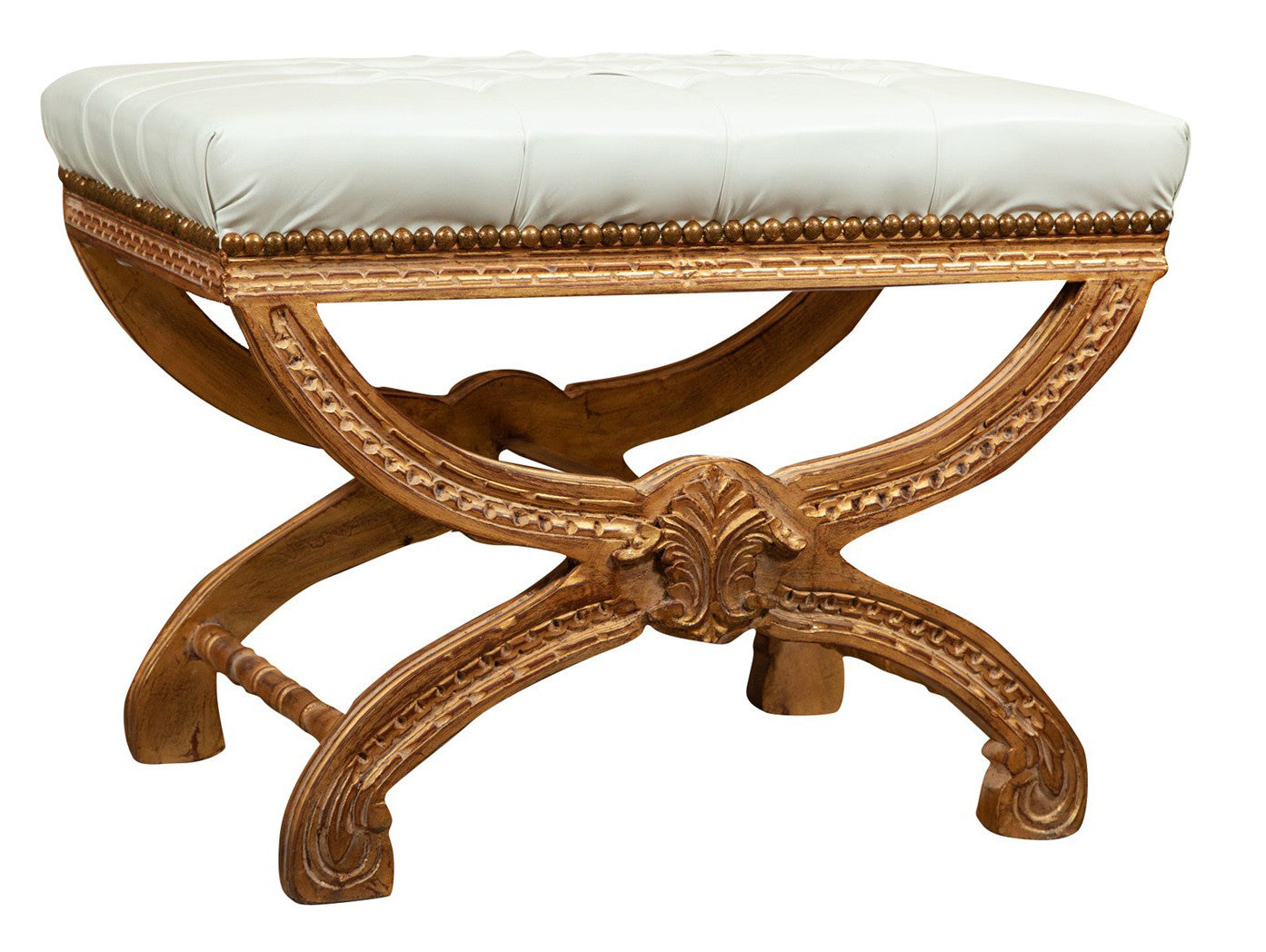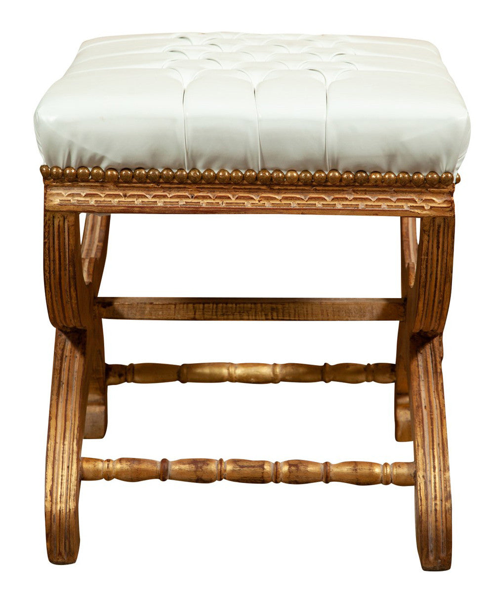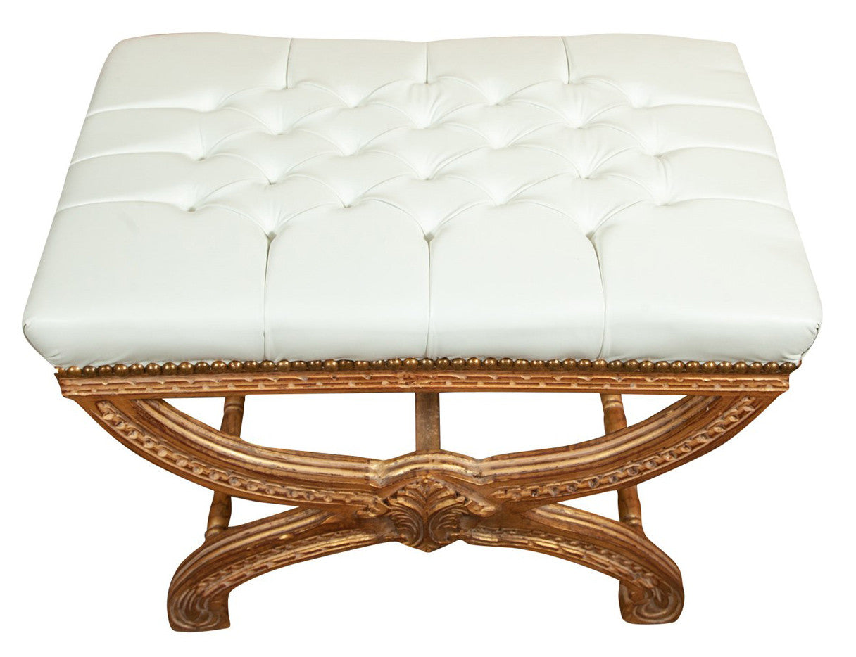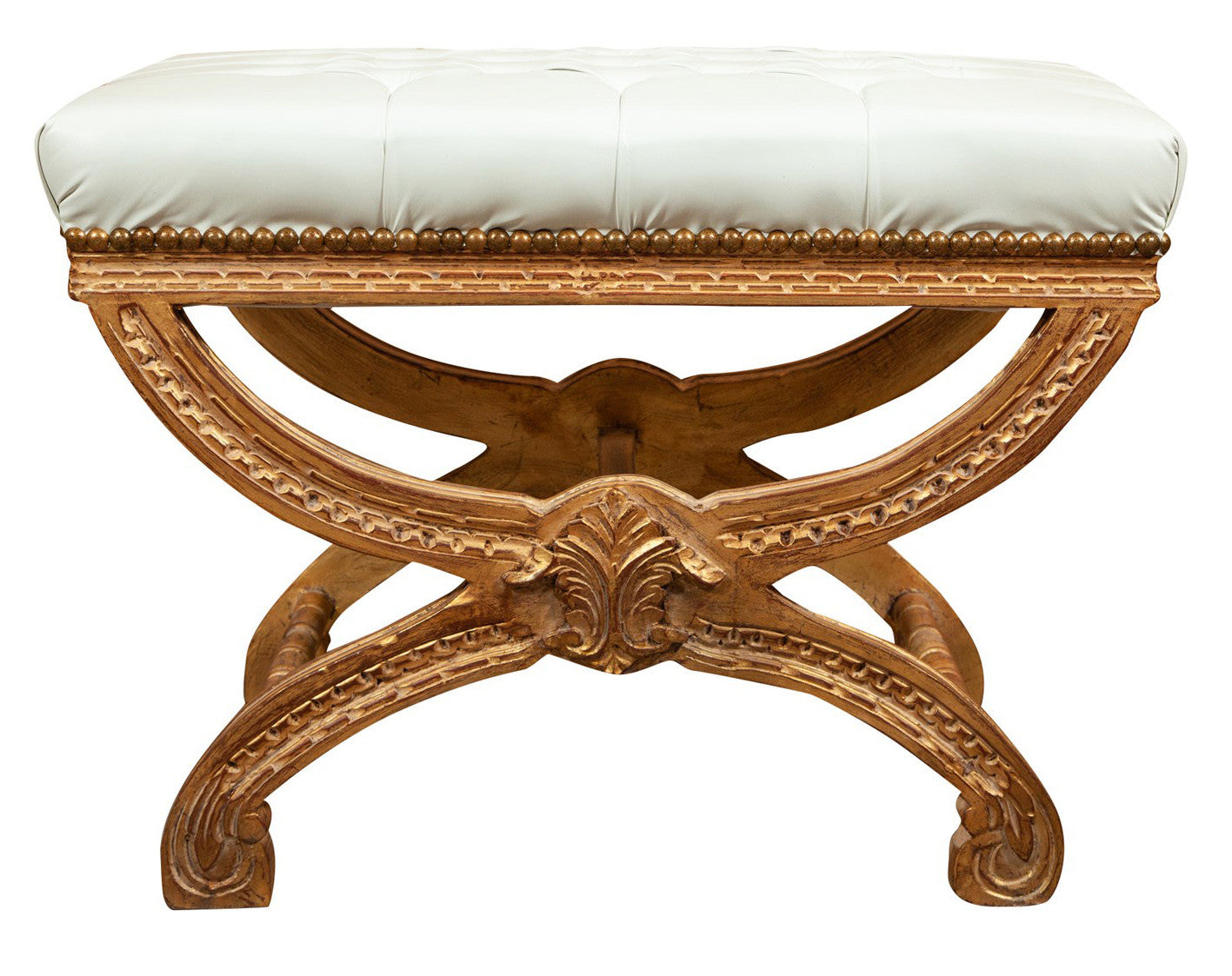 | Panchetta stile francese Luigi XVI, in legno massello di faggio, intagliata e finita a mano con patina in oro e seduta bianca di dimensioni larghezza 46 cm, profondità 56 cm, altezza 70 cm. Seduta imbottita artigianalmente. Tutte le misure si riferiscono all'ingombro massimo dell'articolo. |