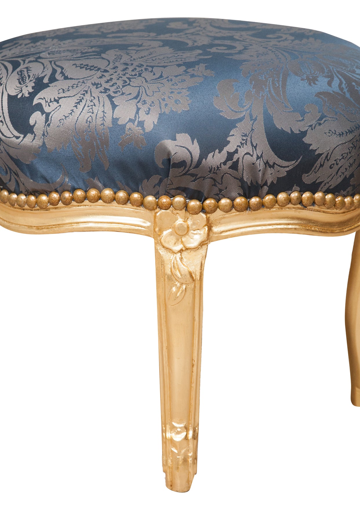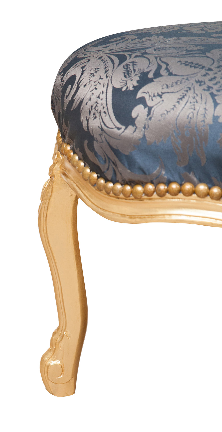 Panchetto poggiapiedi stile francese Luigi XVI, in legno massello di faggio, intagliata e finita a mano con patina in foglia oro di dimensioni larghezza 47 cm, profondità 47 cm, altezza 42 cm. Seduta imbottita artigianalmente.