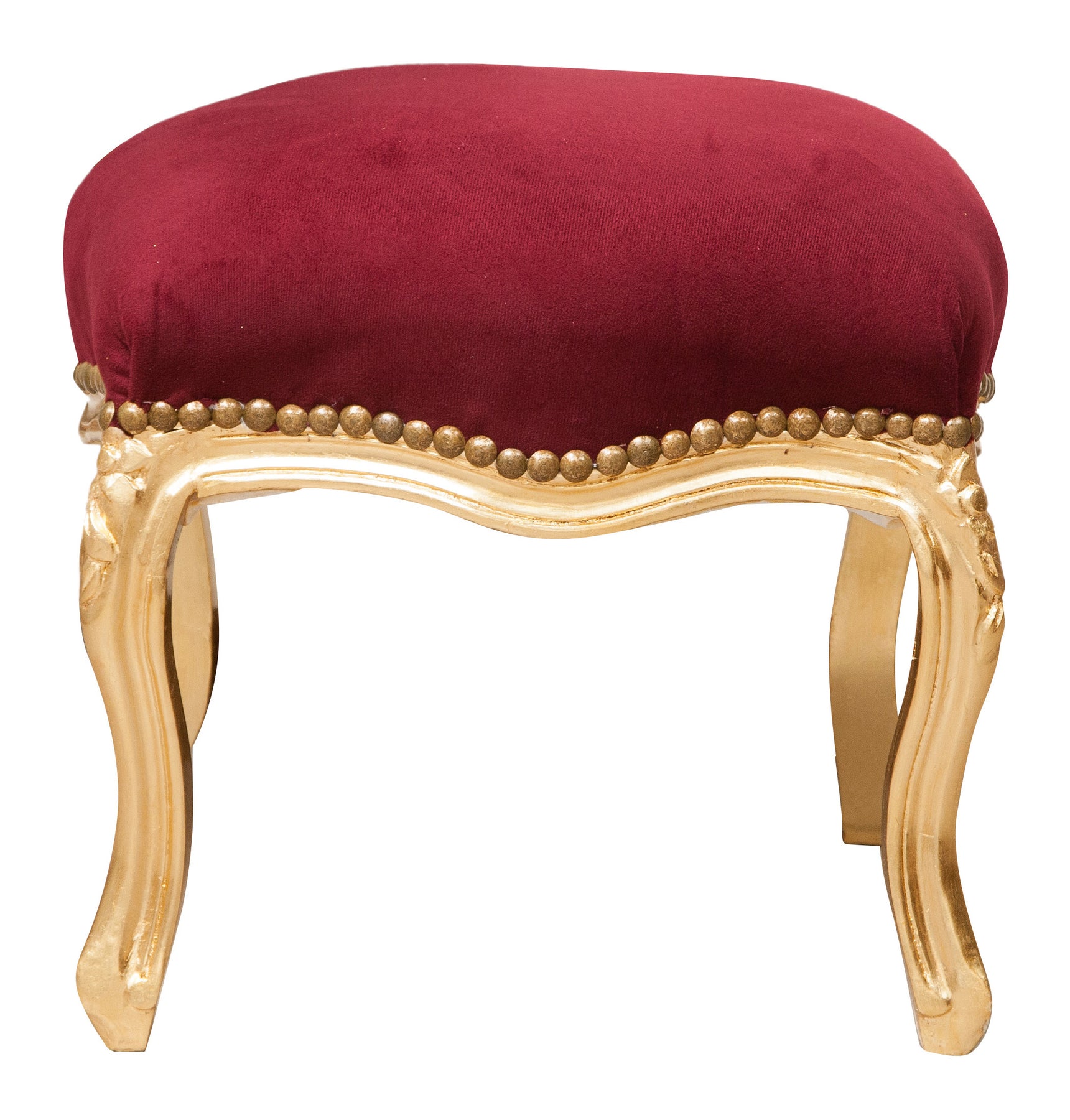 Panchetto poggiapiedi stile francese Luigi XVI, in legno massello di faggio, intagliato e finita a mano con patina in foglia oro di dimensioni larghezza 42 cm, profondità 42 cm e altezza 42 cm. Seduta imbottita artigianalmente.