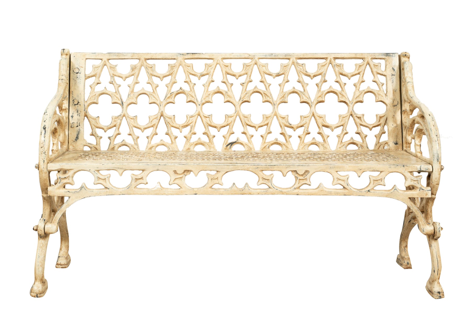 Molto Robusta, stabile e pesante panca realizzata in fusione di ghisa di dimensioni larghezza 130 cm, profondità 47 cm, altezza 79 cm,  con un'accurata finitura completamente realizzata a mano, ottenendo un vero effetto antico. Minuziosamente lavorata, replica il design delle antiche panchine del 1800 inglese e francese. Arreda con eleganza qualsiasi ambiente interno ed esterno. Tutte le misure si riferiscono all'ingombro massimo dell'articolo.