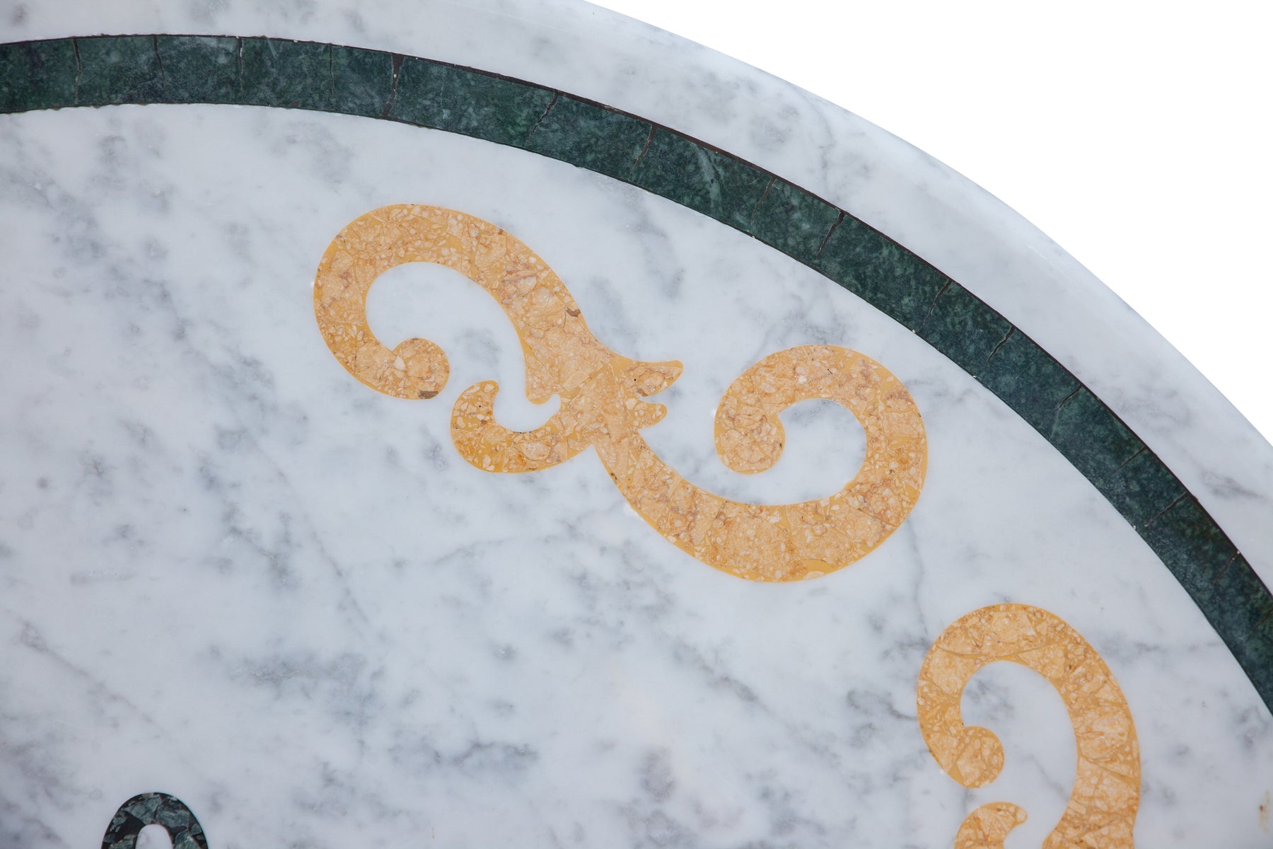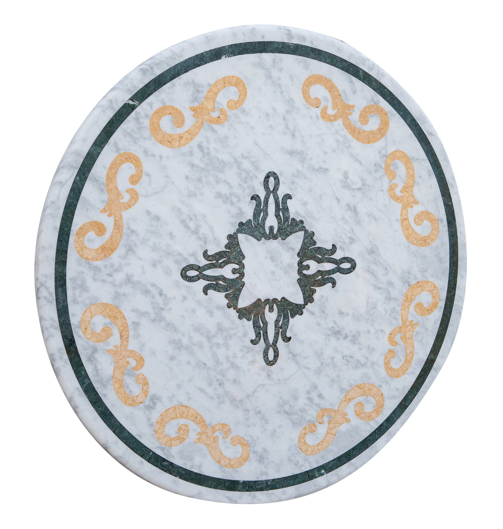 | Piano tavolo rotondo in marmo di Carrara di dimensioni 130x130 cm e spessore 3 cm. Decorato con veri intarsi di tipi di più marmi e sfumature di colore. Questo piano, molto robusto e stabile, è ideale per molte funzioni, sia per interni che per esterni. È di facile inserimento in giardini, parchi ecc.., indistruttibile agli agenti atmosferici. Di facile inserimento da una semplice abitazione per arrivare fino ad uffici, sale riunioni, ristoranti, alberghi e qualsiasi altro locale pubblico e non. Ogni oggetto è identico nelle proprie forme geometriche e decoro, ma all'interno di esse possono variare i colori da rendere ogni articolo un pezzo unico. |